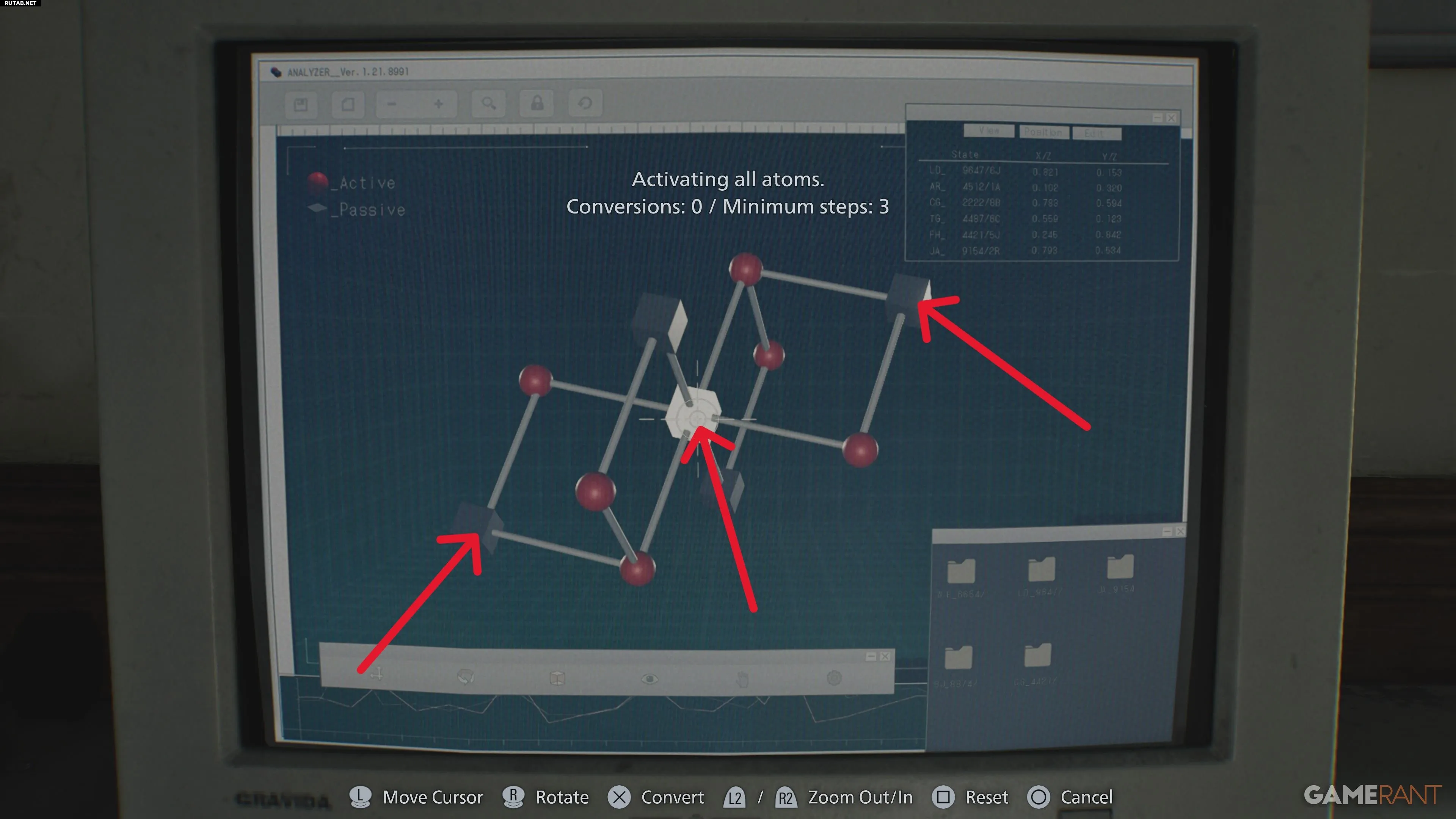 У микроскопа взаимодействуйте с анализатором и выберите Отрубленную руку из инвентаря. Это запустит головоломку с атомами, где нужно выбрать самую левую, среднюю и самую правую точки.