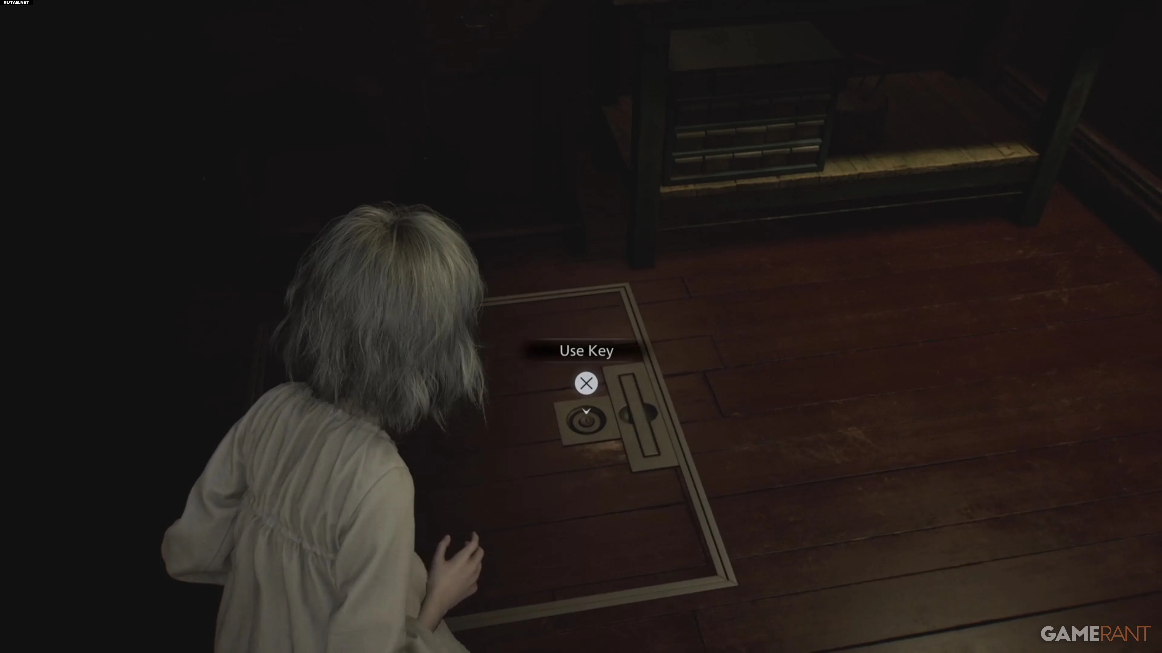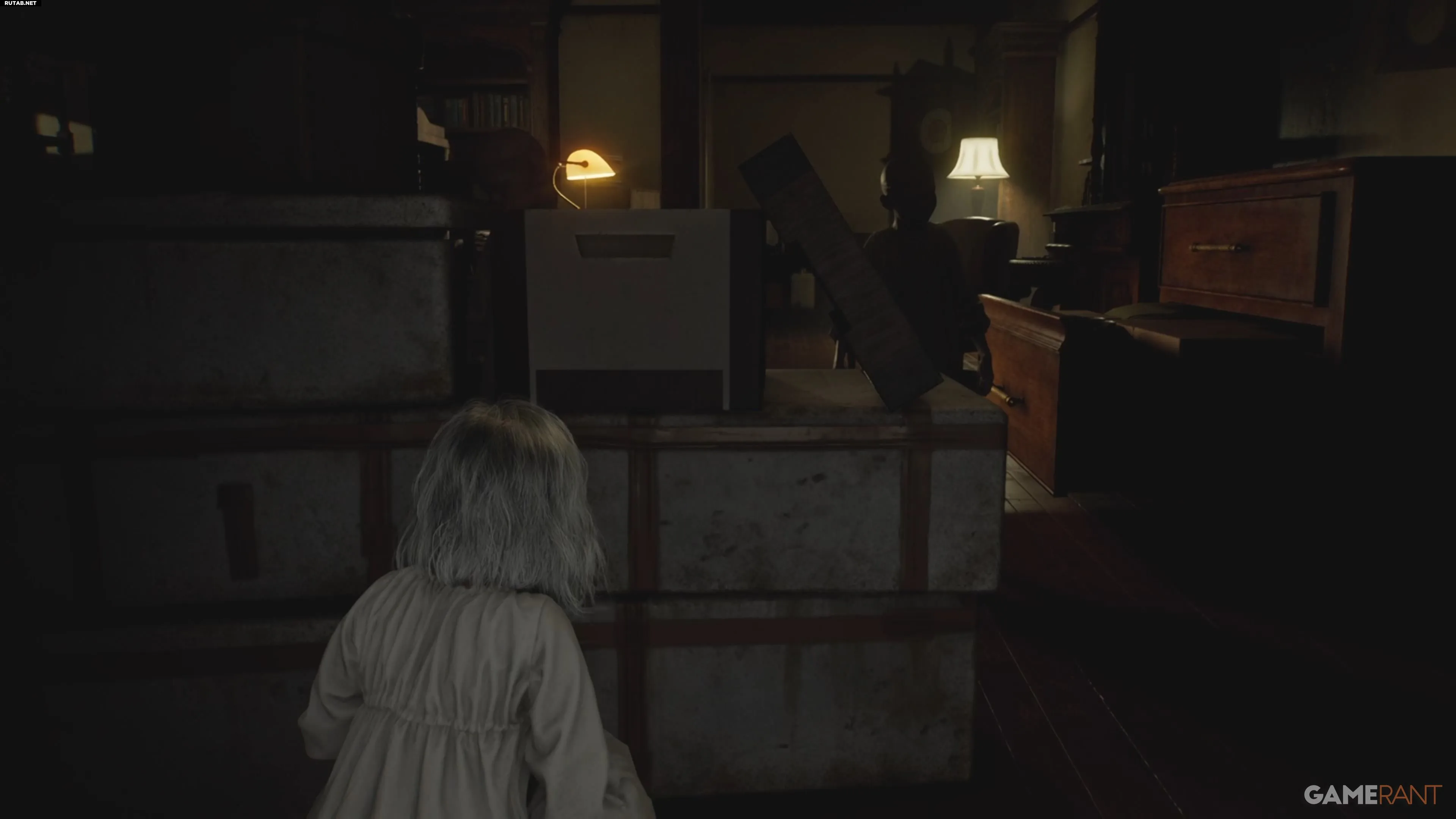В кабинете найдите настольную лампу справа, включите её и заберитесь на комод напротив, чтобы взять Ключ от люка. При спуске вы упадёте и привлечёте внимание. Схватите ключ и сразу же спрячьтесь за белыми коробками справа от комода.
