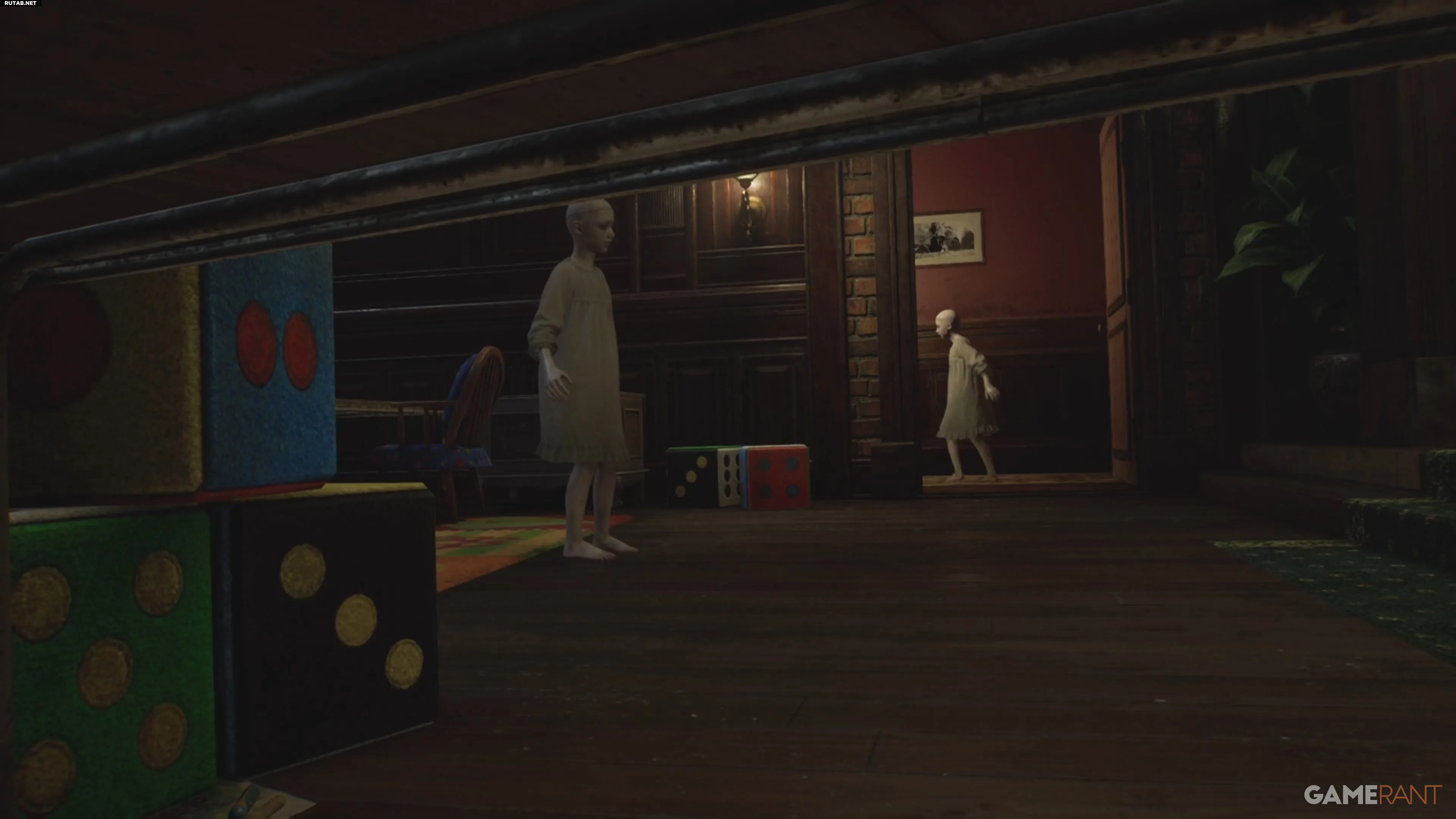 После их ухода вернитесь в ясли с мёртвыми учёными. Проползите через игровую конструкцию и спуститесь в главный зал. Тут же поверните направо, найдите журнальный столик и спрячьтесь под ним. Дети спрыгнут с лестницы, но вам нужно оставаться на месте. Когда один из них откроет дверь напротив и путь будет свободен, пройдите через неё.