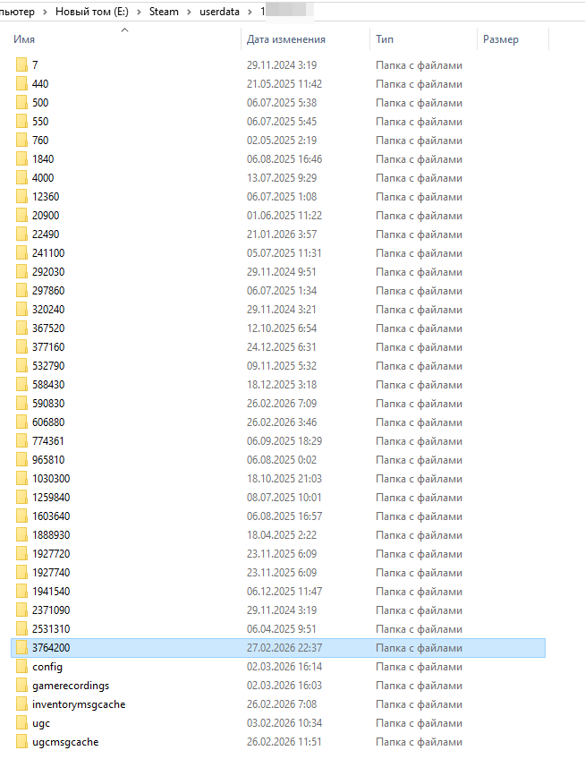 - Откройте папку «Userdata». Внутри будут папки с цифровыми названиями — это идентификаторы аккаунтов Steam, которые использовались на этом ПК.