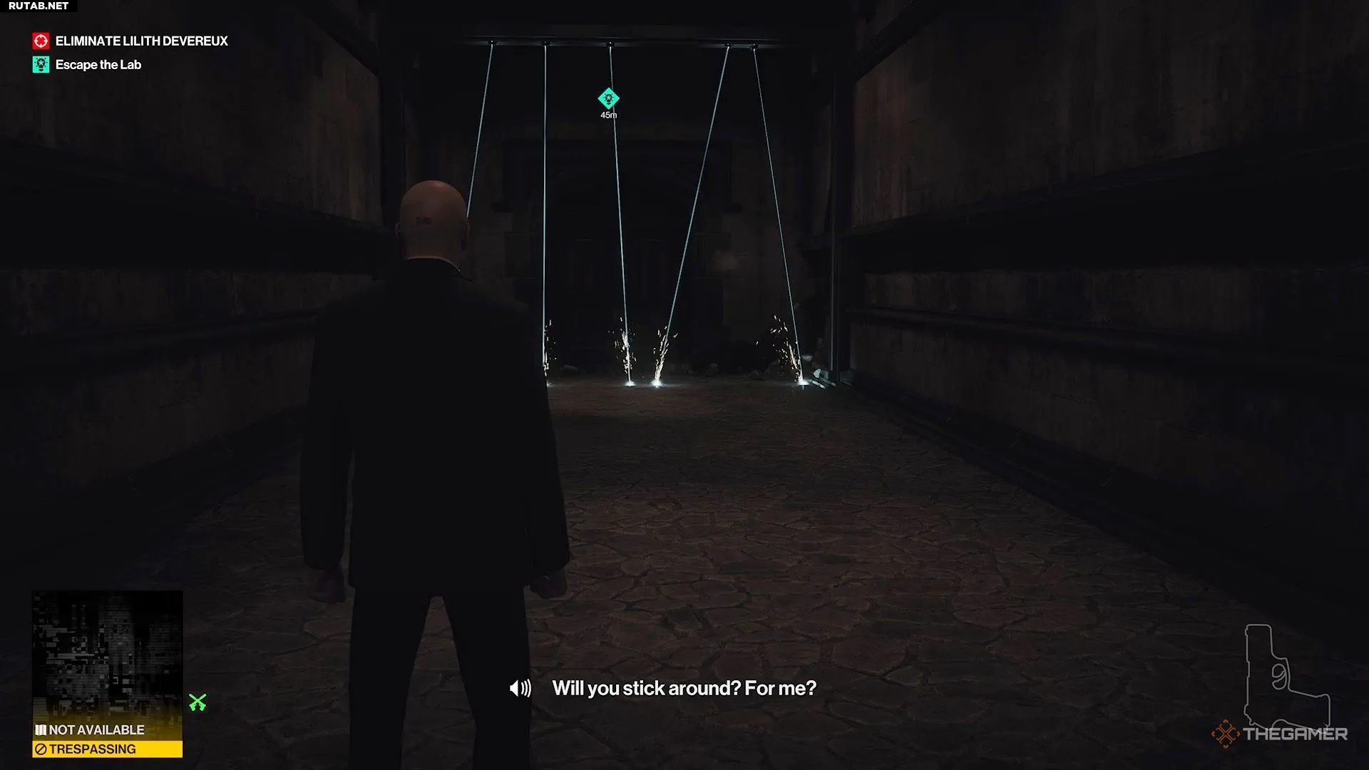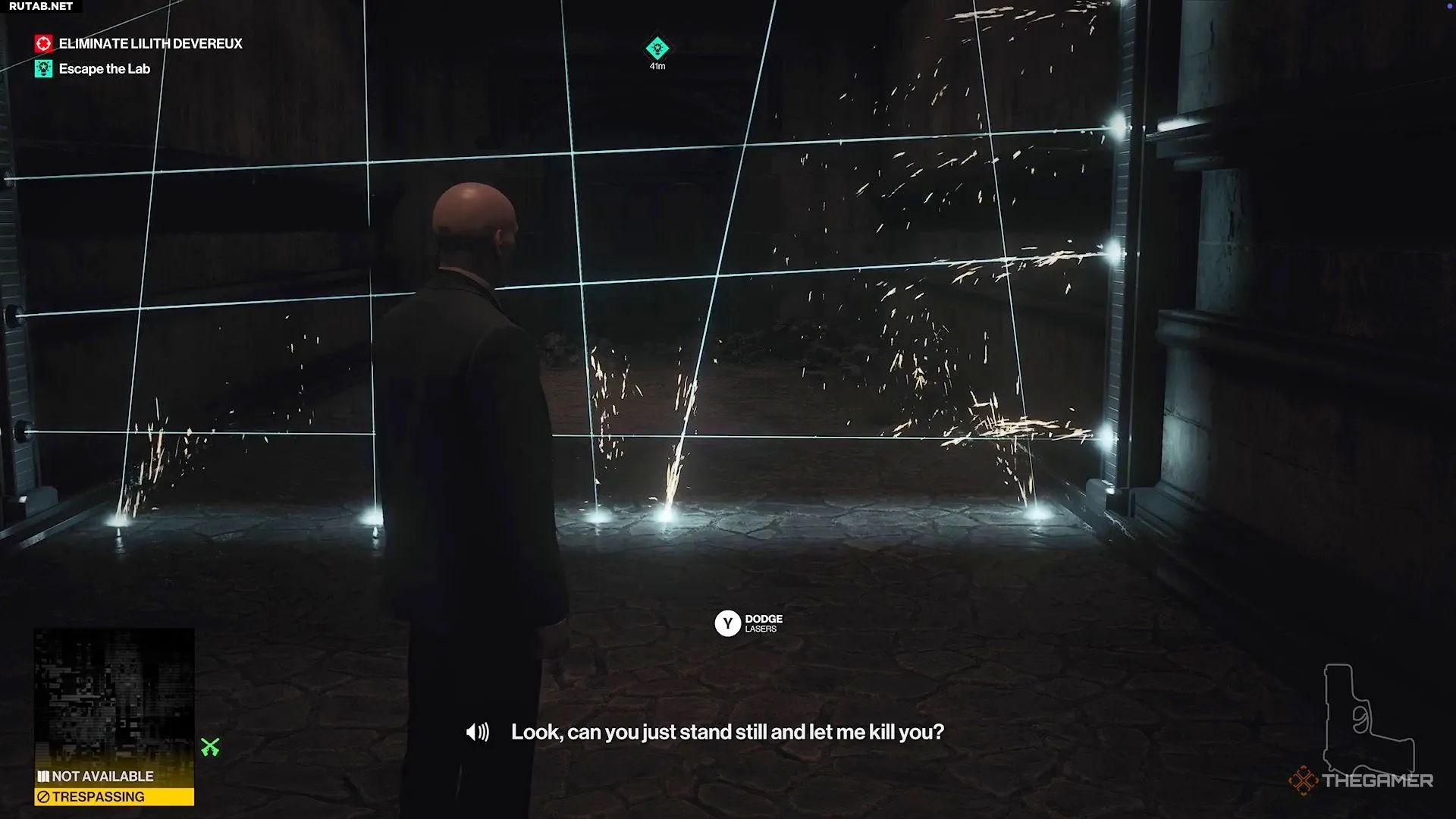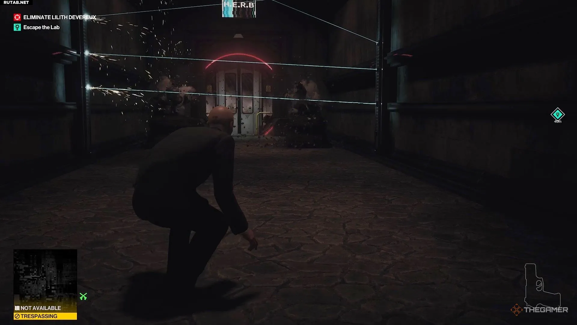 После того как вы покинете основную зону лаборатории, вам предстоит избежать лазерных ловушек. В первом ряду есть большие промежутки, в которых можно стоять. Чтобы пройти второй ряд, просто пригнитесь. Для последнего ряда нажмите кнопку на экране, чтобы 47 эффектно увернулся.