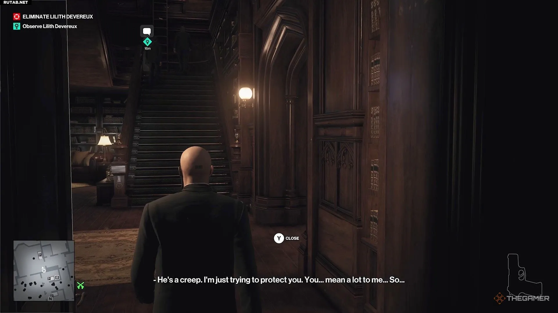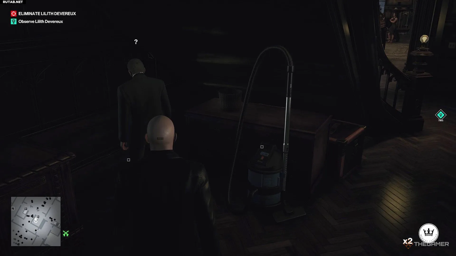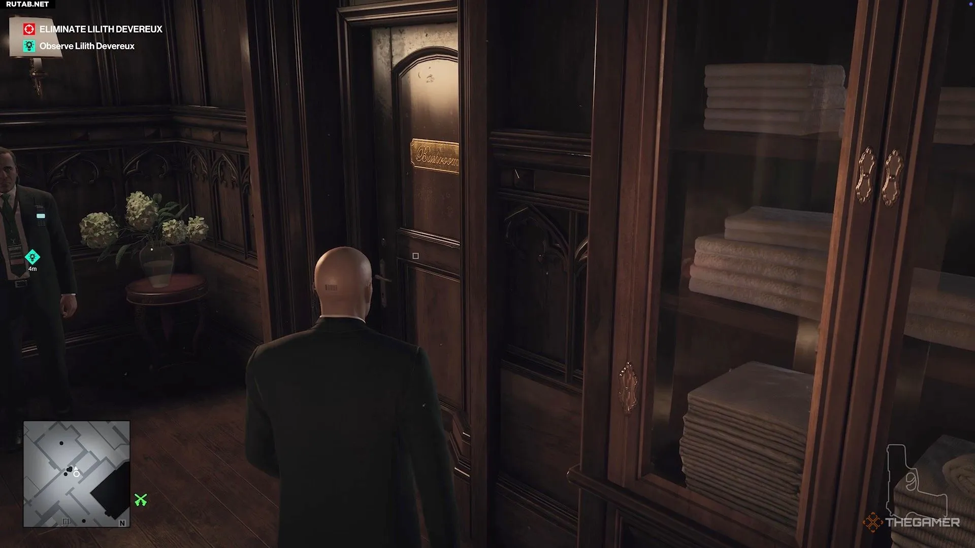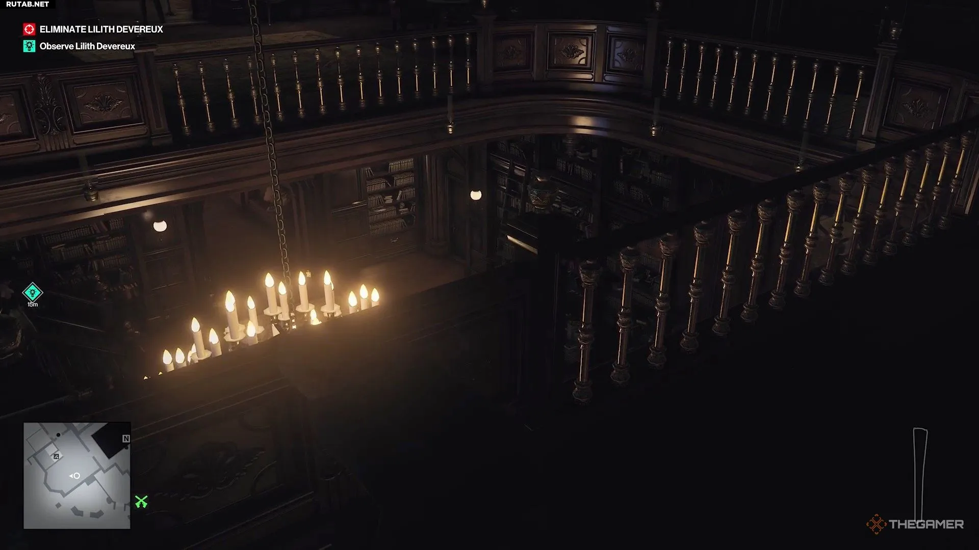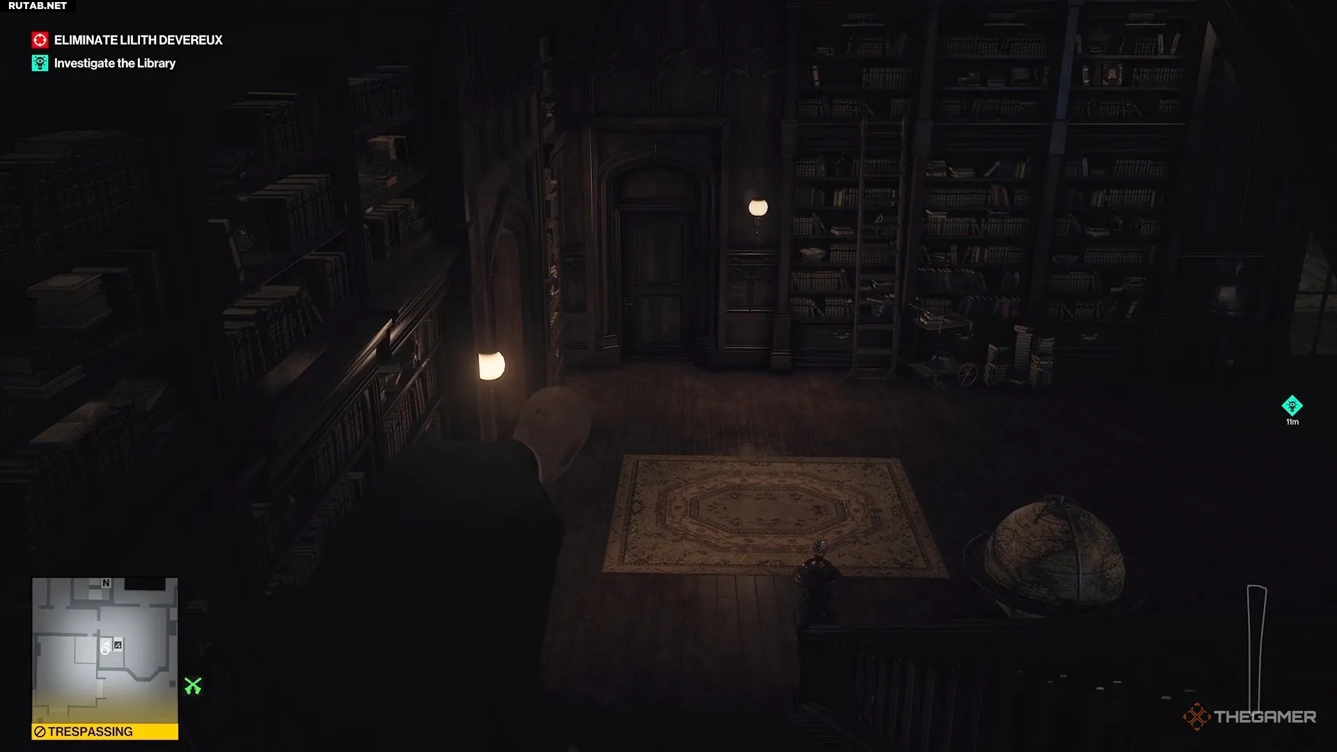Схватить его может быть непросто, особенно если рядом с ванной комнатой у библиотеки кто-то есть. Однако, если дождаться, когда цель направится в сторону ванной, можно бросить монету к диванам возле лестницы.