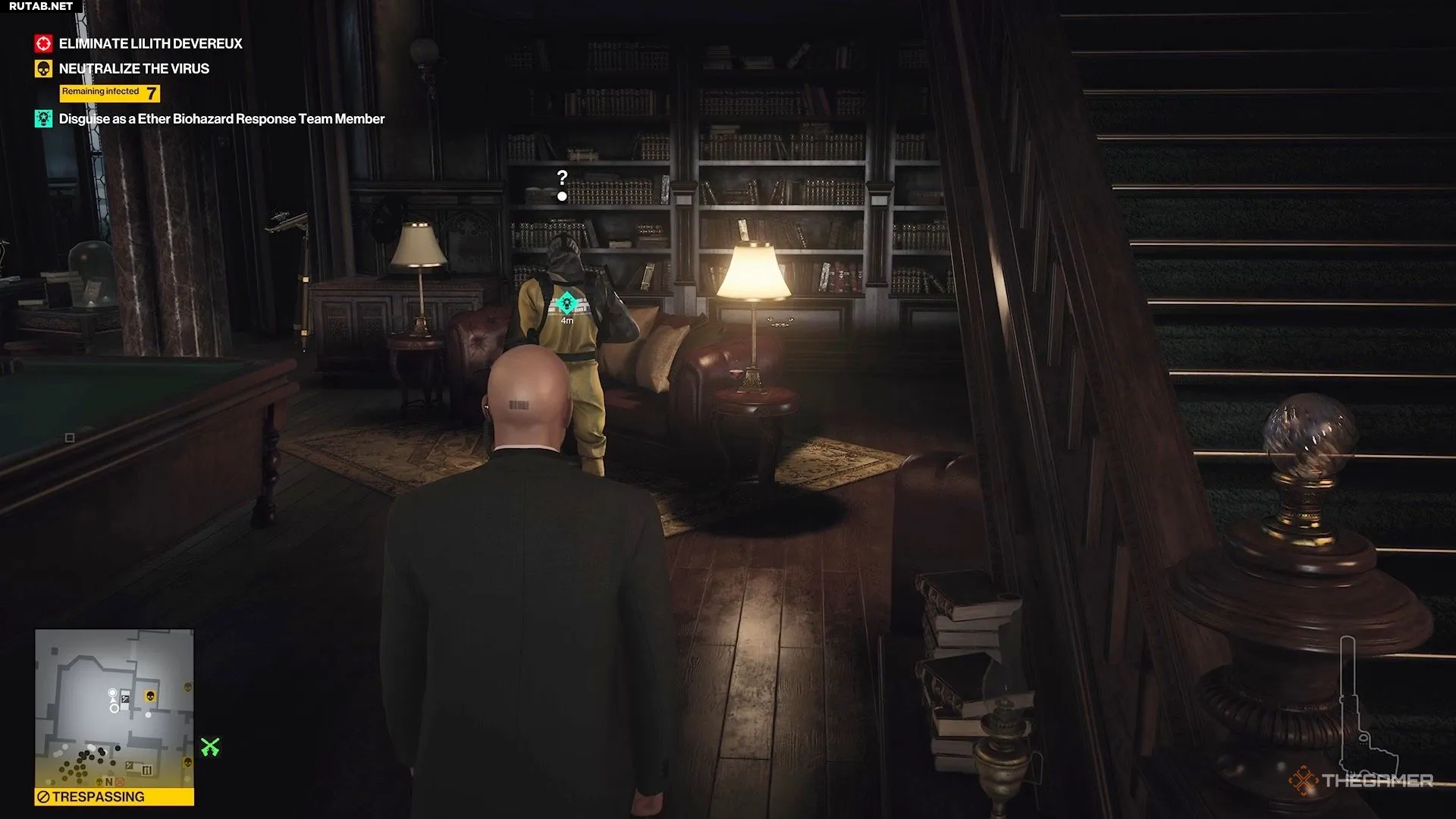 Чтобы использовать данные, вам сначала нужно раздобыть маскировку члена команды биологической защиты. Для этого вернитесь в библиотеку и найдите там человека в нужной форме.