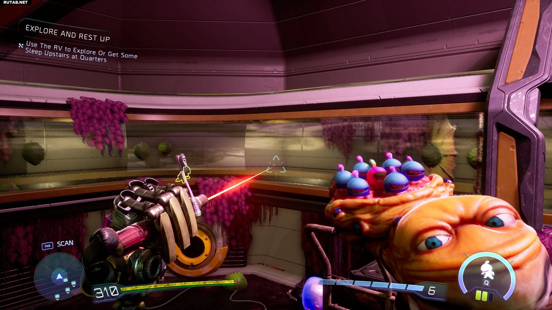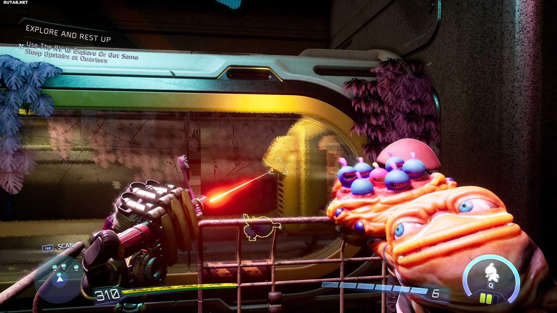 Теперь переключитесь на Свизи и используйте ее заряженный выстрел, чтобы выстрелить через стекло и попасть в растительные бутоны по ту сторону. Затем снова возьмите Кричера и с помощью его лазерной указки направляйте ребенка по трубе вправо (если смотреть на него). Продолжайте чередовать Гатлианов: направляйте ребенка как Кричер и стреляйте в бутоны как Свизи, пока ребенок не пройдет весь путь по трубе.