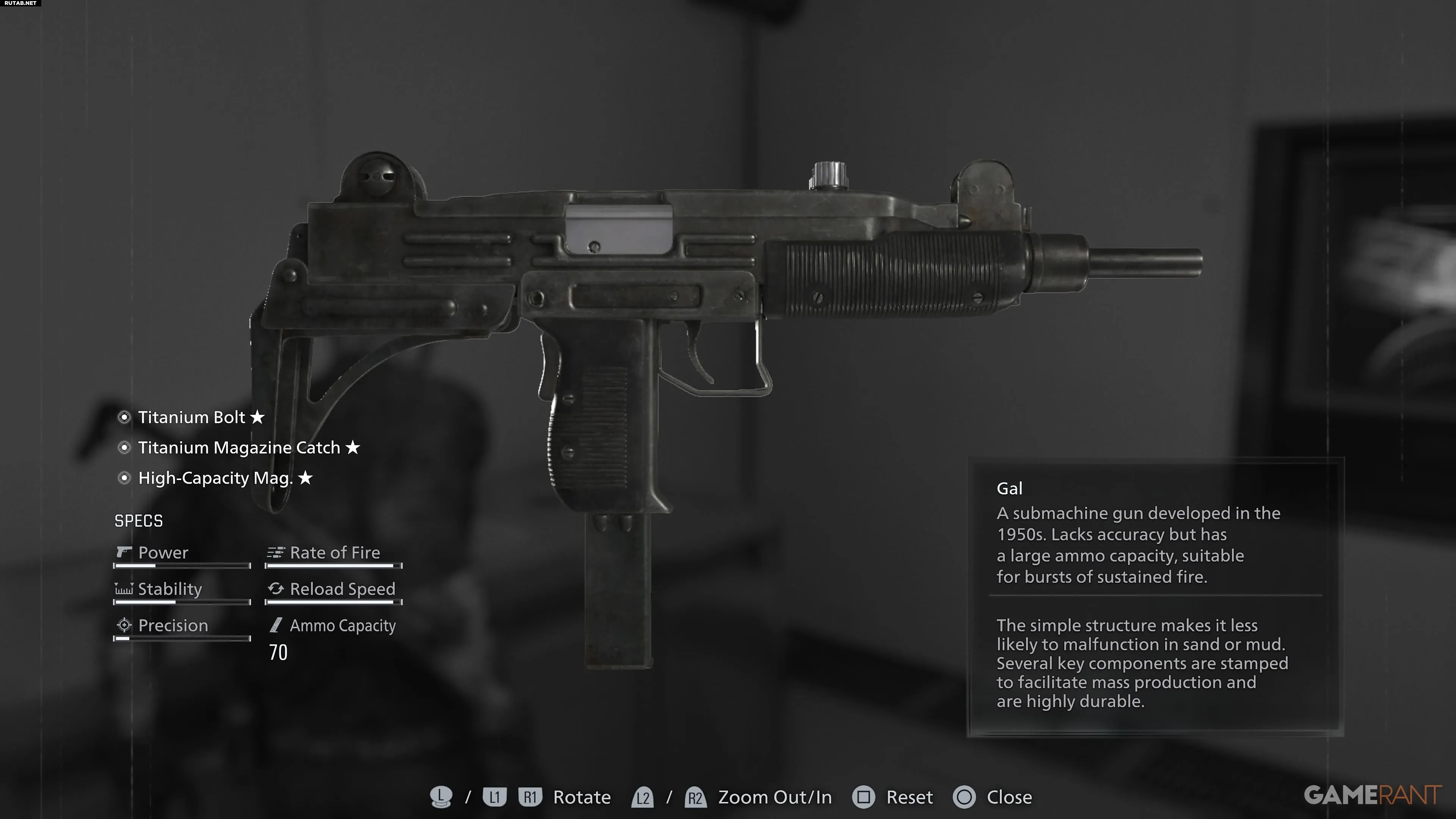 Пистолет-пулемёт Gal можно найти в подземном паркинге в Восточном Раккун-Сити, на северо-западе в затопленной зоне, где находится первая батарея.