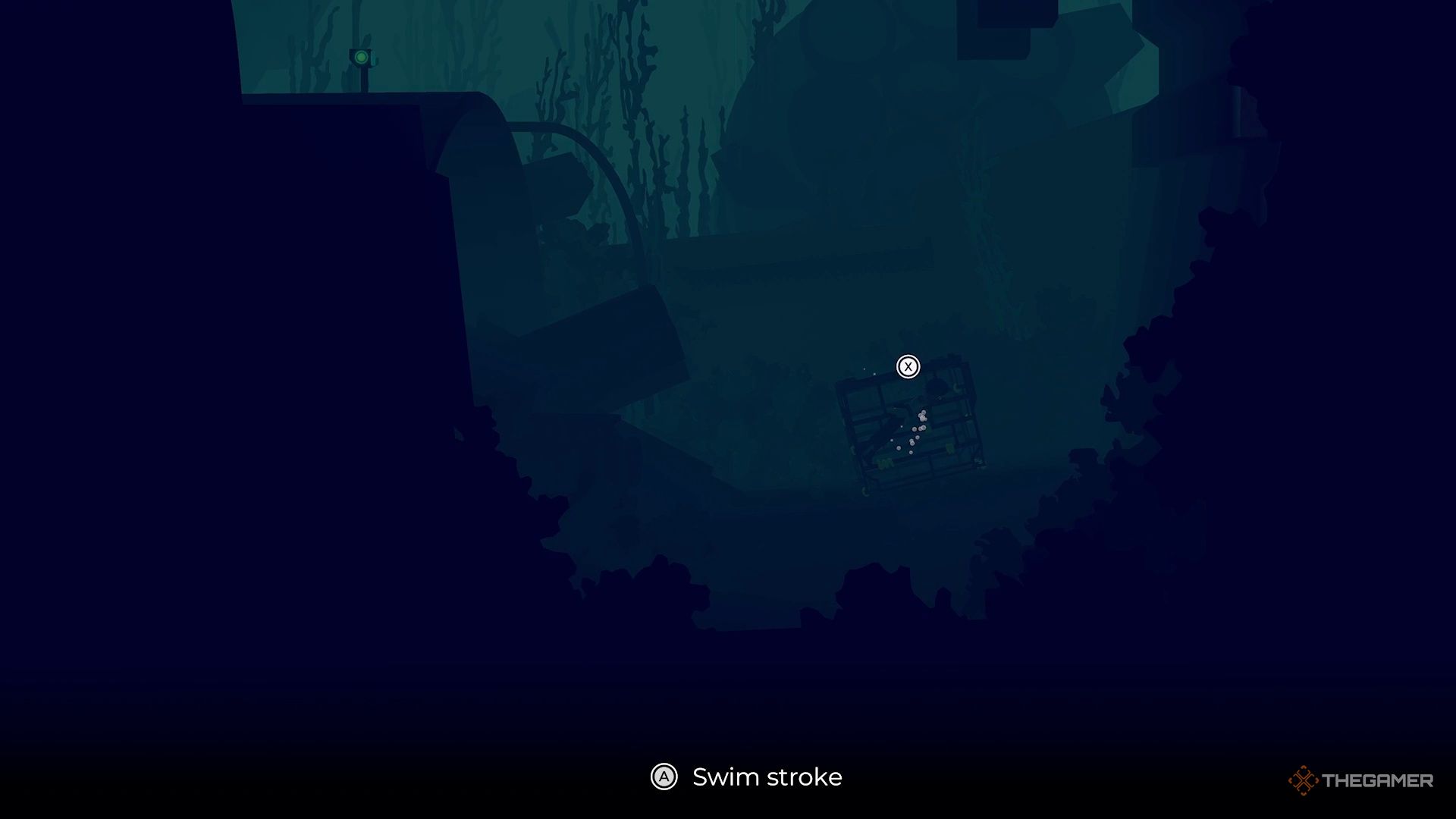 Чтобы этого избежать, проплывите ещё правее, чтобы найти небольшую клетку. Возьмите её и вернитесь с ней к кнопке.