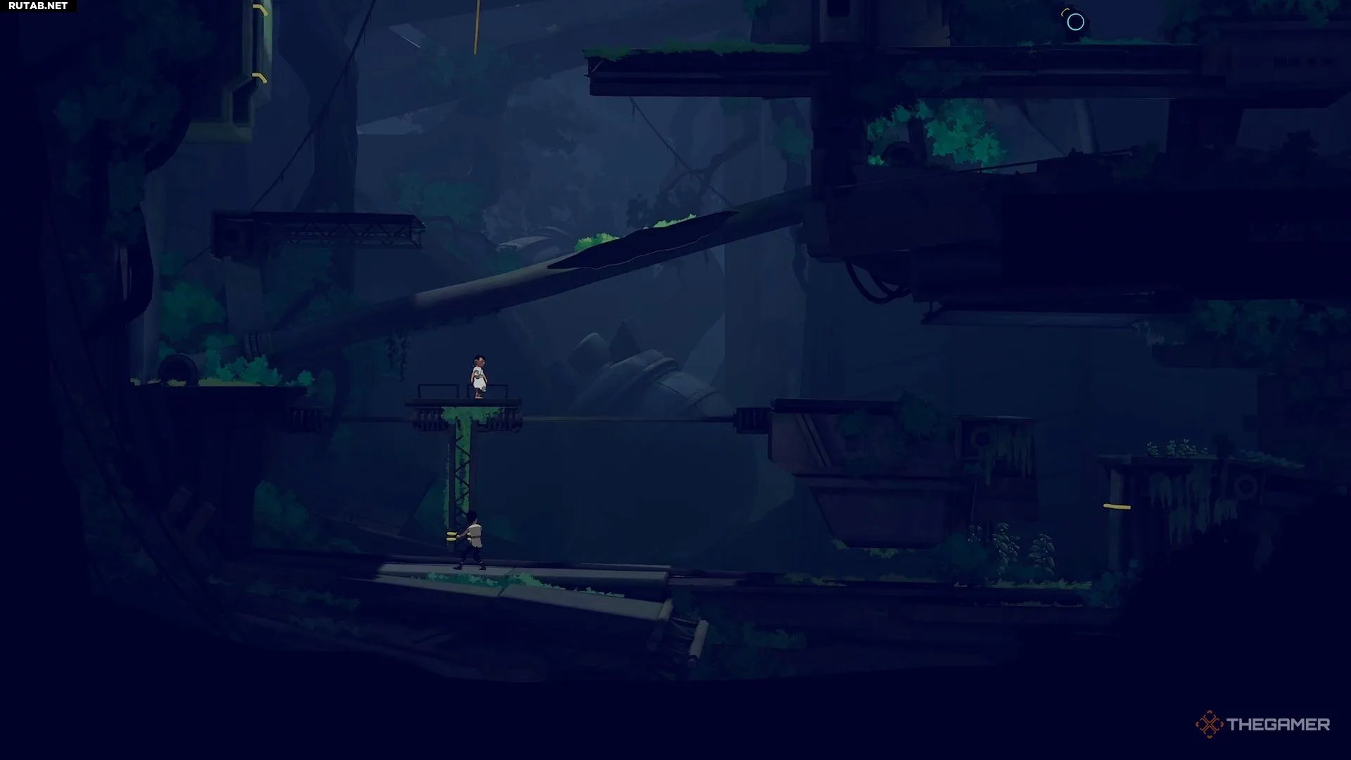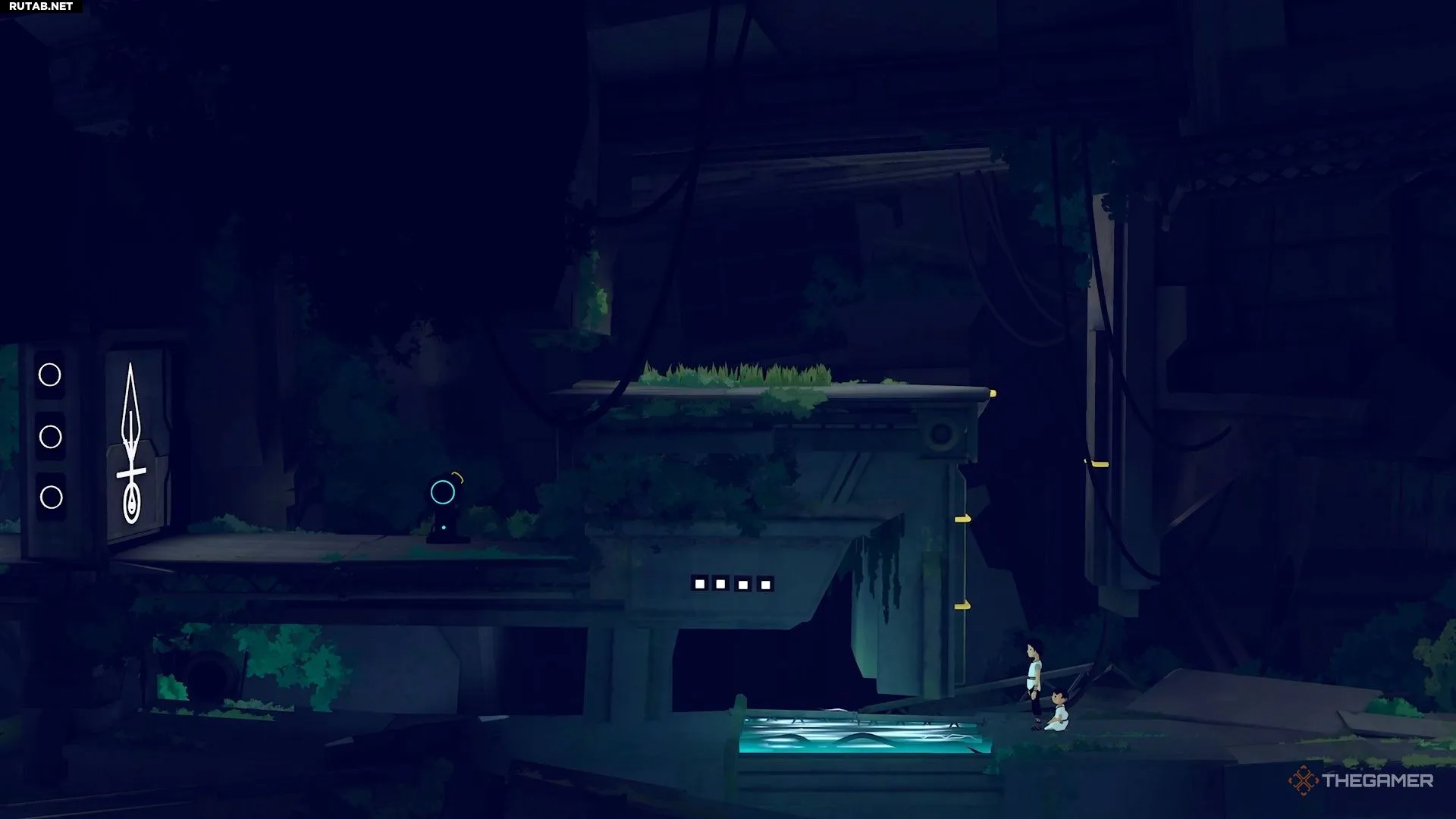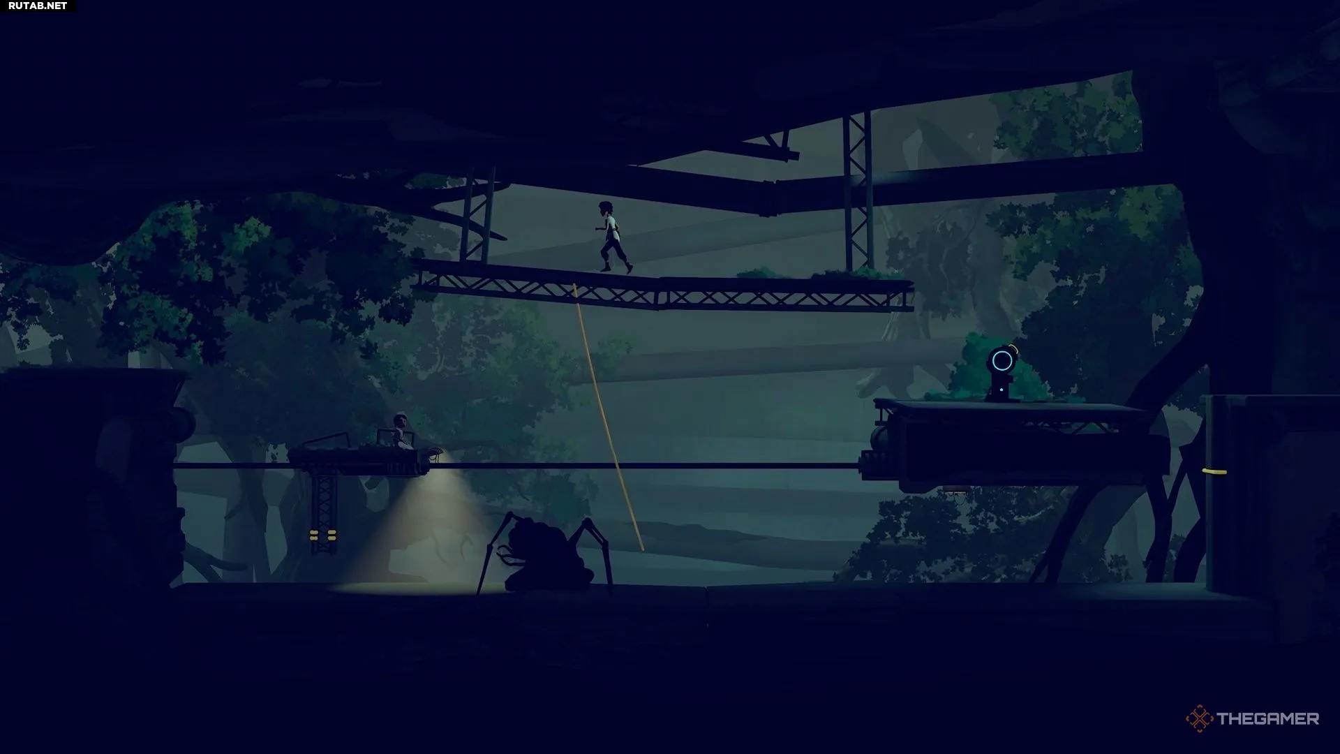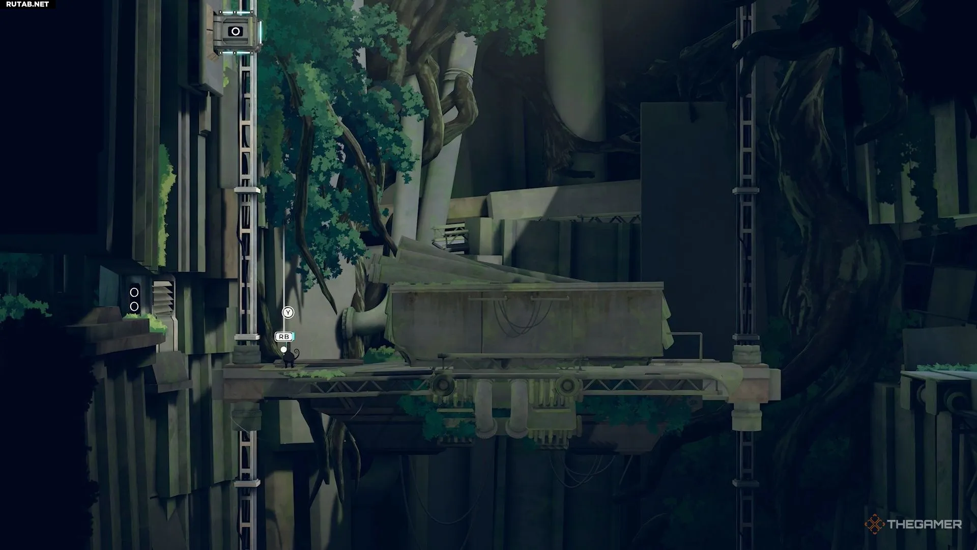 После комнаты с электрической головоломкой используйте верёвку и жёлтые уступы, чтобы спуститься на нижний уровень. Вы окажетесь в зоне с небольшой передвижной платформой. С её помощью нужно переправить ребёнка на другую сторону.