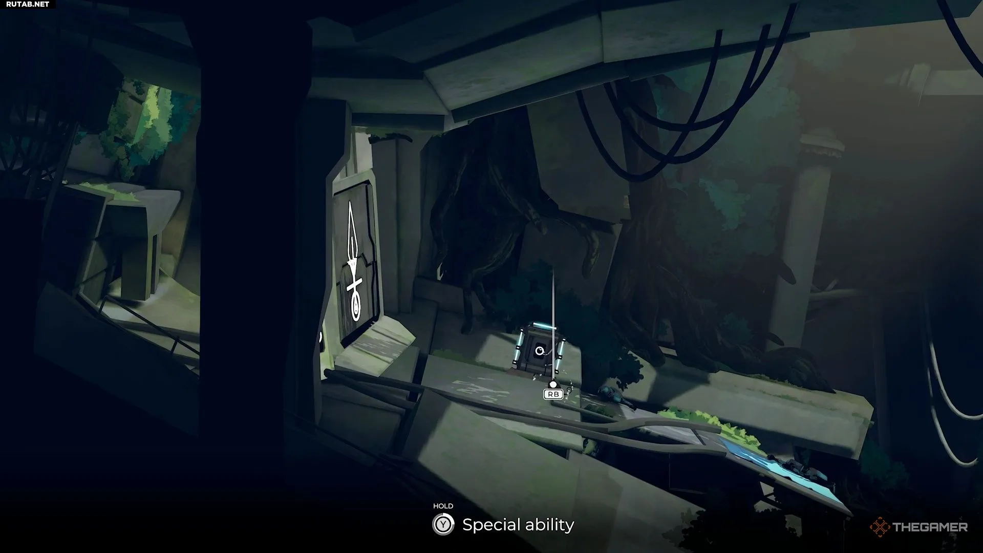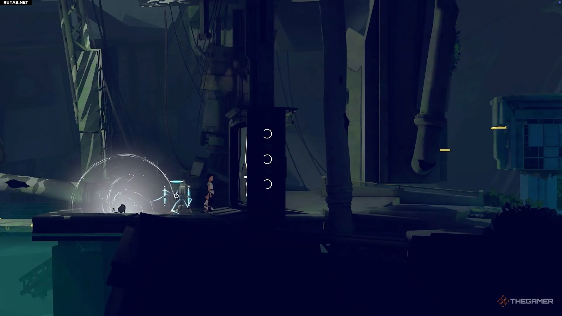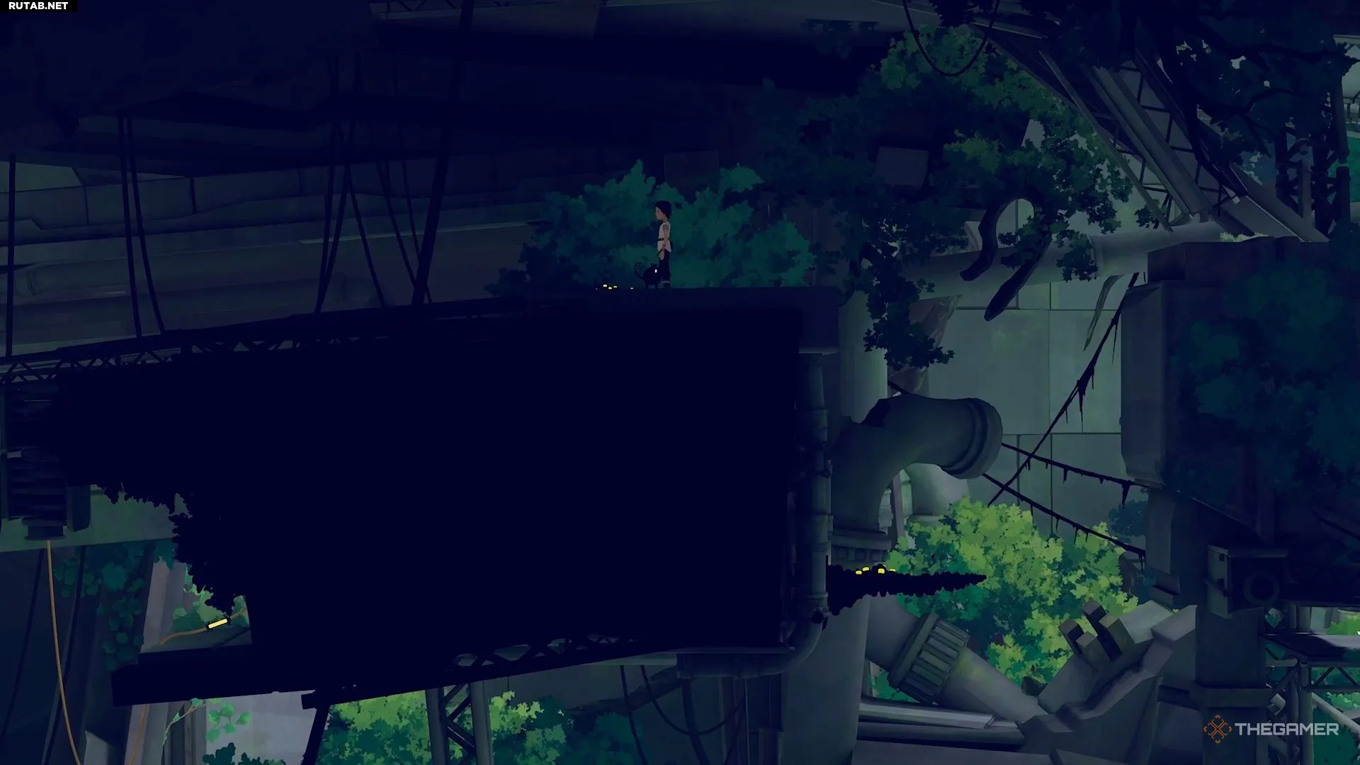 Чтобы попасть в следующую зону, поставьте Муи на очередной чёрно-жёлтый объект на полу, чтобы под вами появилось щупальце. Спрыгните на него, а затем двигайтесь влево к следующей серьёзной головоломке.