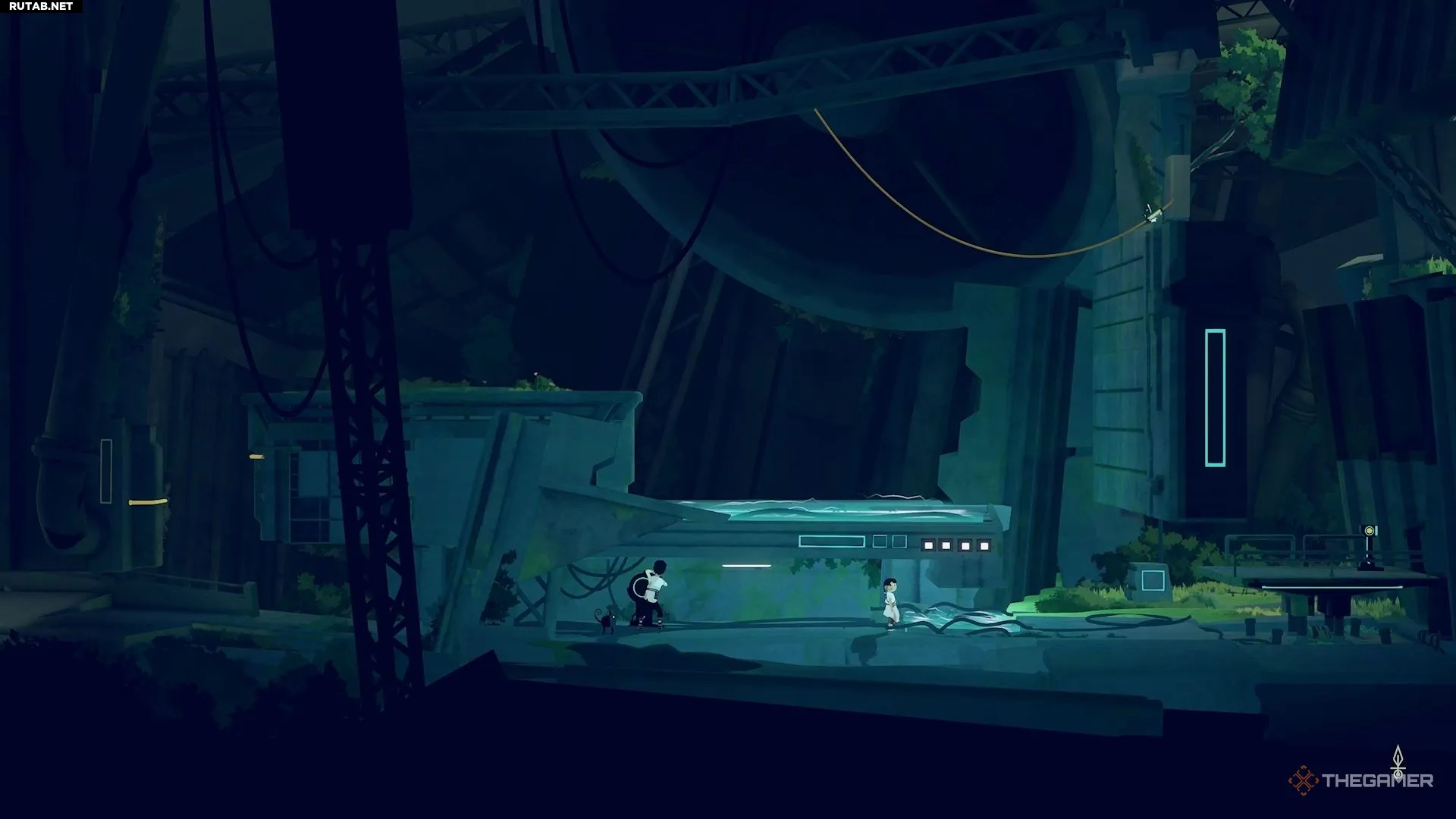 Для начала поставьте Муи на платформу с генератором. Затем потяните рычаг, чтобы приблизить её к монстру. После этого заберитесь на жёлтые уступы и используйте способность Муи, чтобы выключить свет.