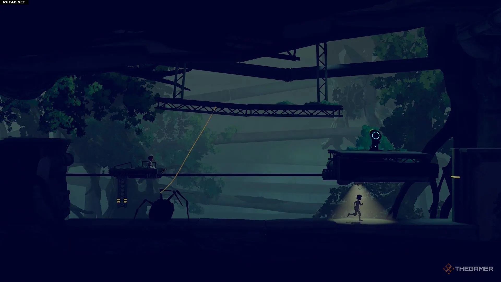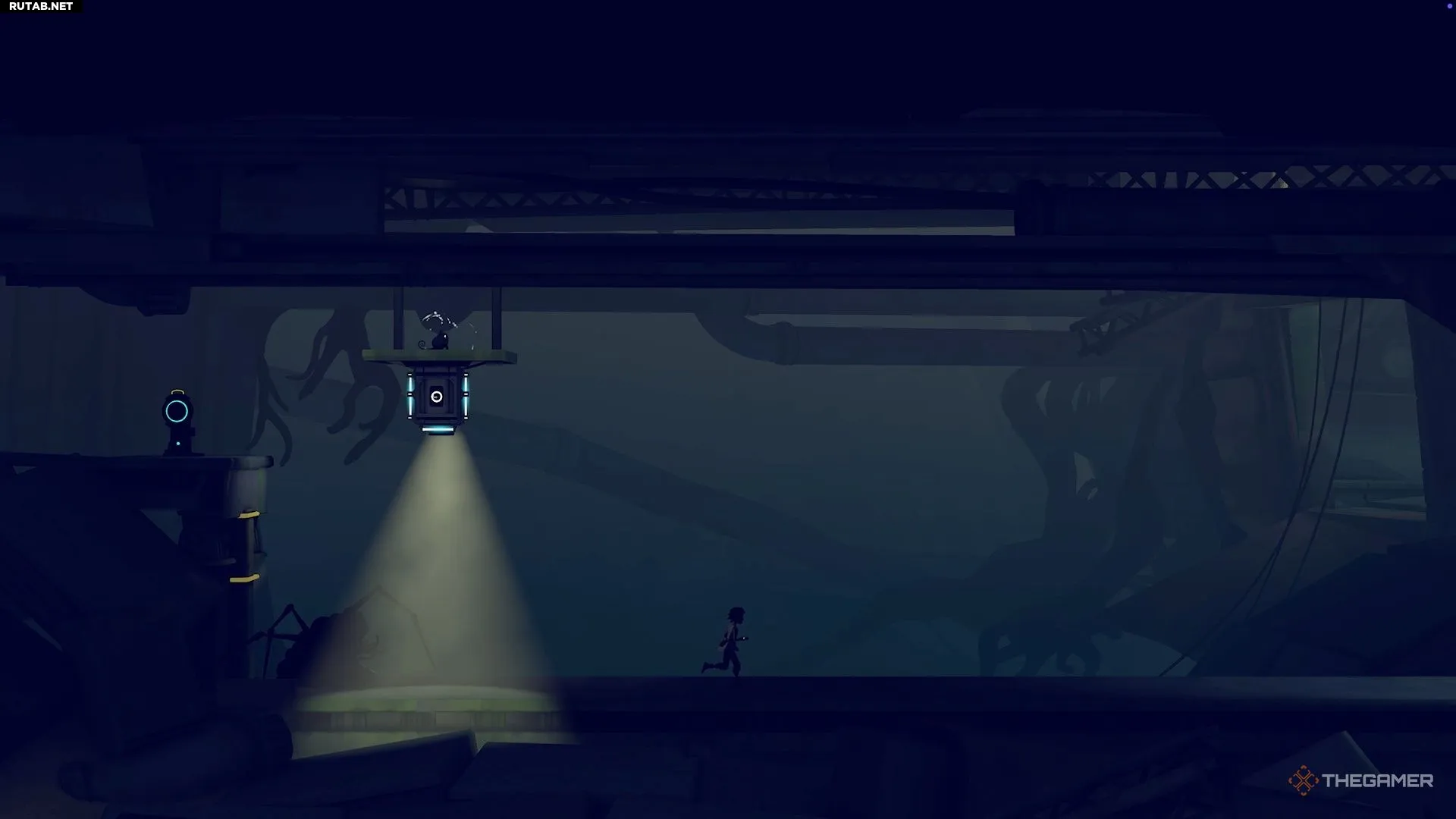 Запрыгните на платформу сверху и используйте переключатель, чтобы выключить свет. Это позволит монстру двинуться влево. Как только он пройдёт мимо источника света, включите его снова и спрыгните с правой стороны платформы. Из-за света он не сможет последовать за вами, что даст вам шанс покинуть эту зону.