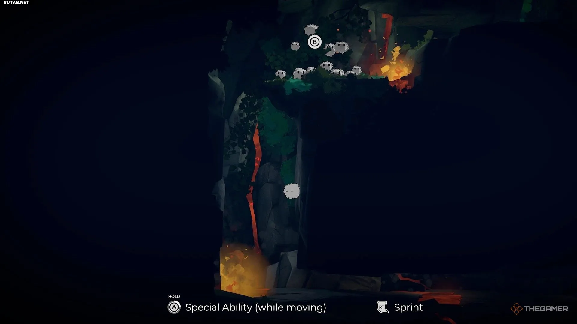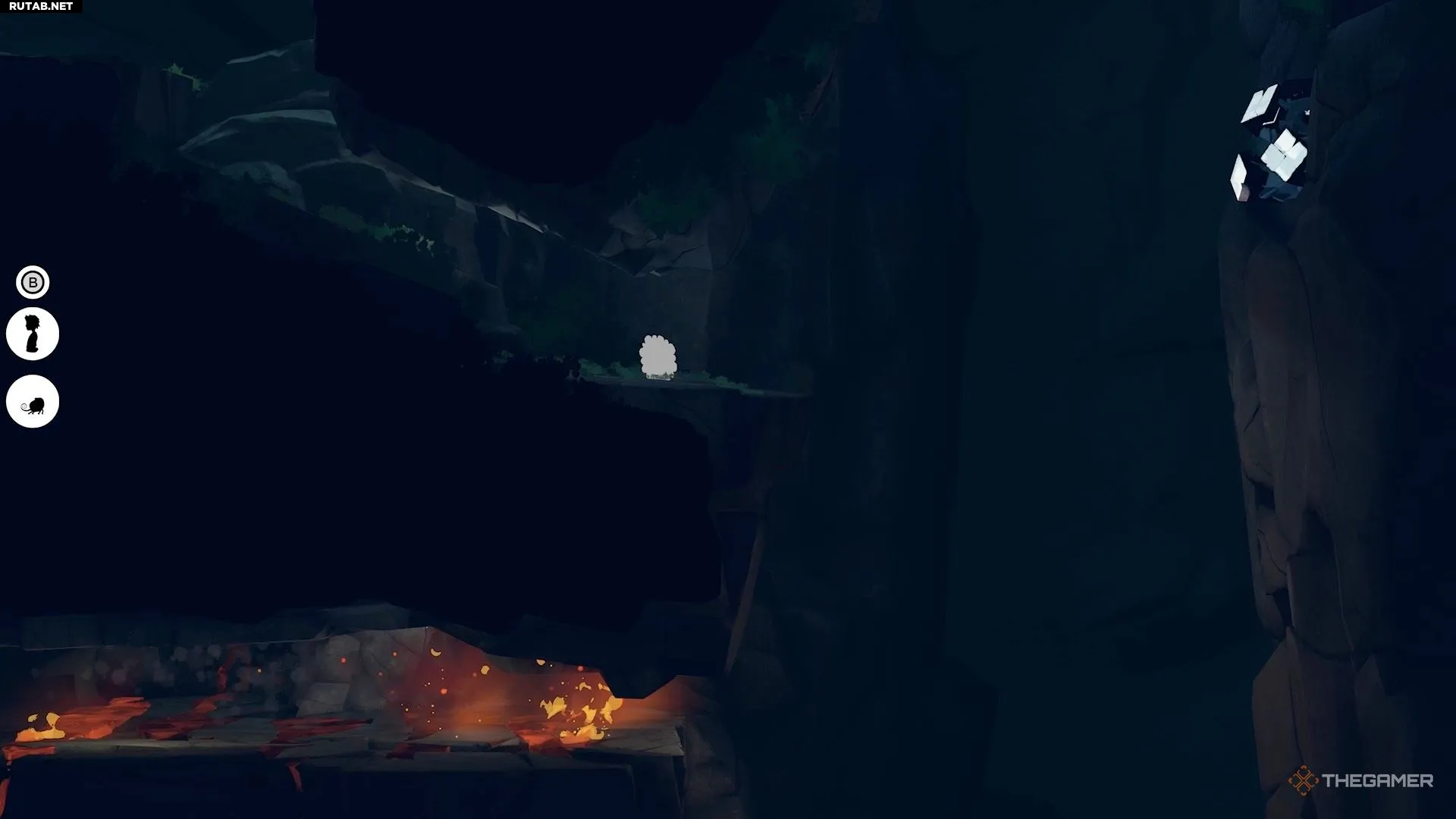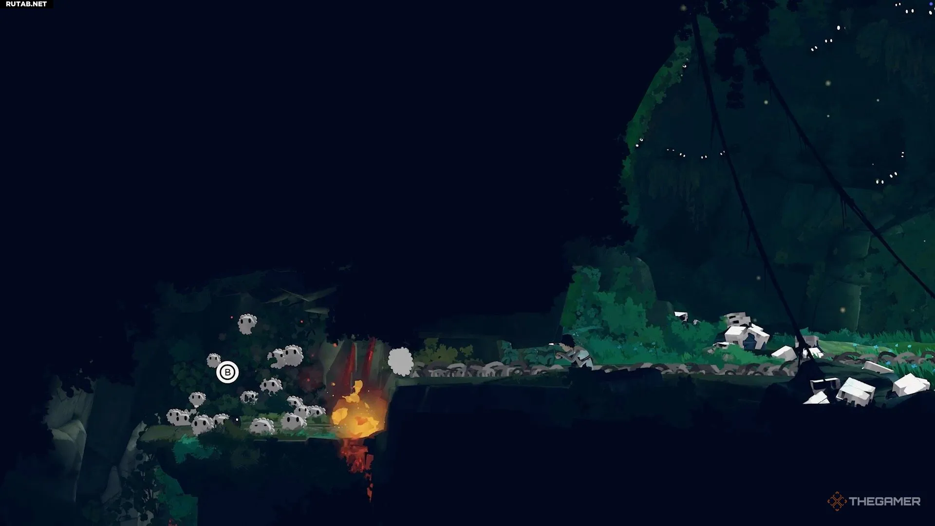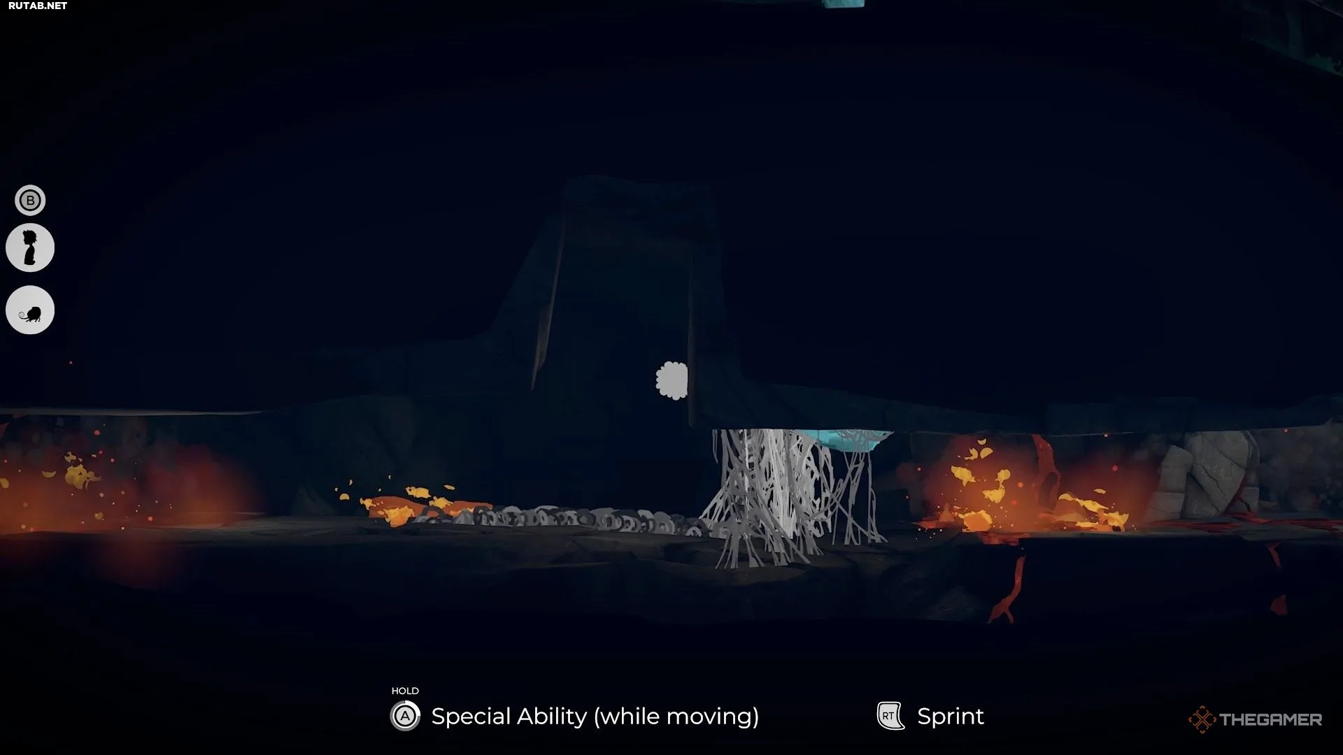 Чтобы избавиться от паутины, идите налево, чтобы найти белых существ. Возьмите под контроль одного из них и продолжайте путь влево. Доберитесь до нижней части области, где находится небольшой огонь.