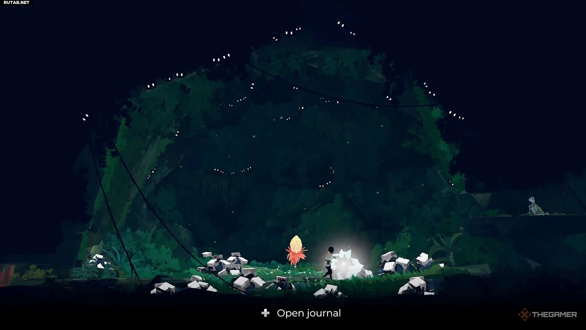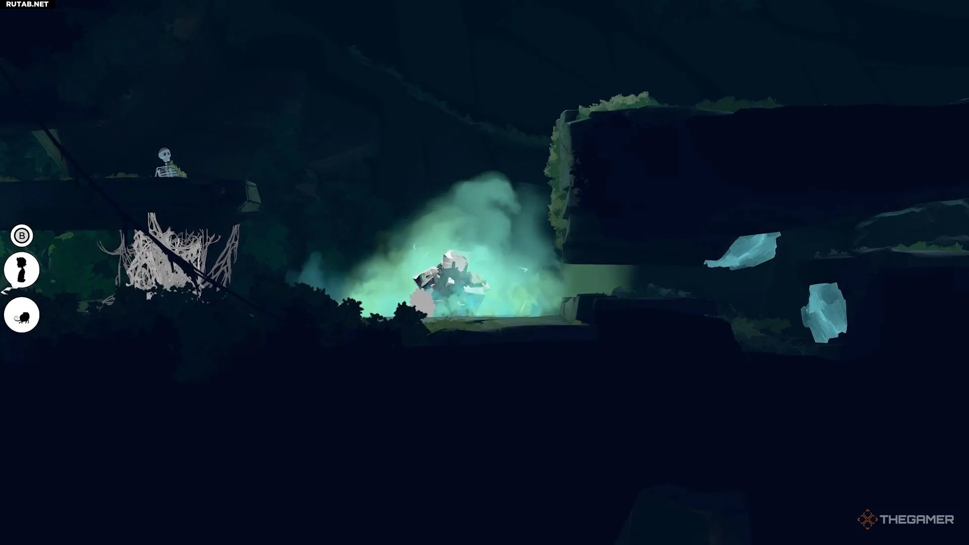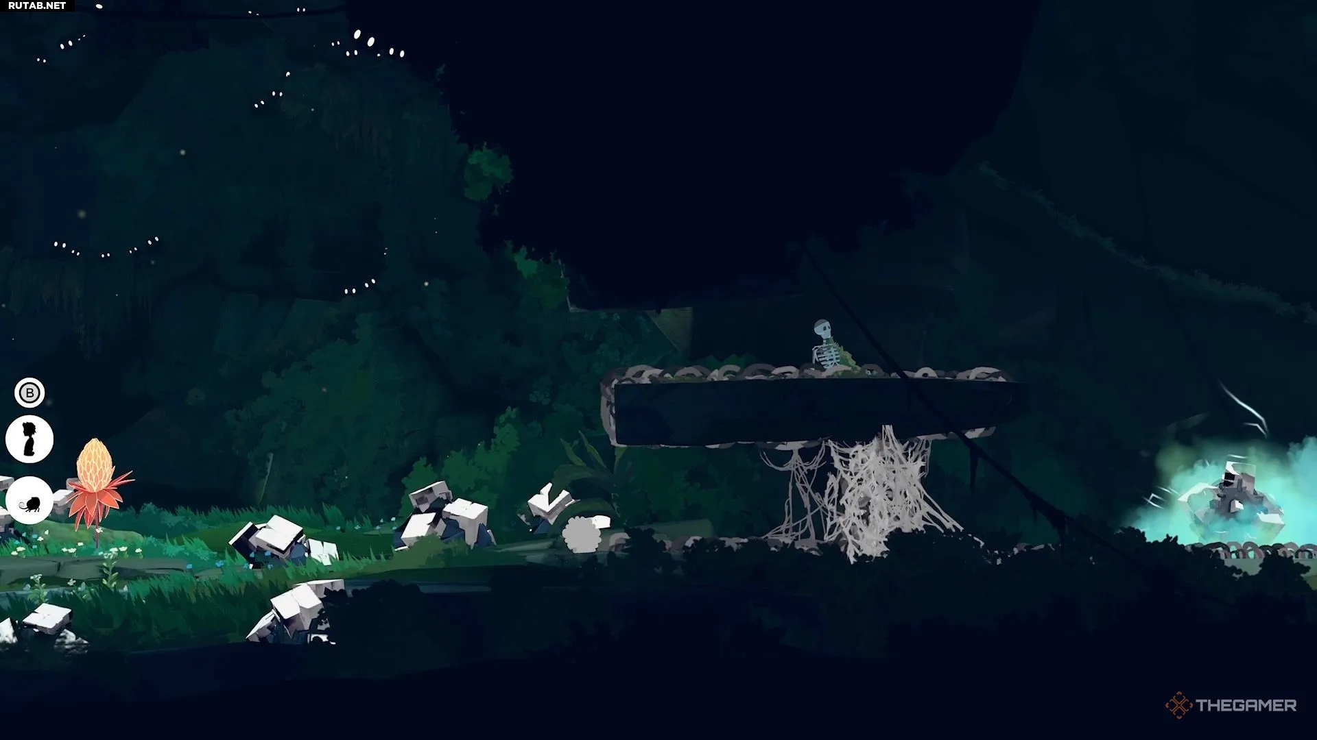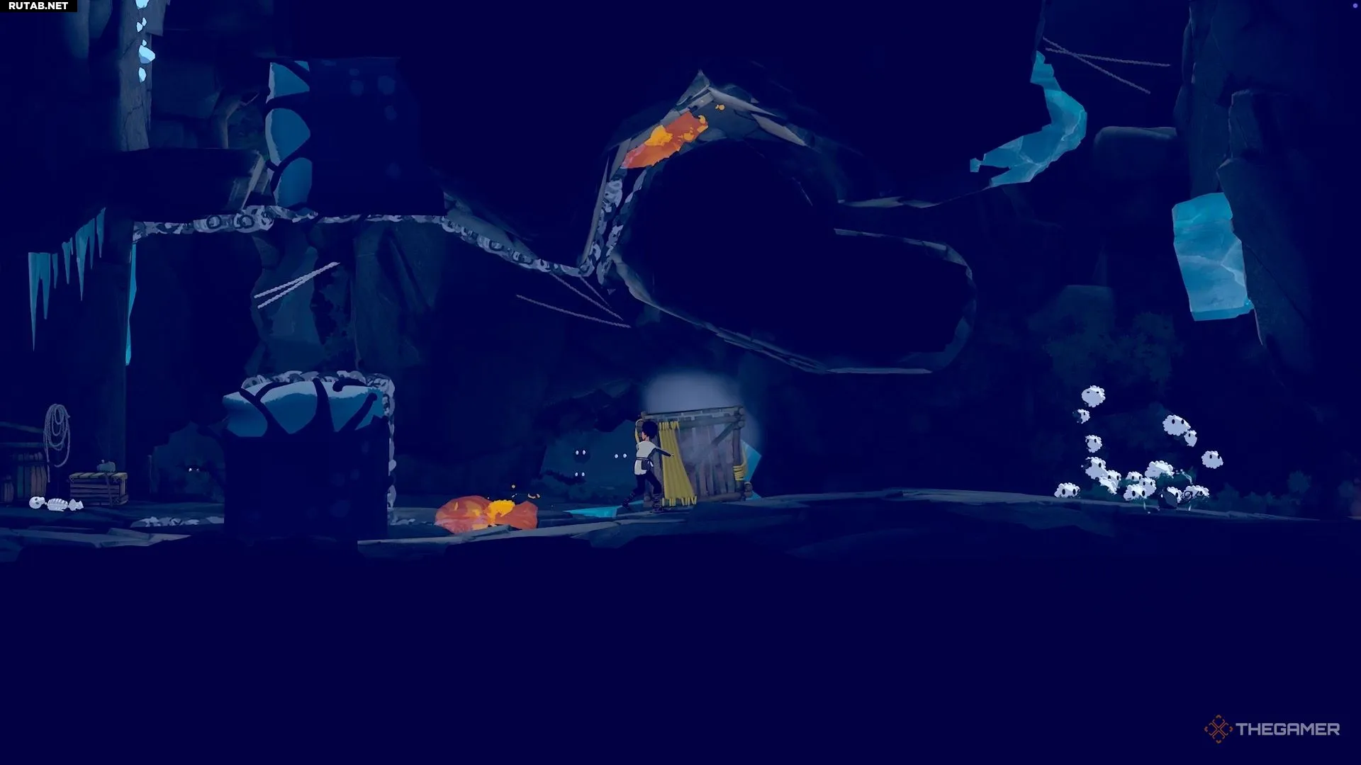 Чтобы избавиться от паутины, идите налево, чтобы найти белых существ. Возьмите под контроль одного из них и продолжайте путь влево. Доберитесь до нижней части области, где находится небольшой огонь.