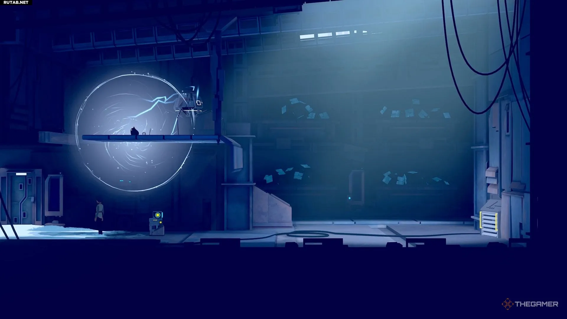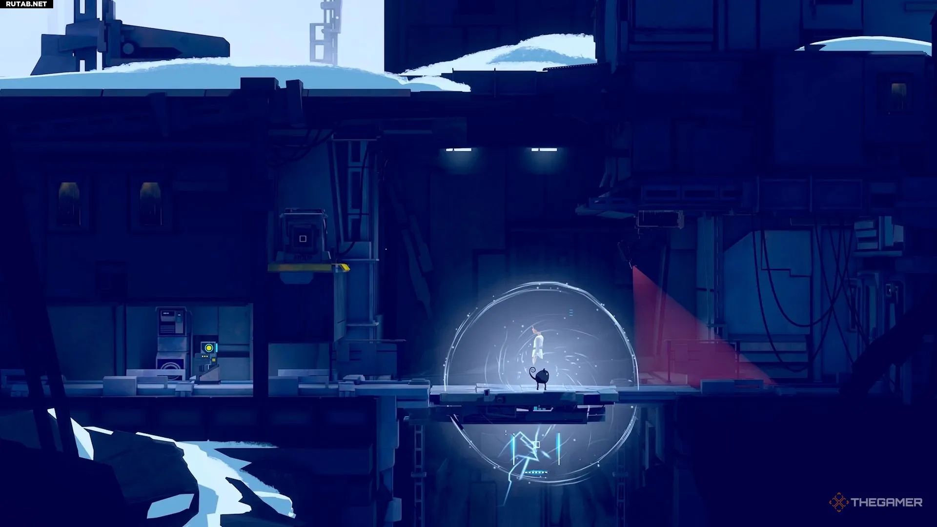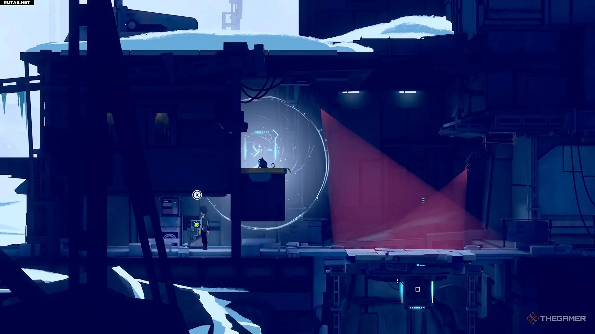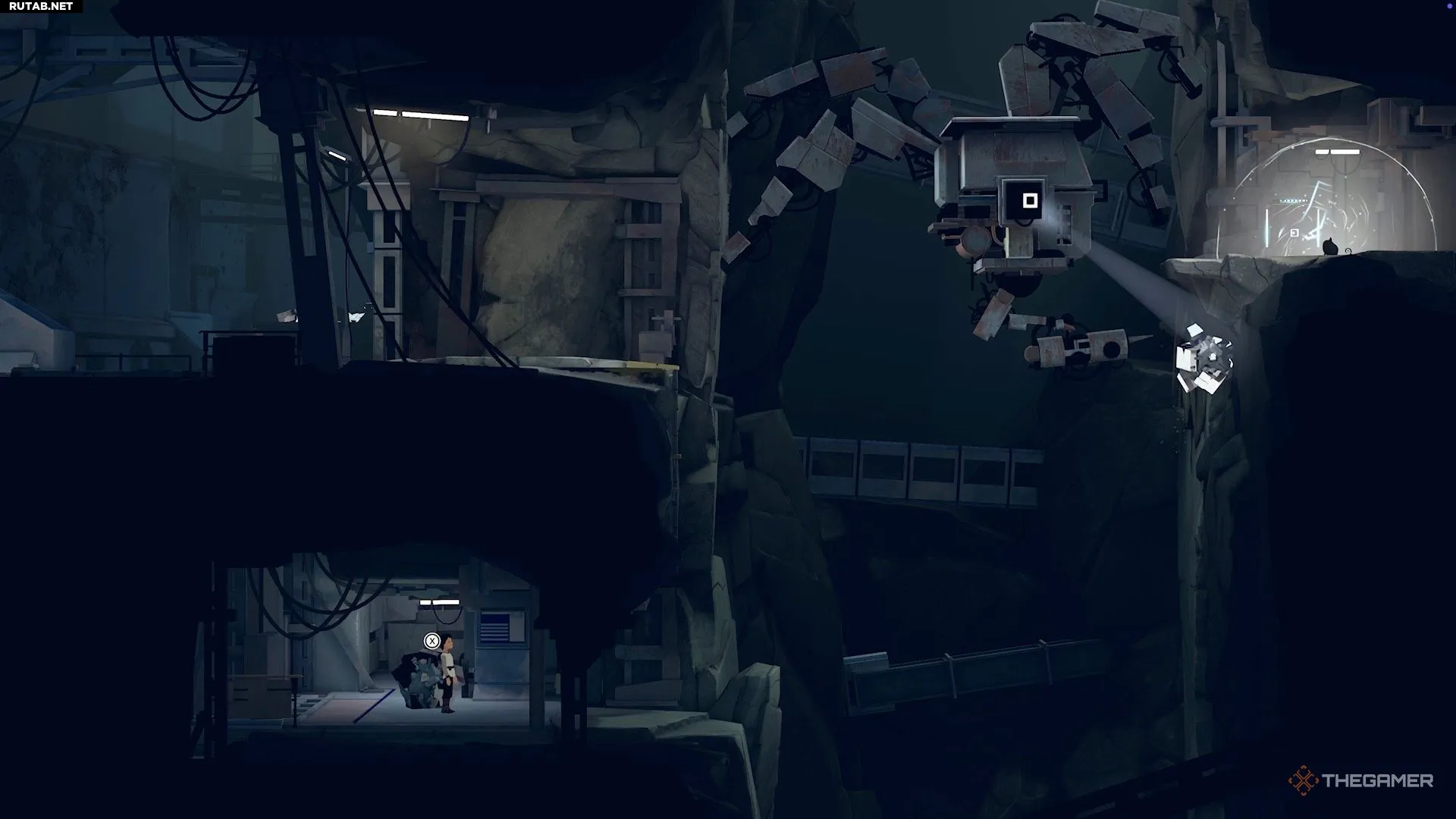 Поднявшись по нескольким уступам, вы окажетесь в области с парой камер. Отправьте Муи наверх, где находится генератор, и используйте её силу. Это отключит первую камеру, позволив вам пробежать мимо неё и перепрыгнуть в другую область.