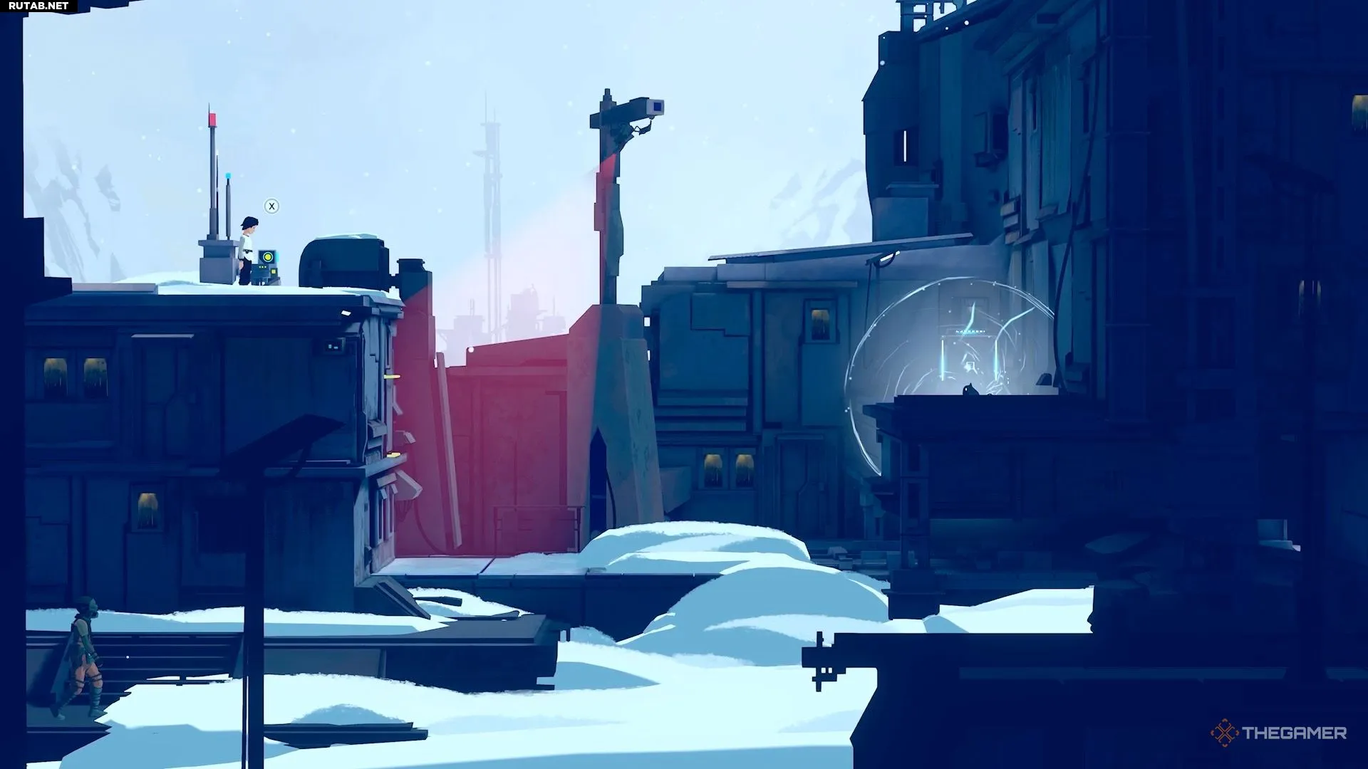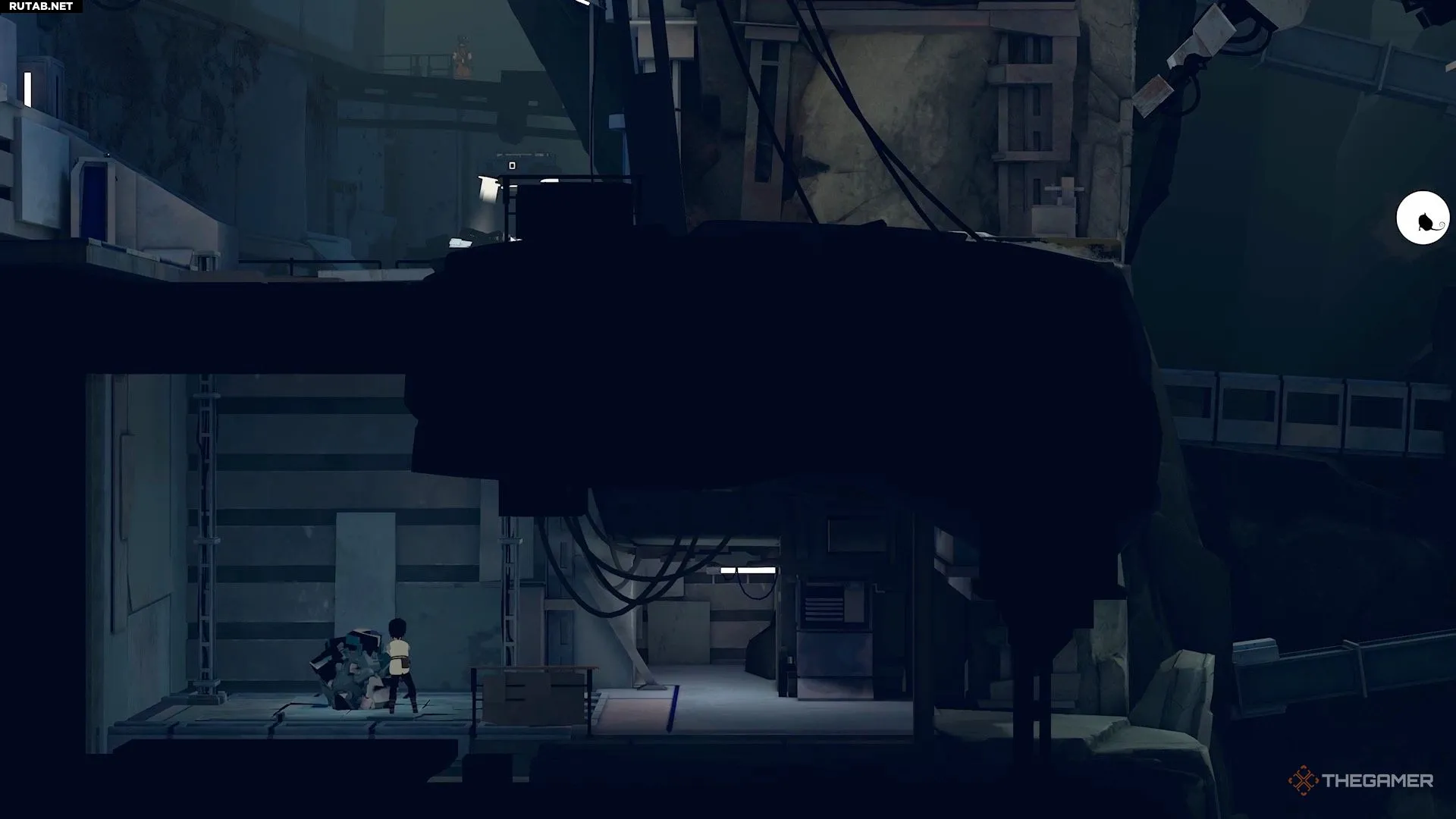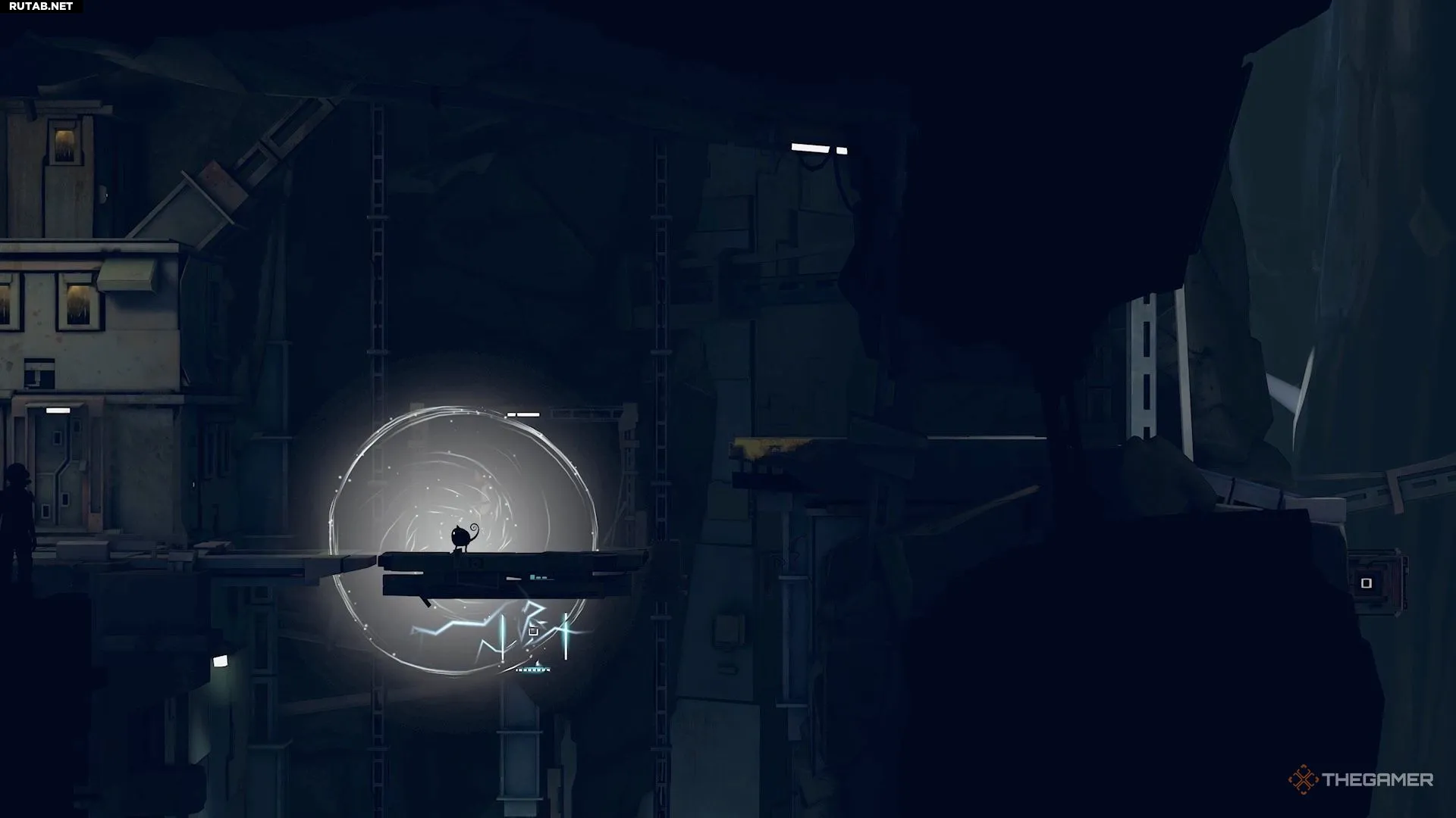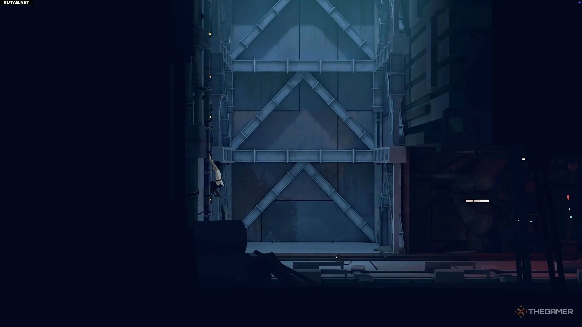 Поднявшись по нескольким уступам, вы окажетесь в области с парой камер. Отправьте Муи наверх, где находится генератор, и используйте её силу. Это отключит первую камеру, позволив вам пробежать мимо неё и перепрыгнуть в другую область.