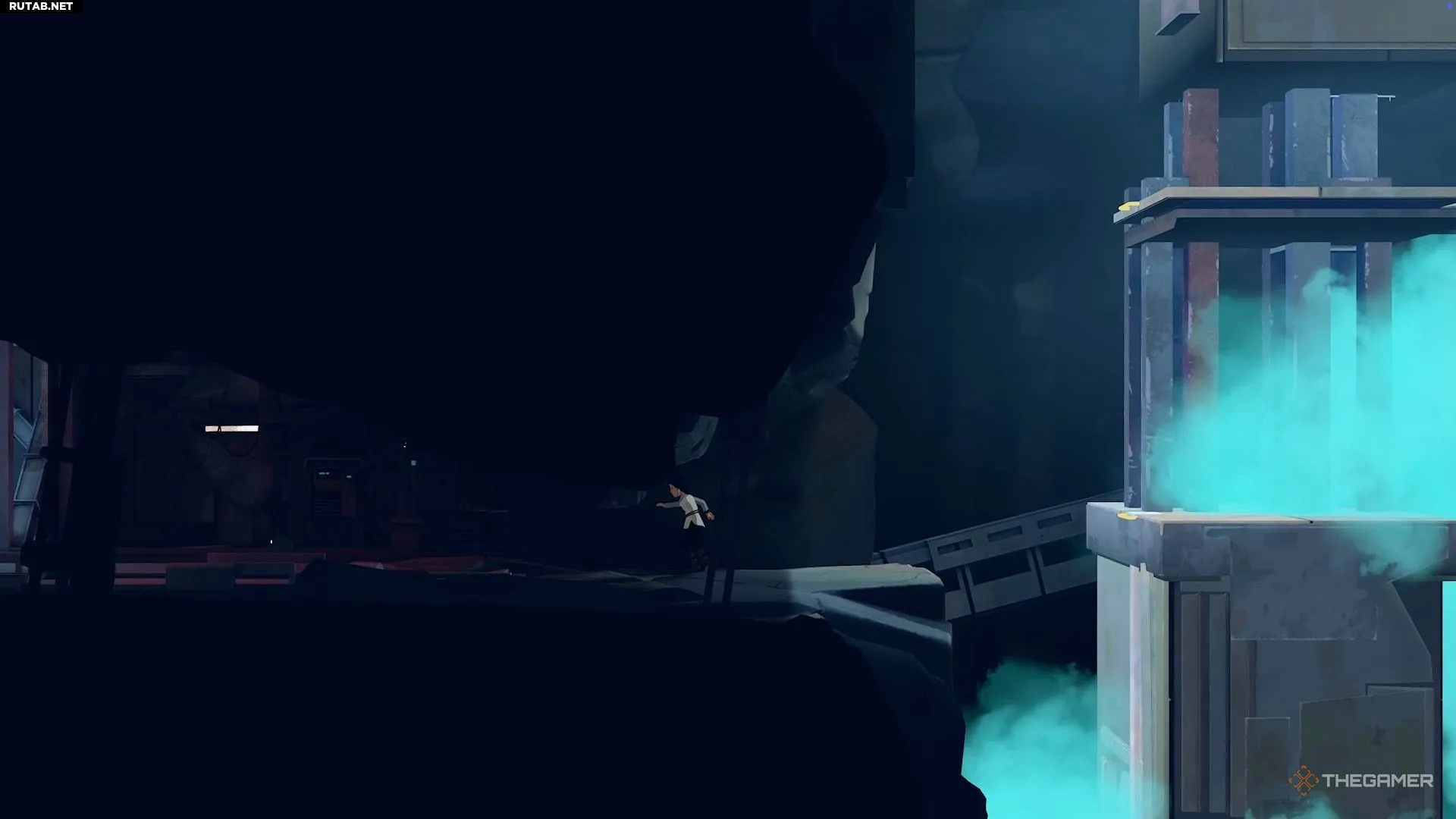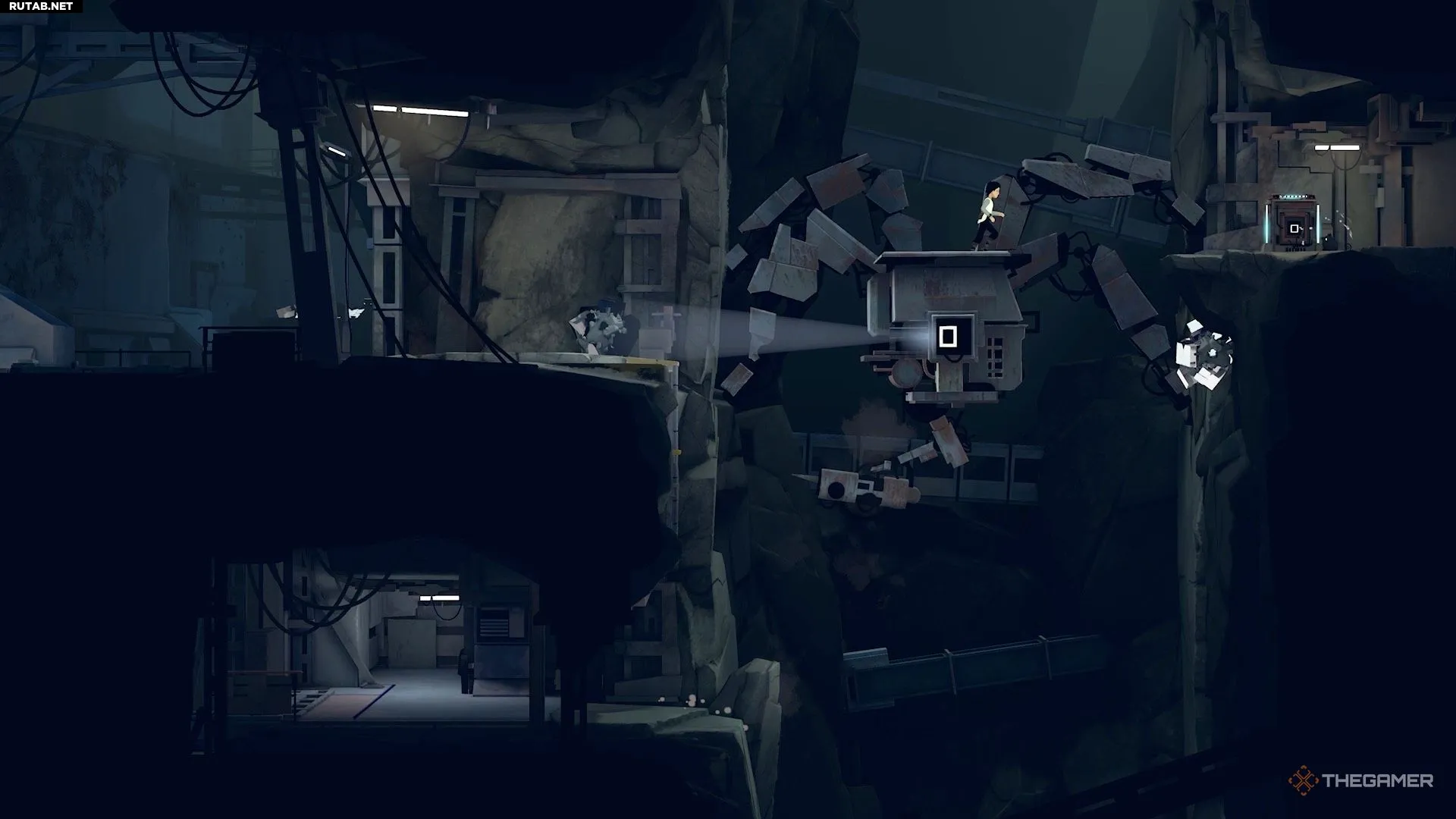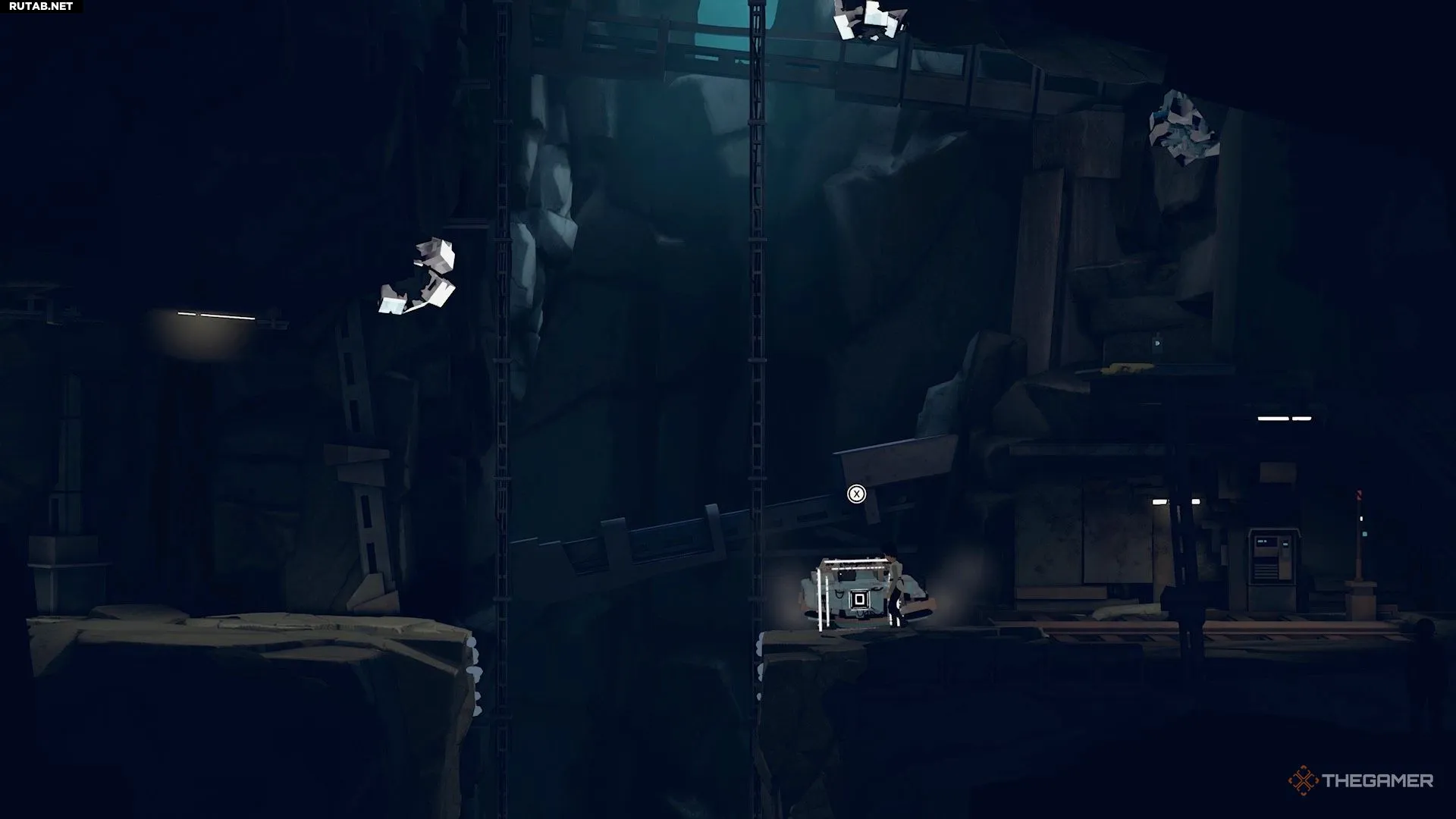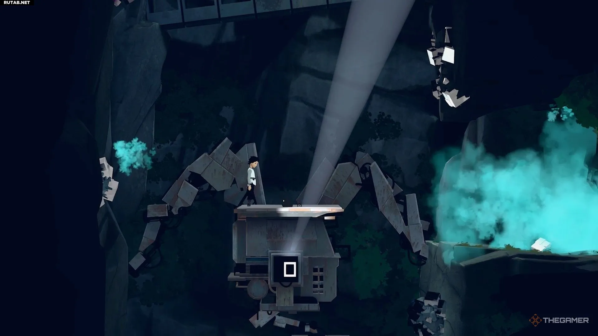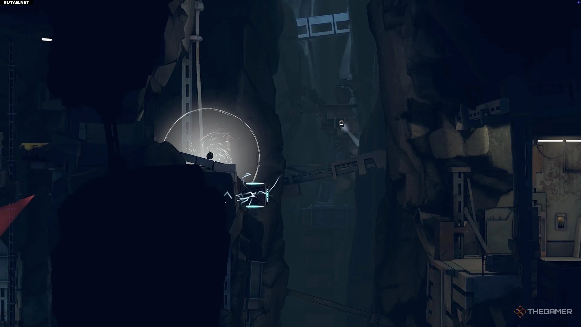 Поэтому перепрыгните направо и активируйте генератор на краю обрыва, чтобы временно отключить камеру.