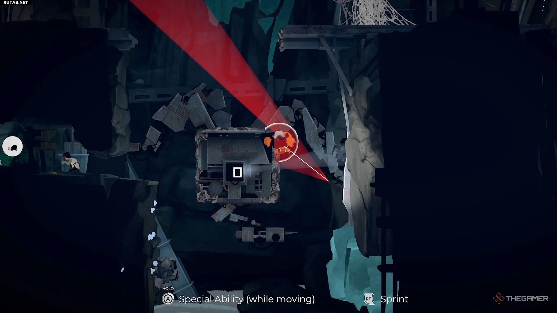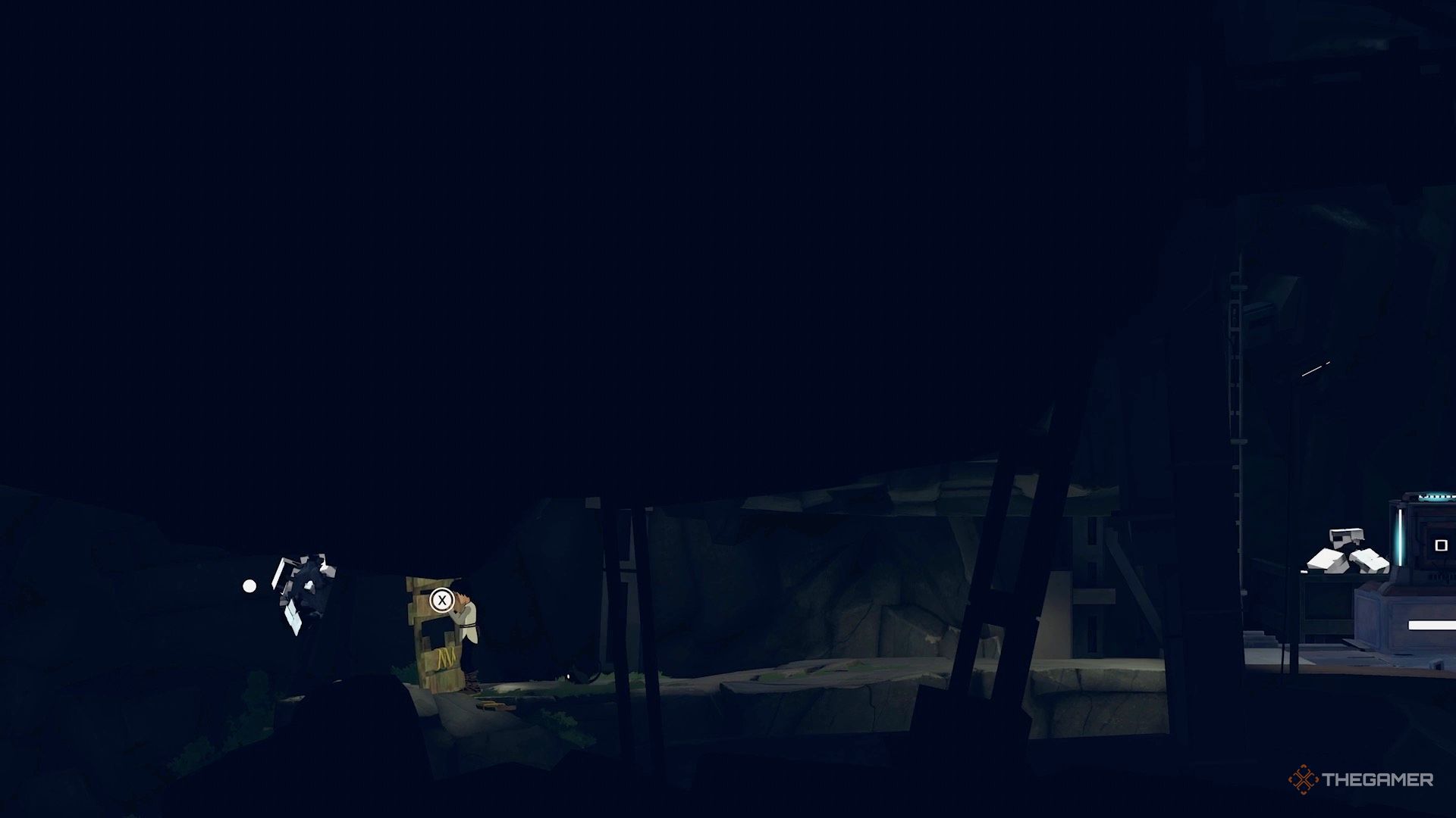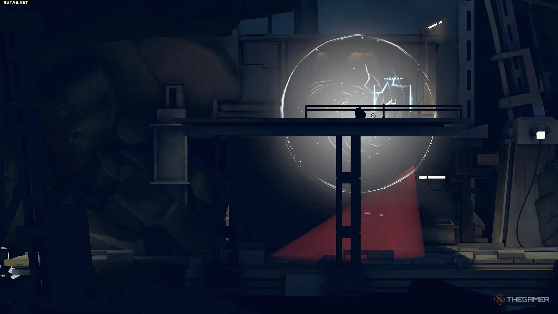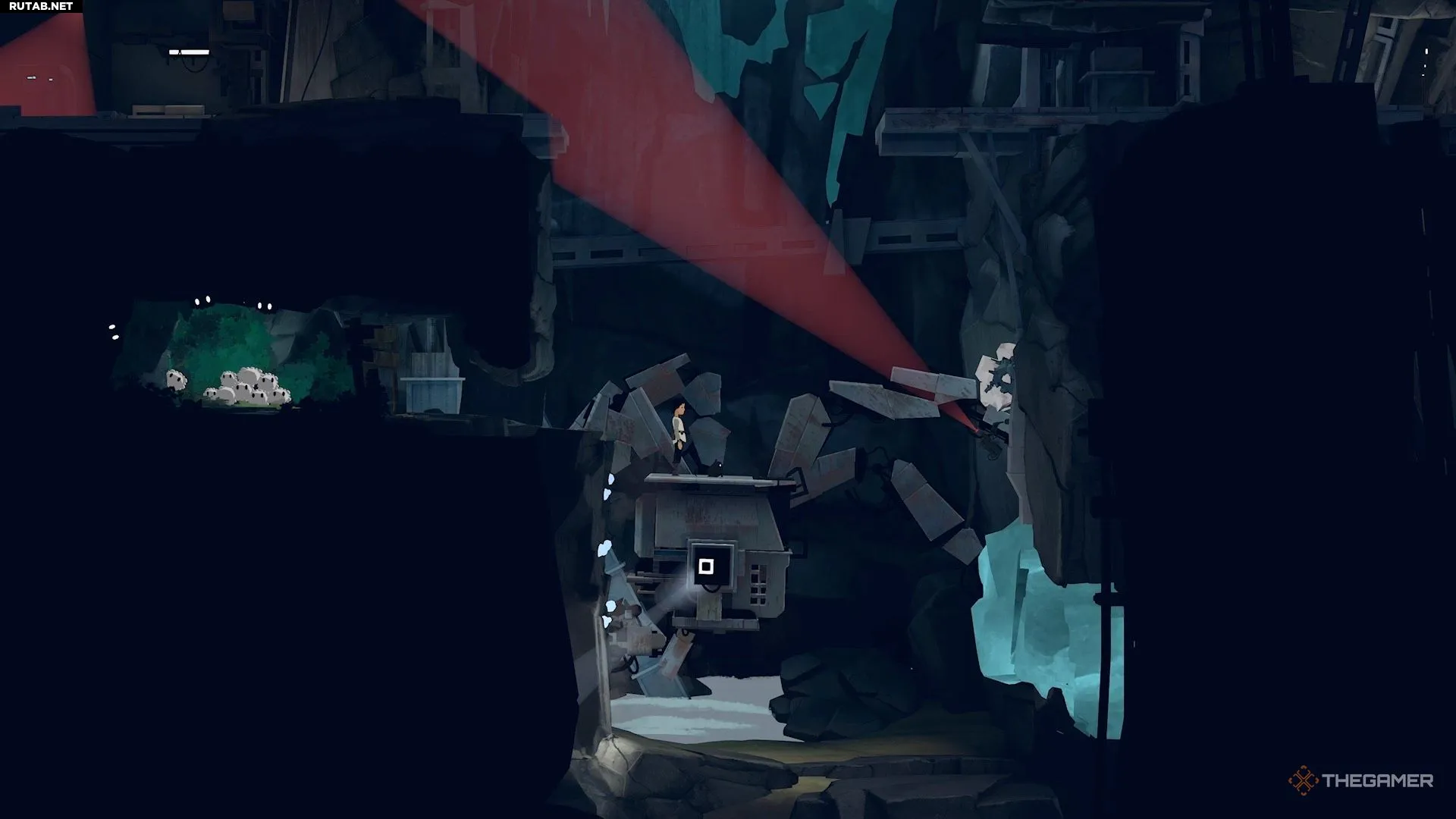 Поэтому перепрыгните направо и активируйте генератор на краю обрыва, чтобы временно отключить камеру.