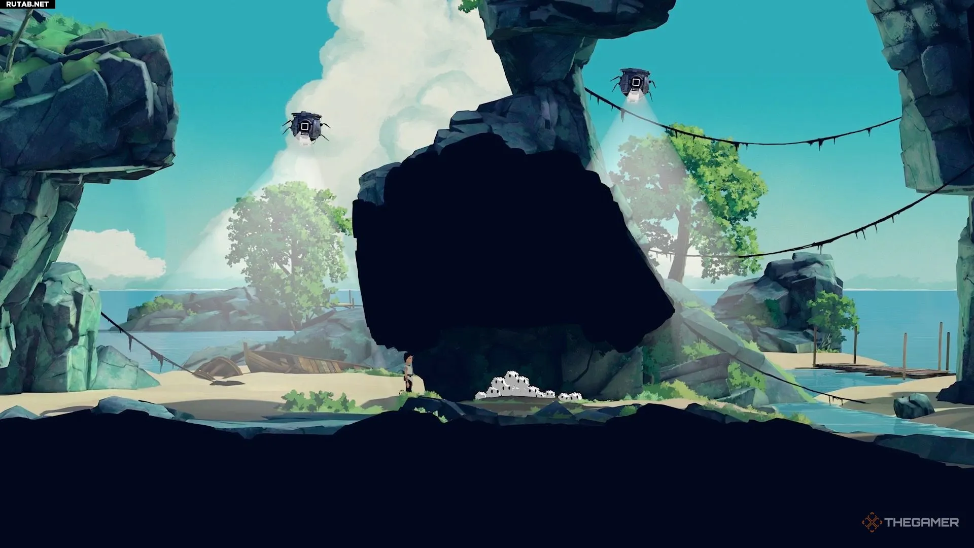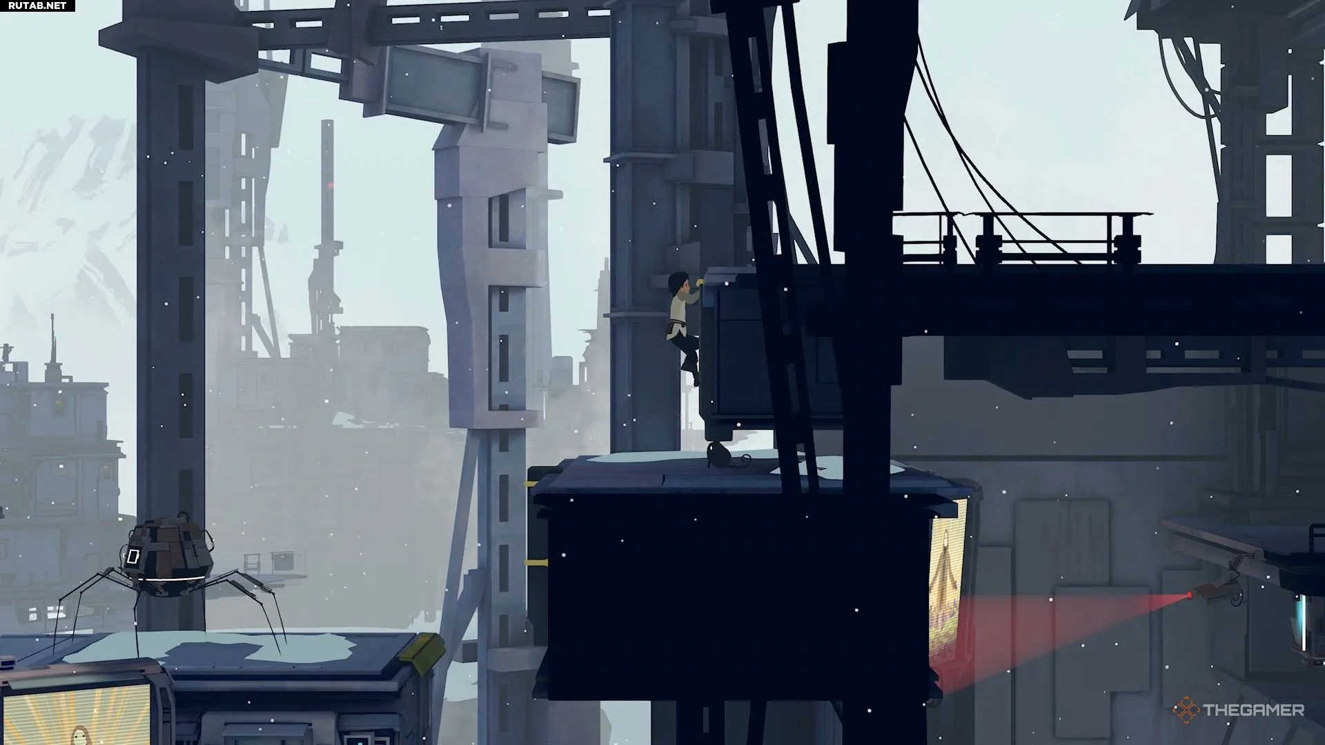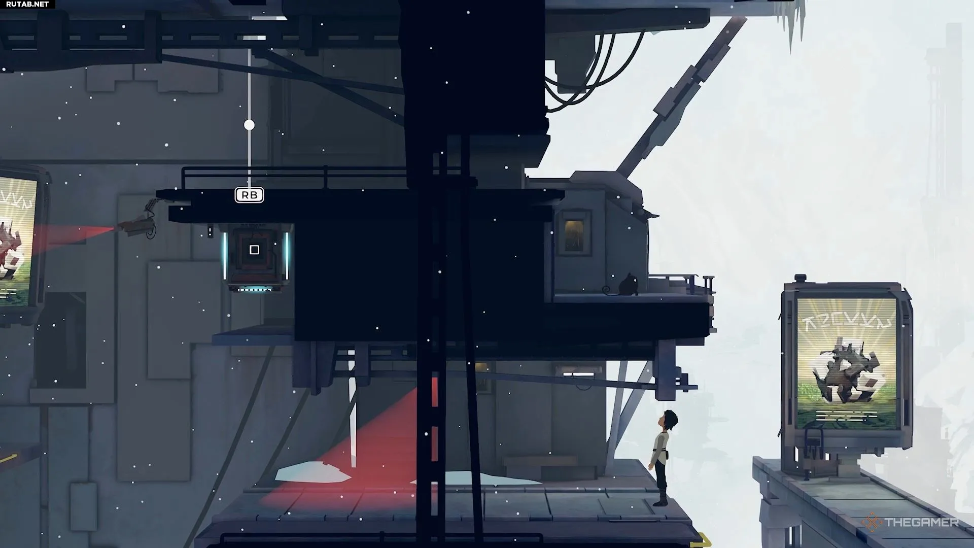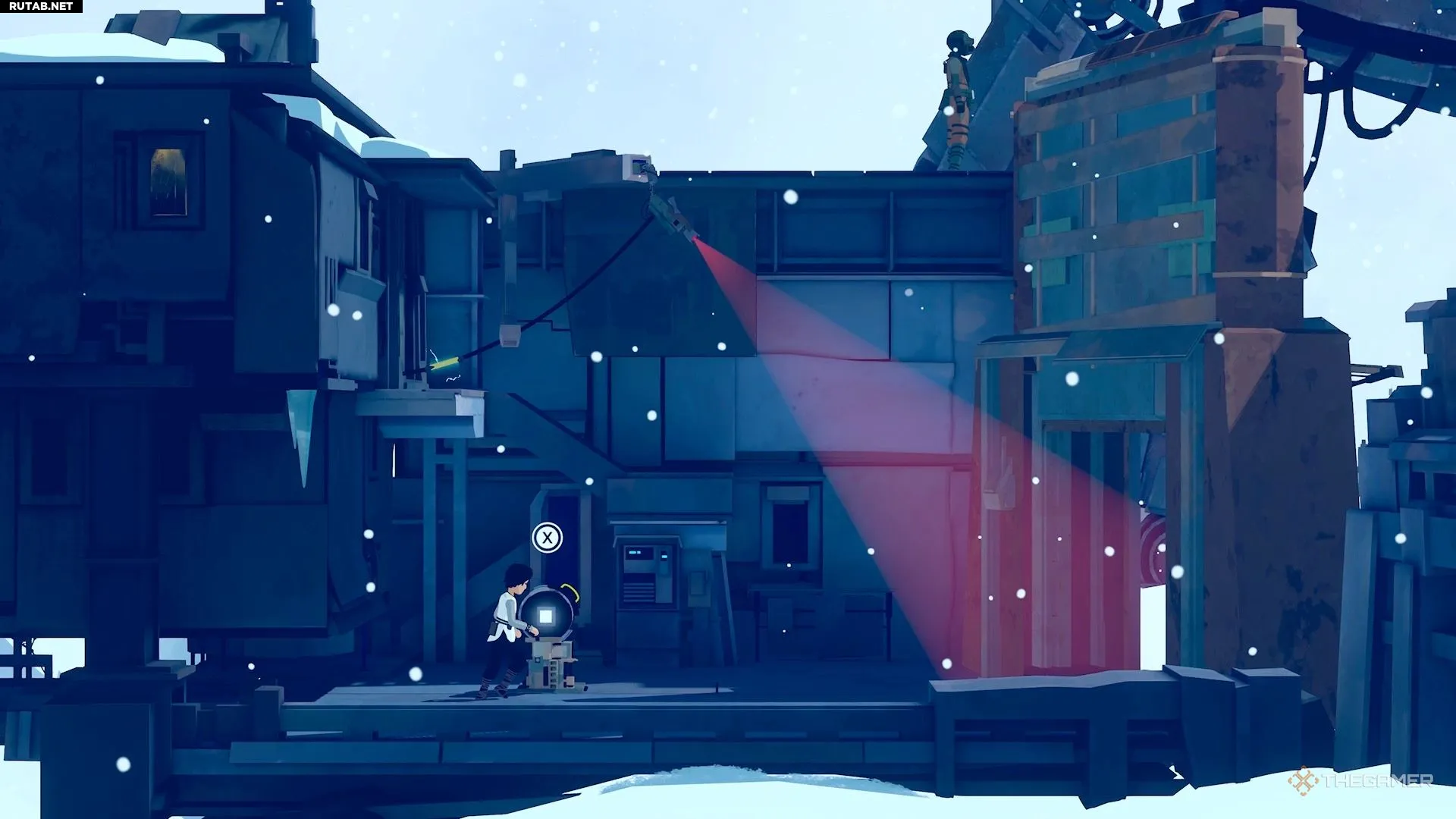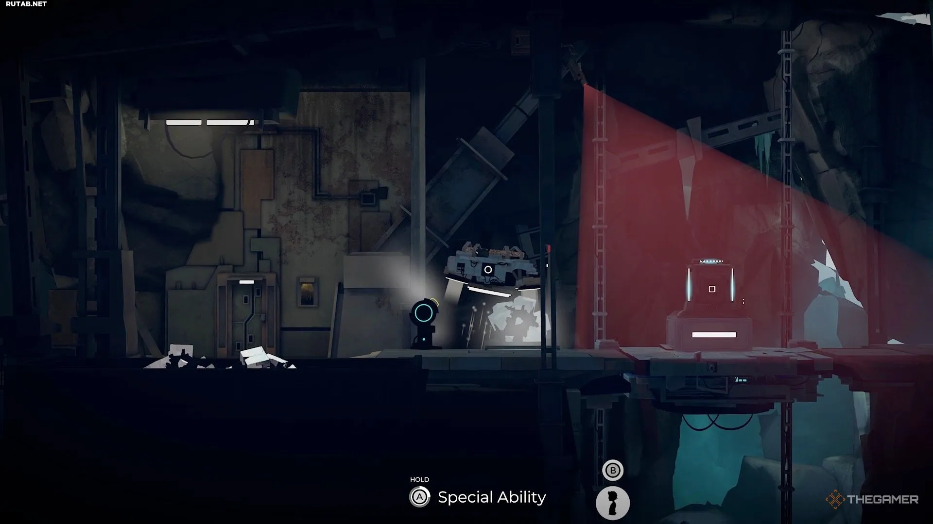 Поэтому перепрыгните направо и активируйте генератор на краю обрыва, чтобы временно отключить камеру.