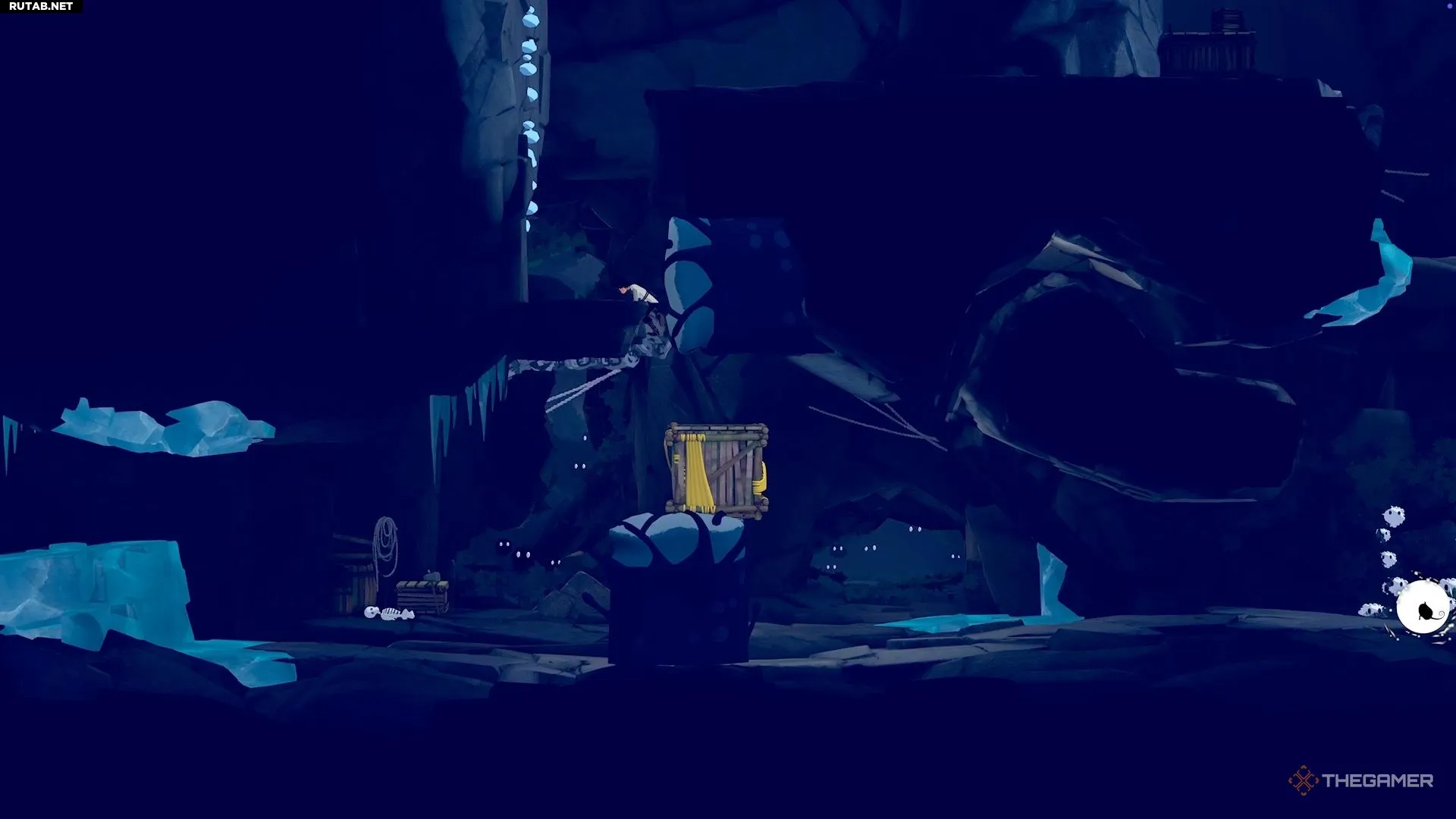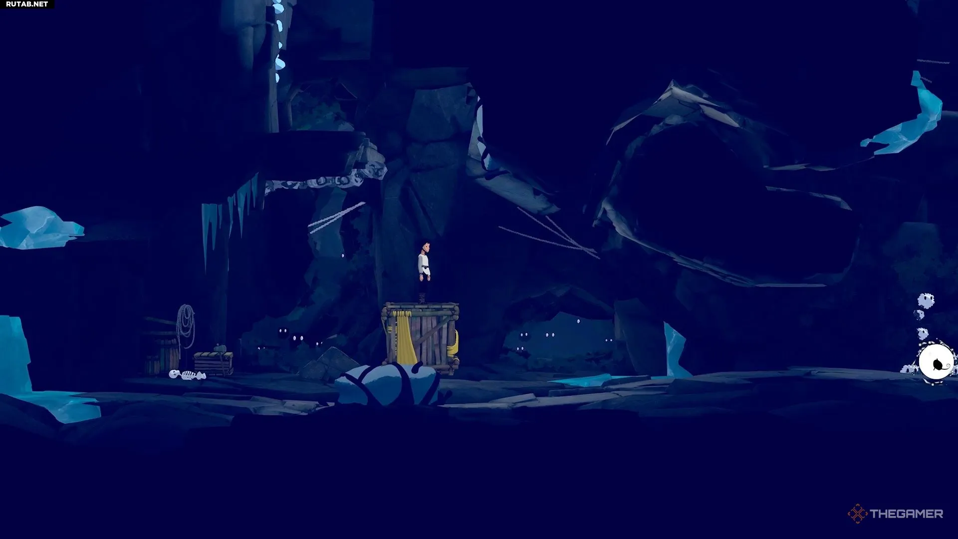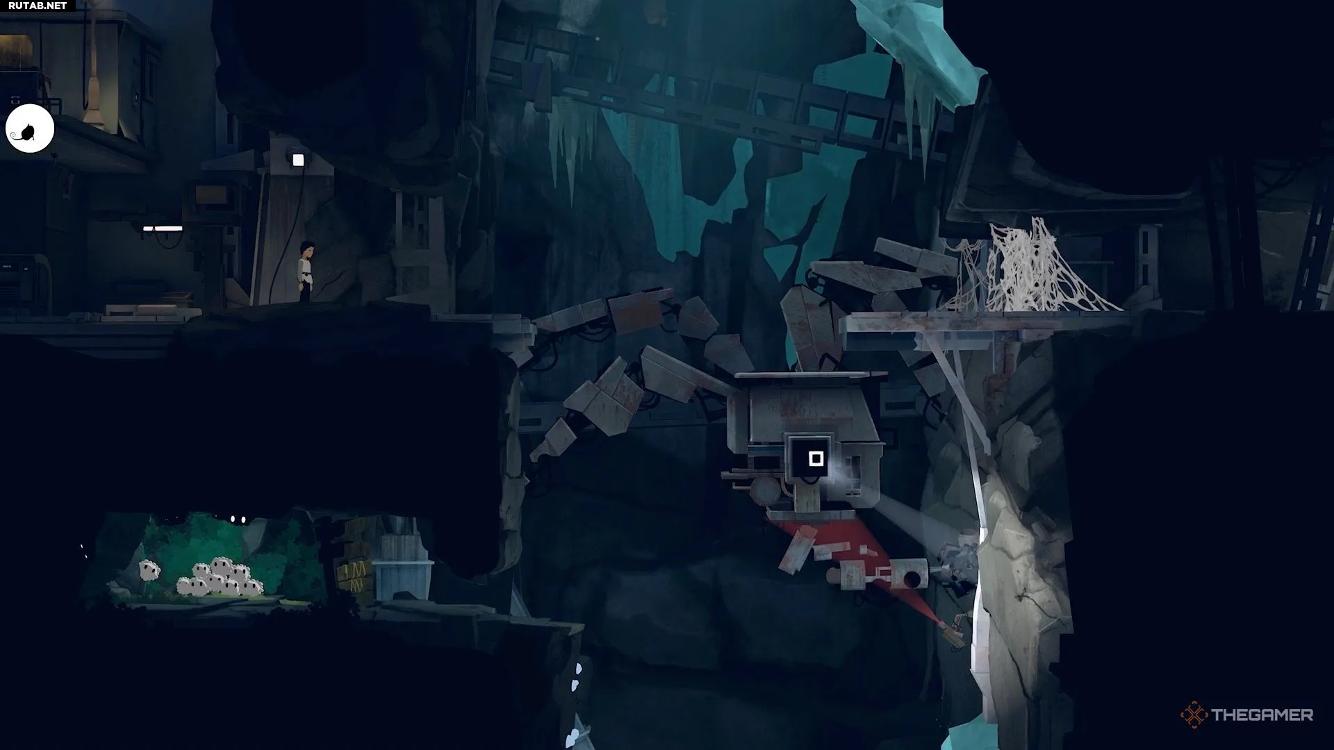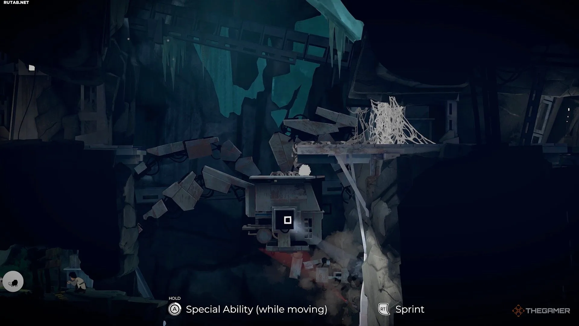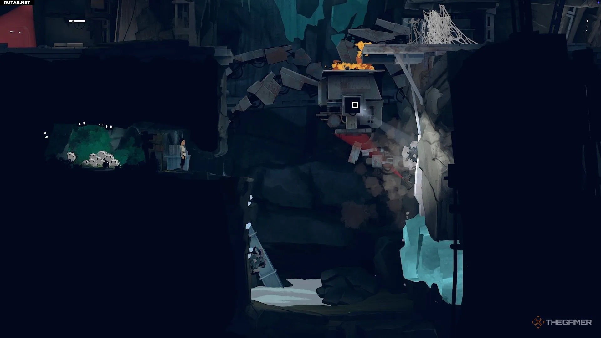 В следующей зоне находятся большой шахтёрский робот, камера, маленькие белые существа и паутина. Начните со спрыгивания вниз и оторвите доски от деревянной стены, чтобы Муи смогла добраться до белых существ.