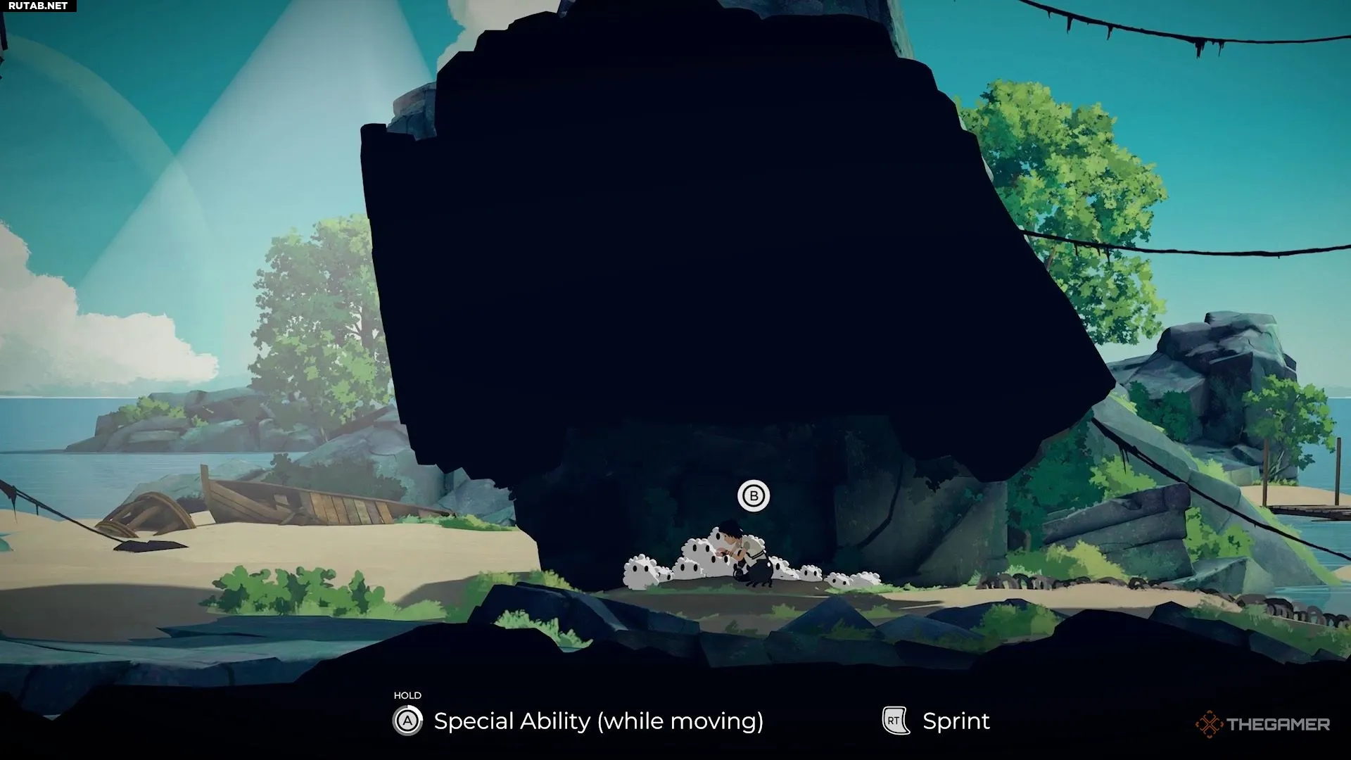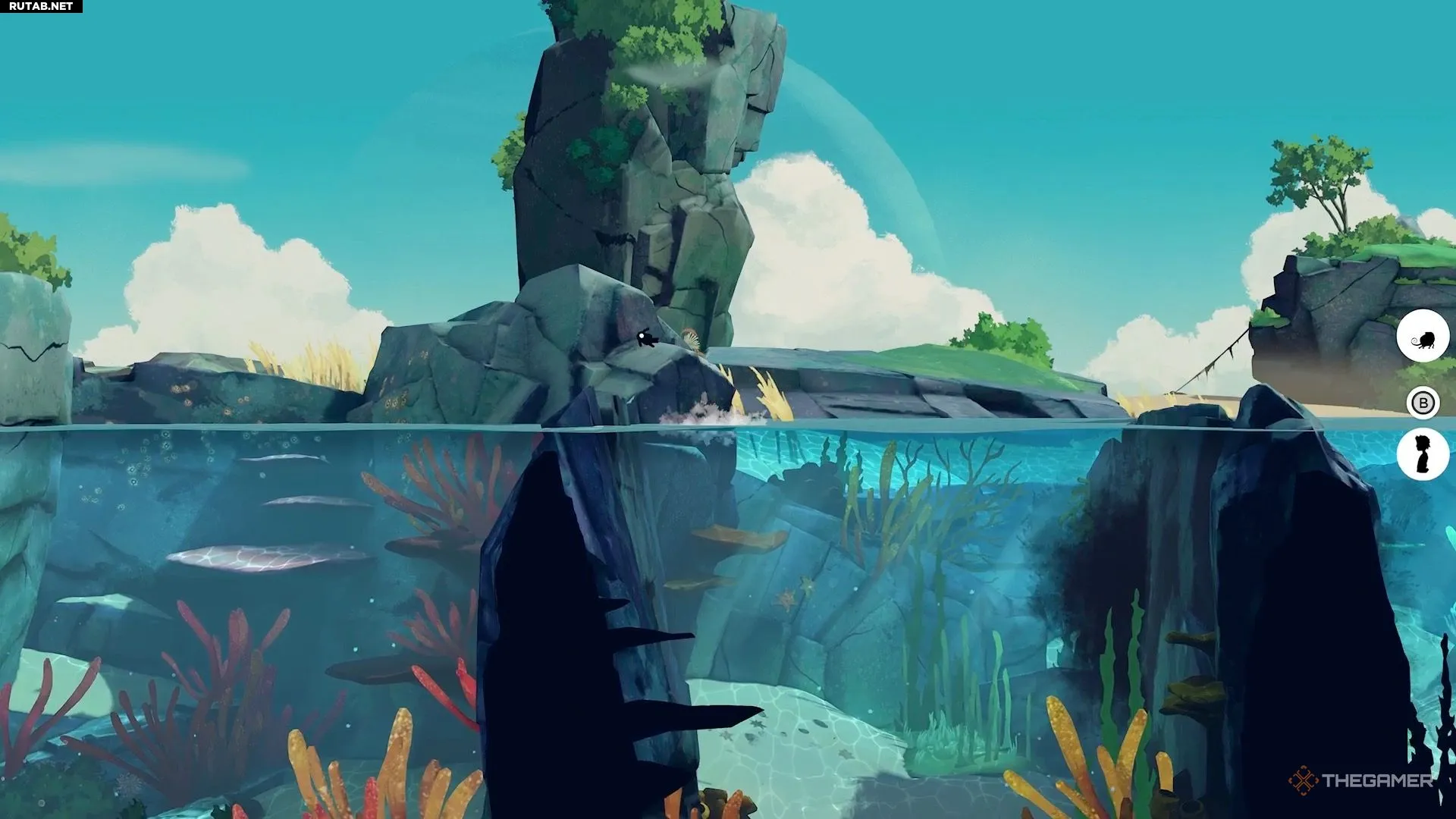 Поэтому подплывите по левой стороне и прикажите Муи забраться на камень посередине.