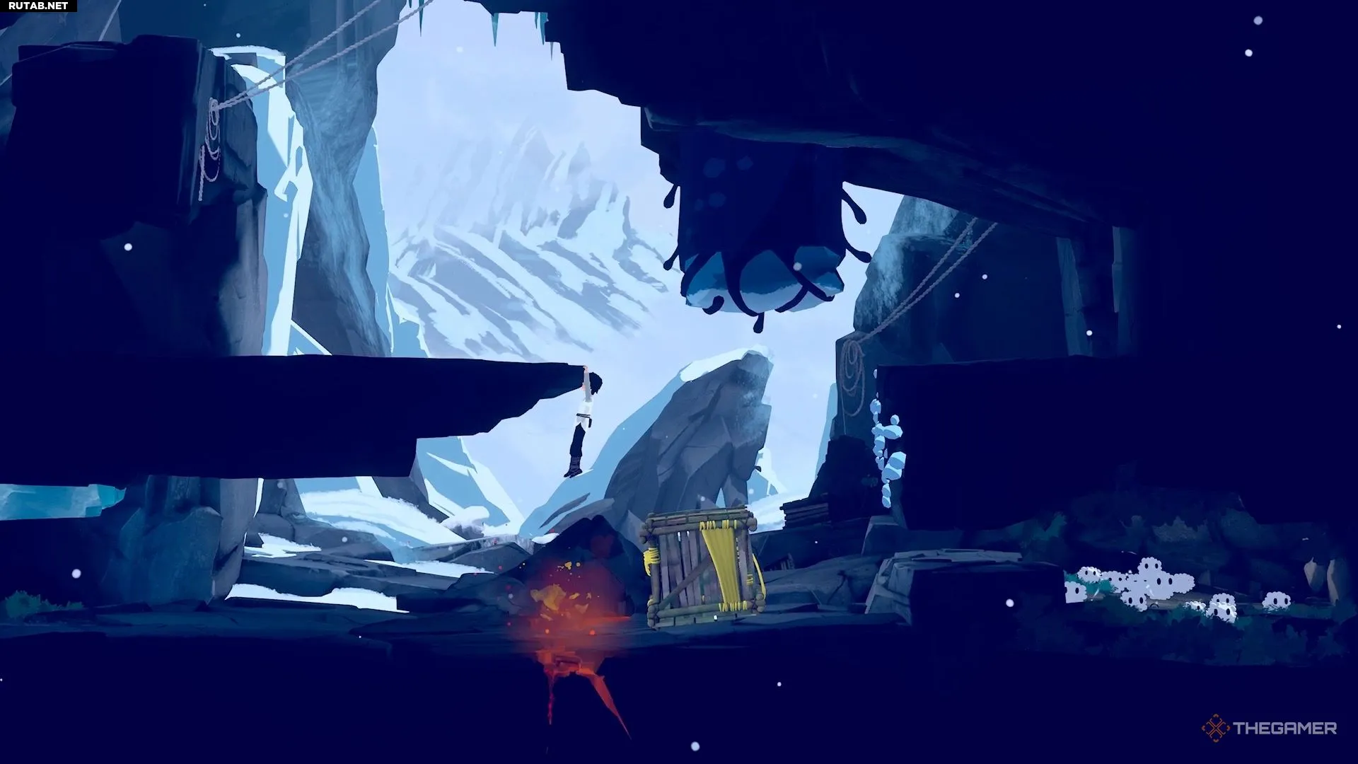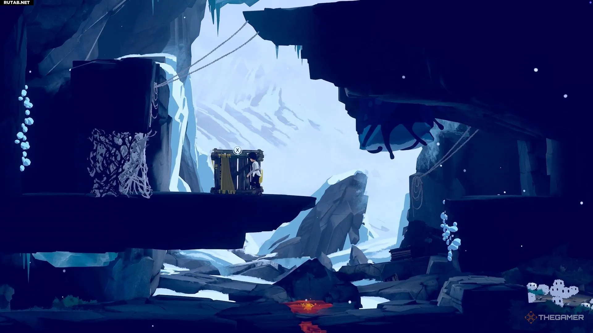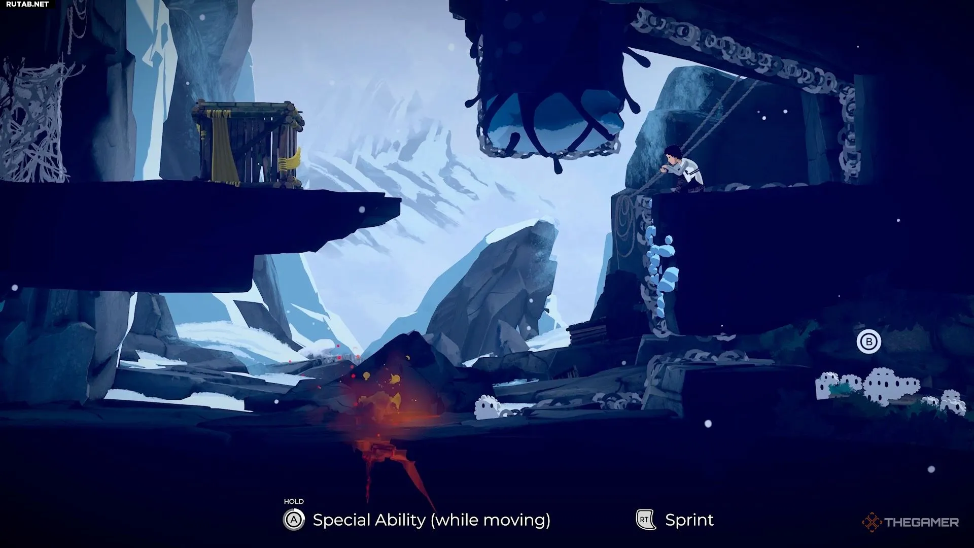 Чтобы начать главу, бегите вперёд, пока не достигнете стены с выступами синего льда. Используйте их, чтобы забраться наверх.