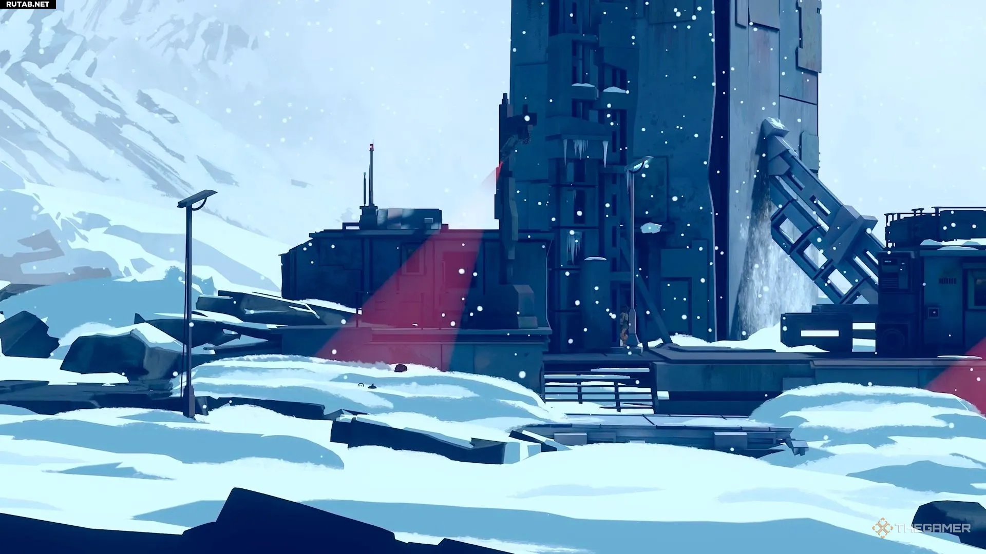 Выйдя наружу, вы наткнётесь на несколько камер с красными огоньками. Если они увидят вас в свете этих огоньков, это мгновенная смерть. К счастью, под ними лежат большие сугробы, в которых можно спрятаться, присев. Вы даже можете двигаться, сидя в снегу, и камеры вас не заметят. Используйте эту технику, чтобы проскользнуть мимо.