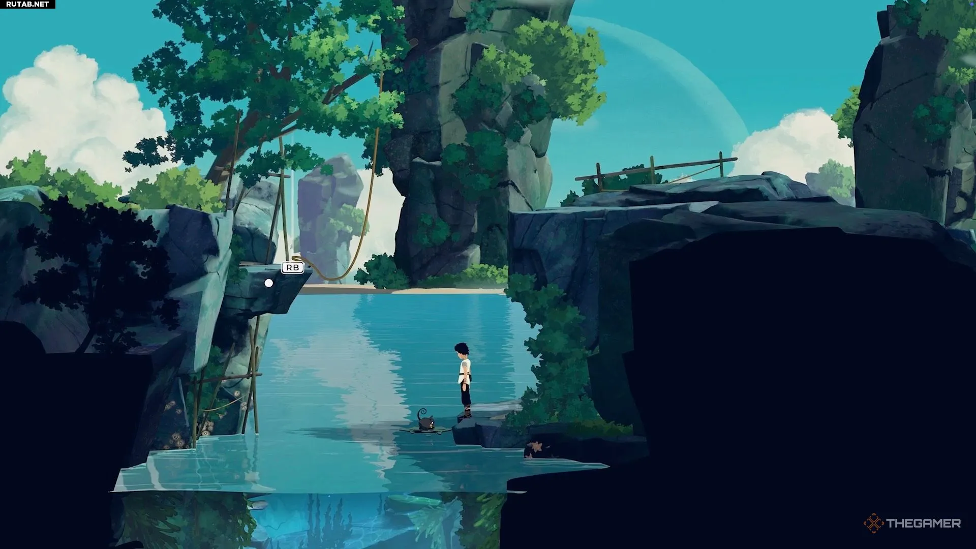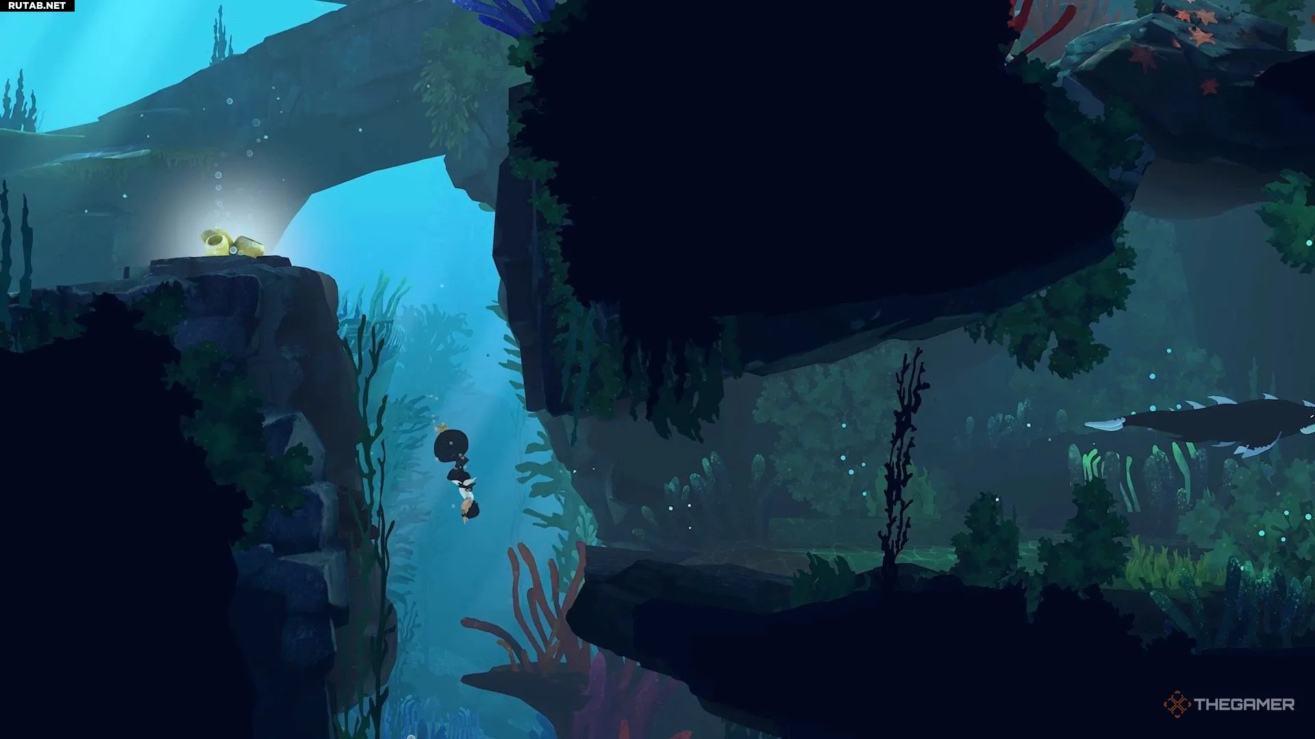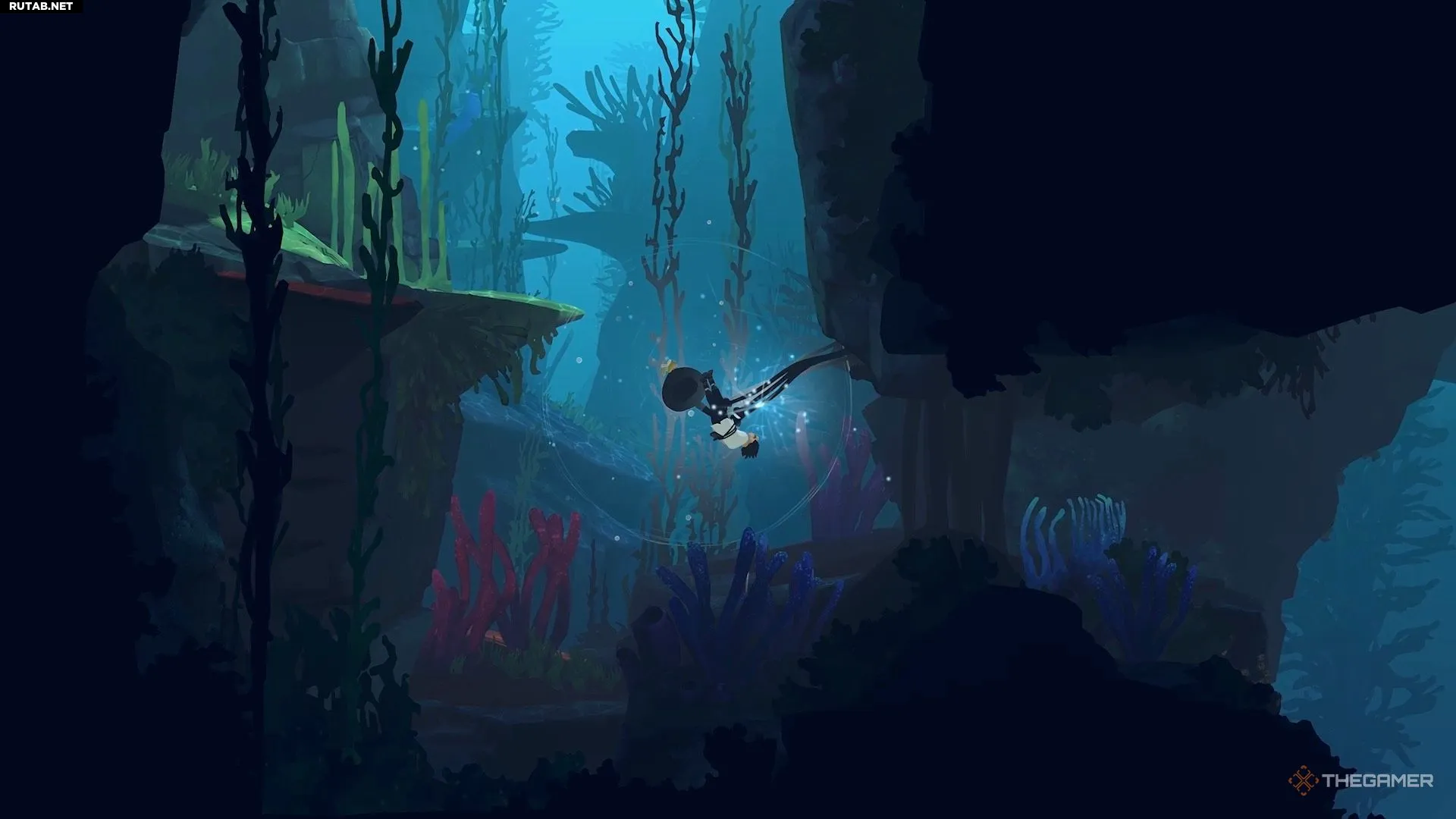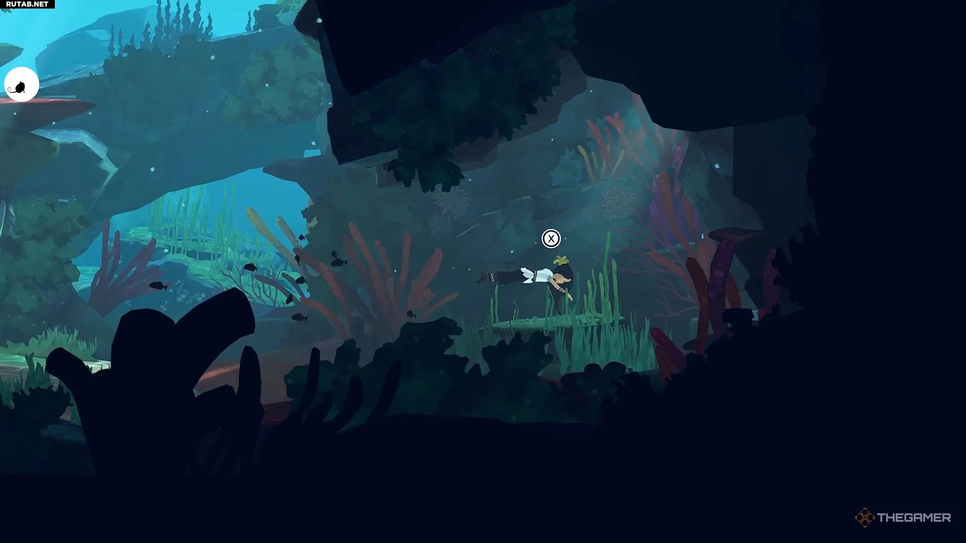 Добравшись до следующего водоёма, вы заметите, что для Муи нет очевидного способа его преодолеть. Здесь игра знакомит вас с новым предметом. Нырните под воду и плывите вниз направо, чтобы найти его. Он выглядит как чёрно-жёлтое растение.
