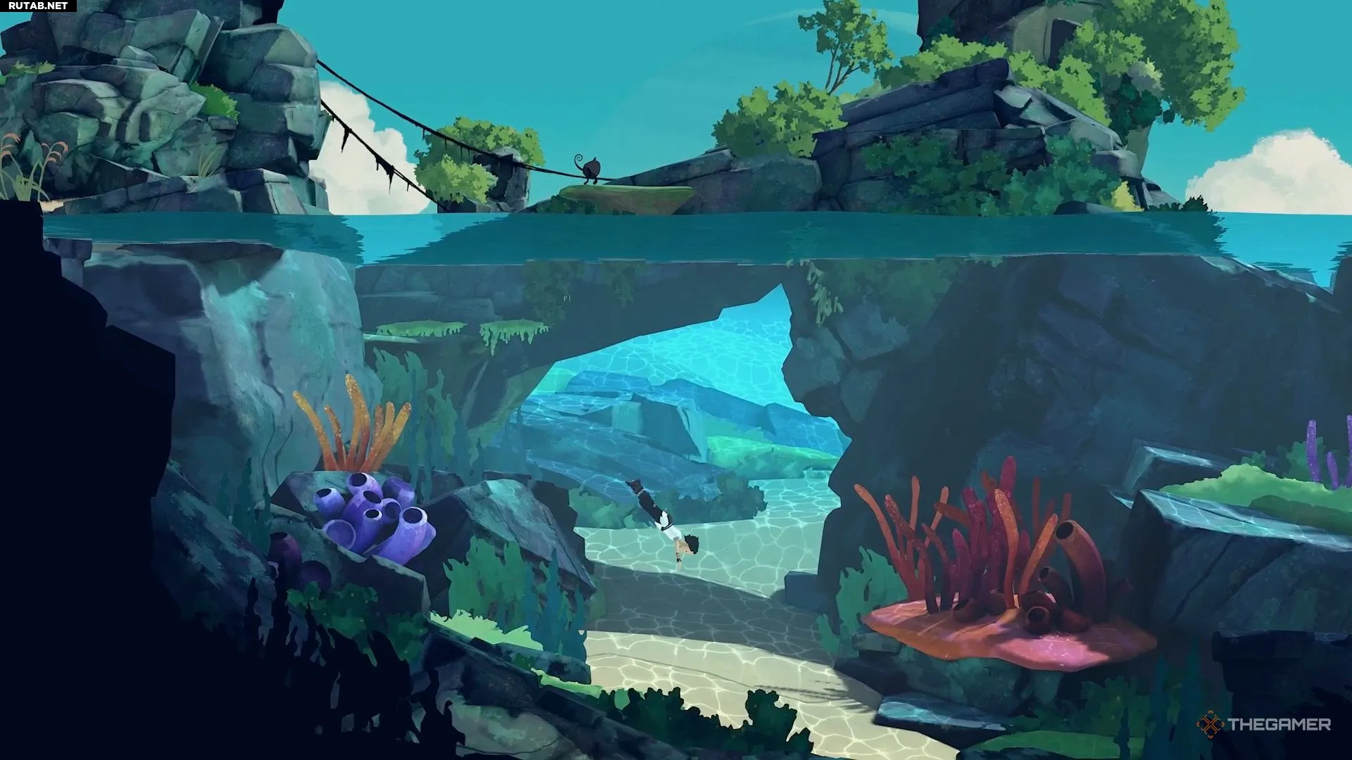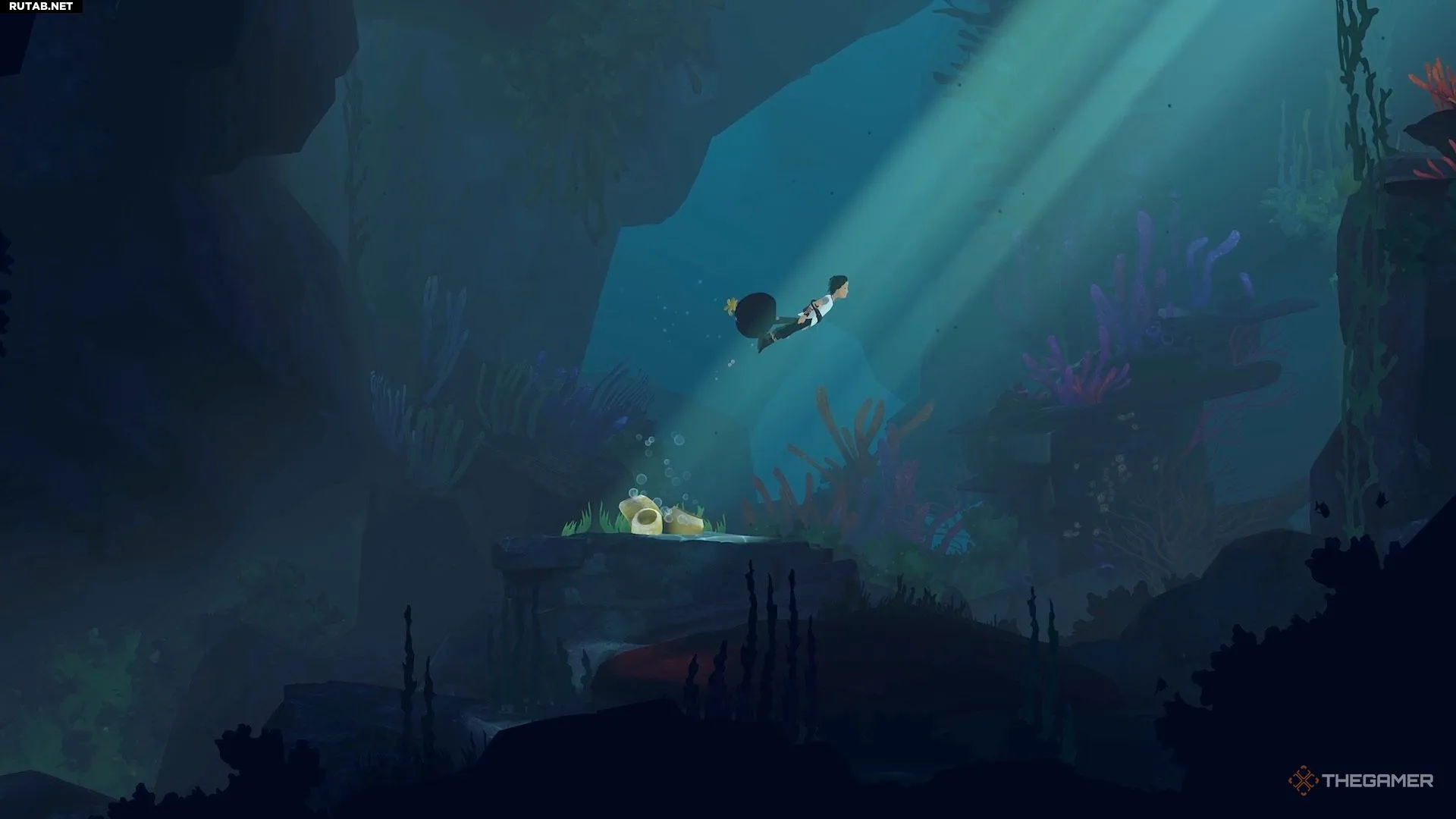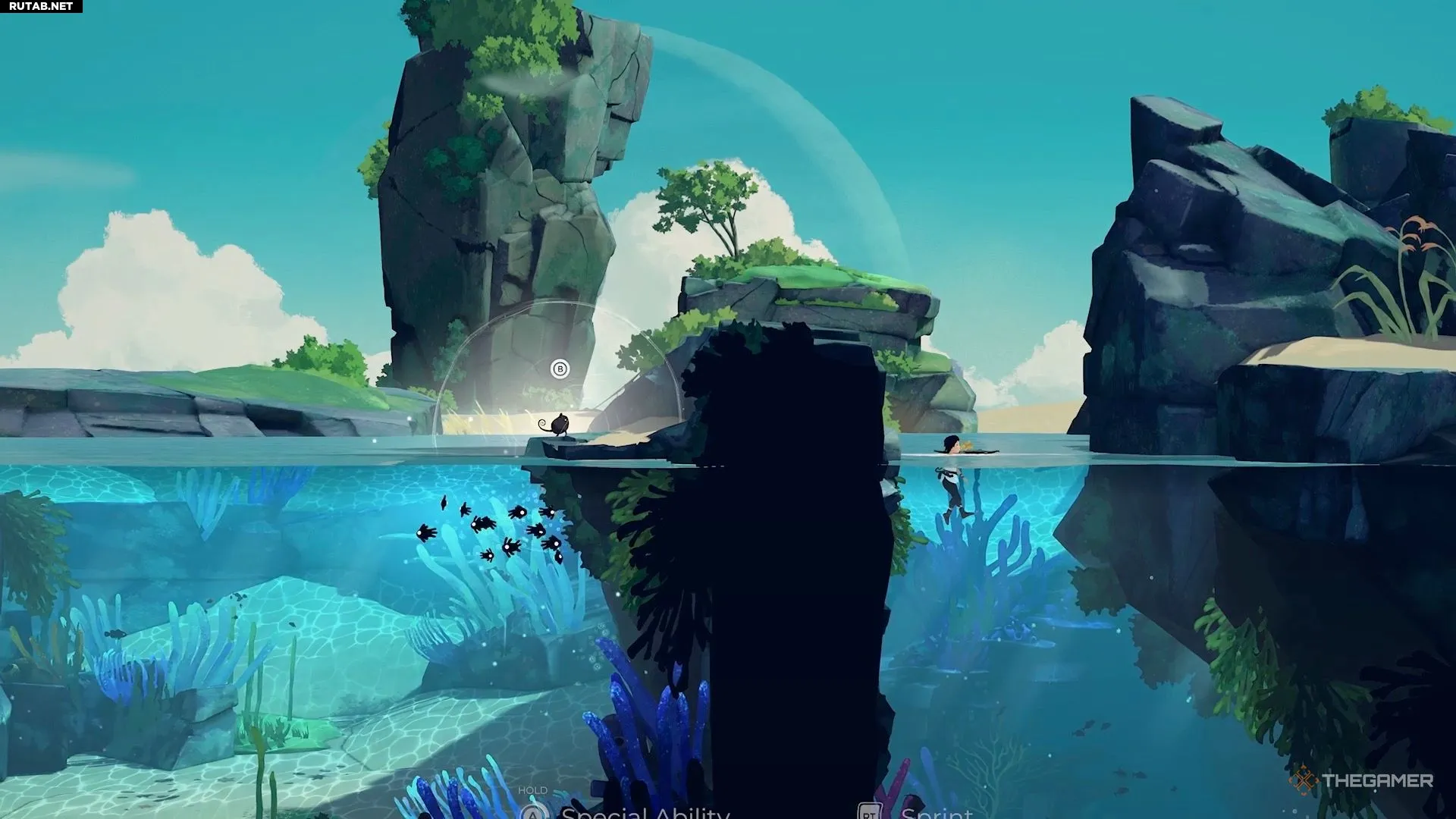 Добравшись до следующего водоёма, вы заметите, что для Муи нет очевидного способа его преодолеть. Здесь игра знакомит вас с новым предметом. Нырните под воду и плывите вниз направо, чтобы найти его. Он выглядит как чёрно-жёлтое растение.