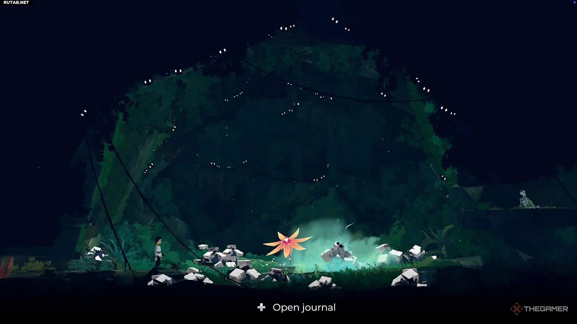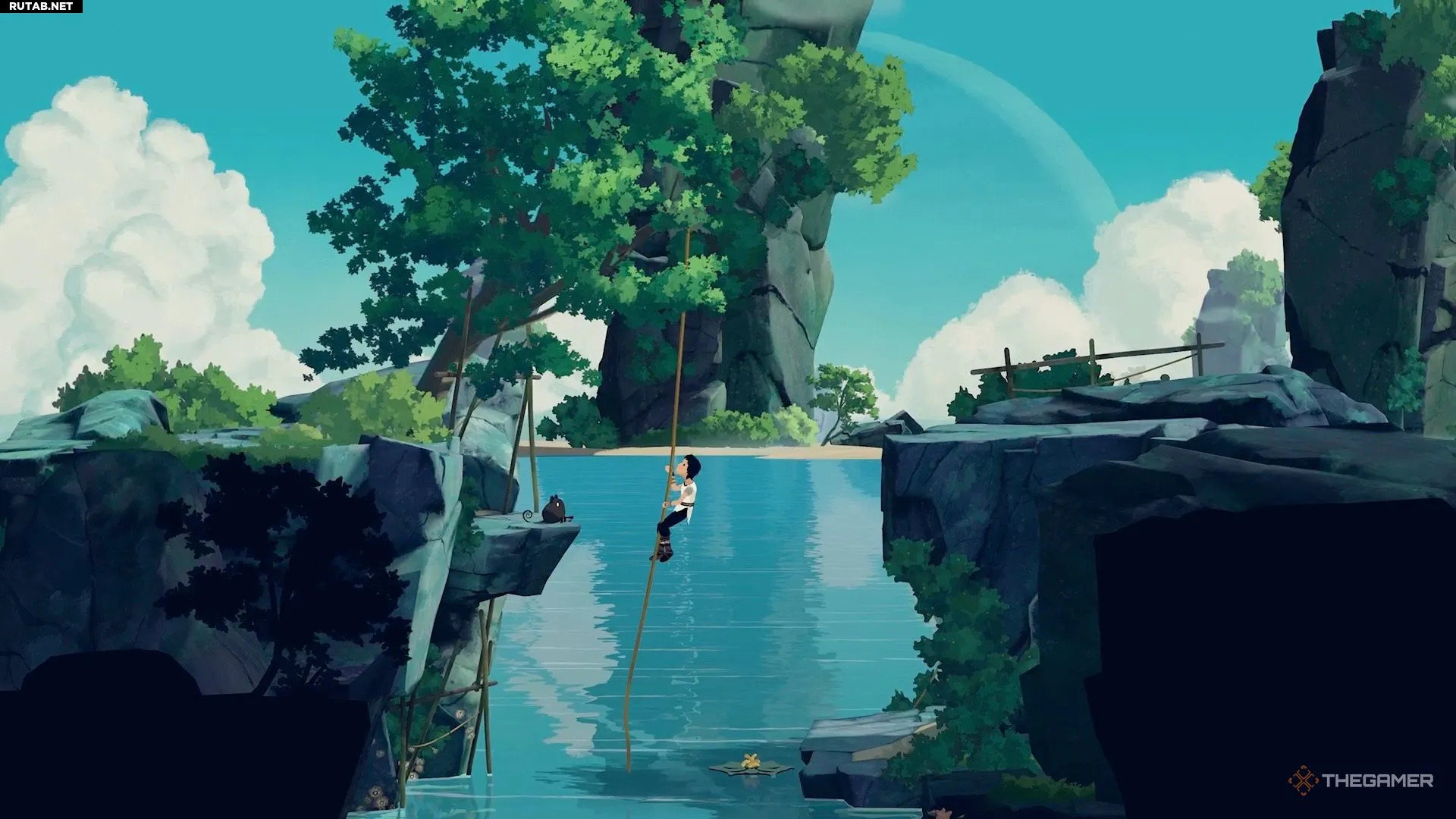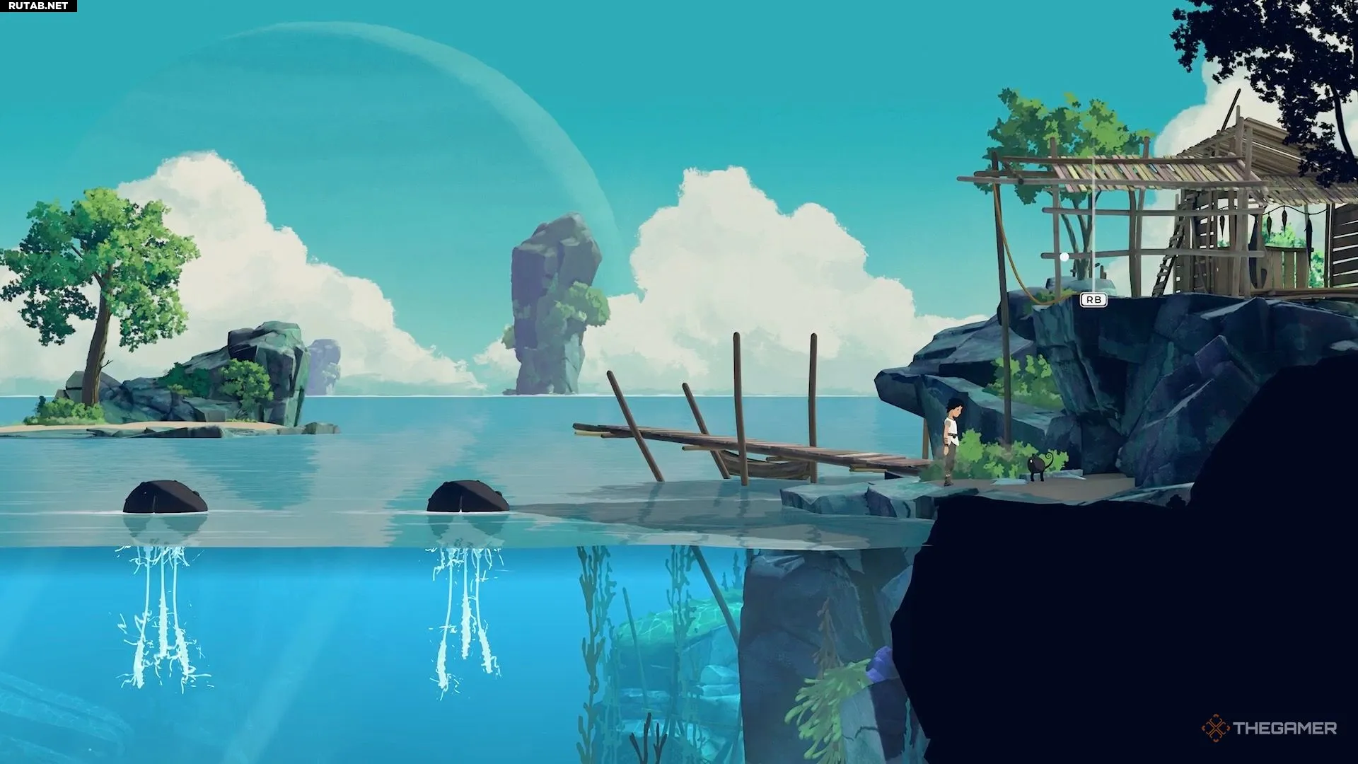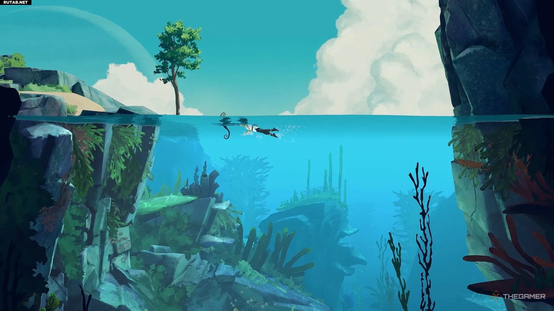 Добравшись до следующего водоёма, вы заметите, что для Муи нет очевидного способа его преодолеть. Здесь игра знакомит вас с новым предметом. Нырните под воду и плывите вниз направо, чтобы найти его. Он выглядит как чёрно-жёлтое растение.