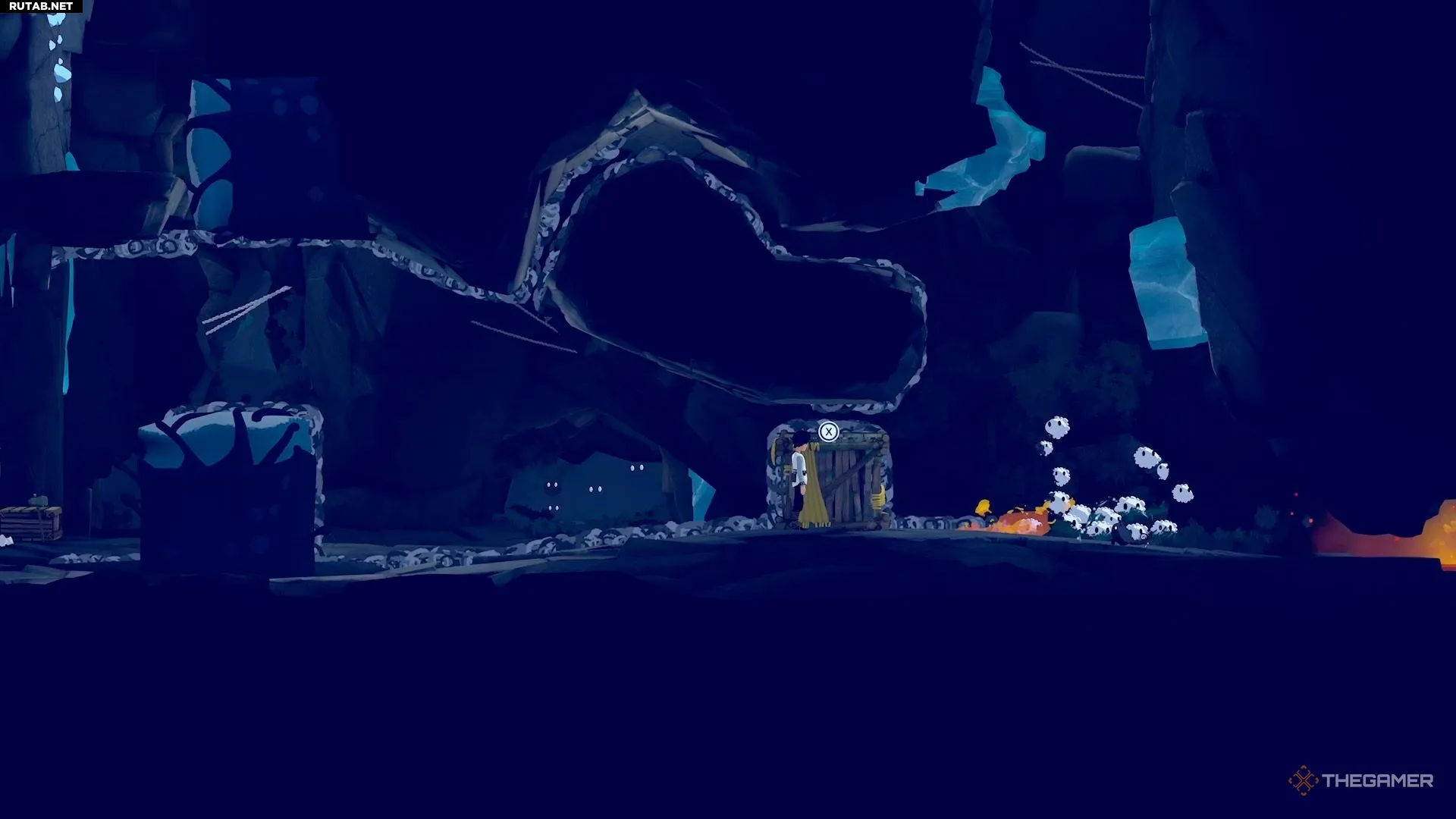 Стяните ящик вниз и установите его слева от огня. Он должен быть достаточно близко к потолку, чтобы белое существо могло перепрыгнуть между ними.