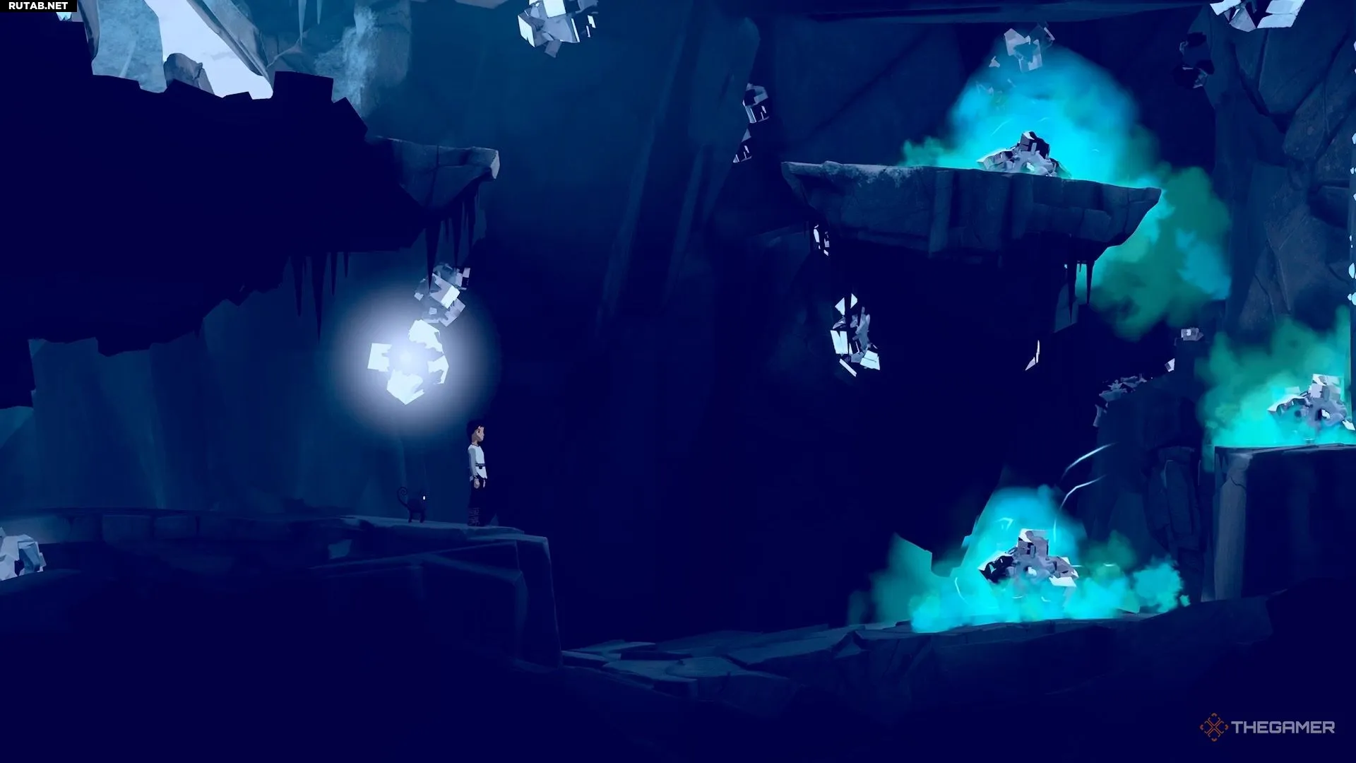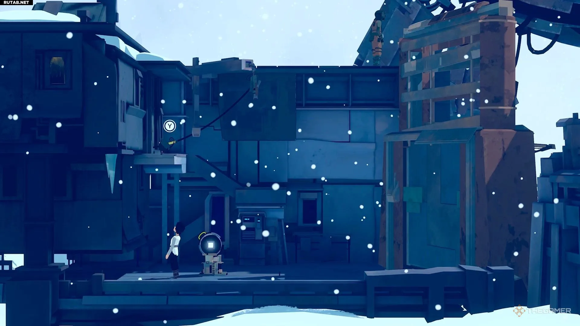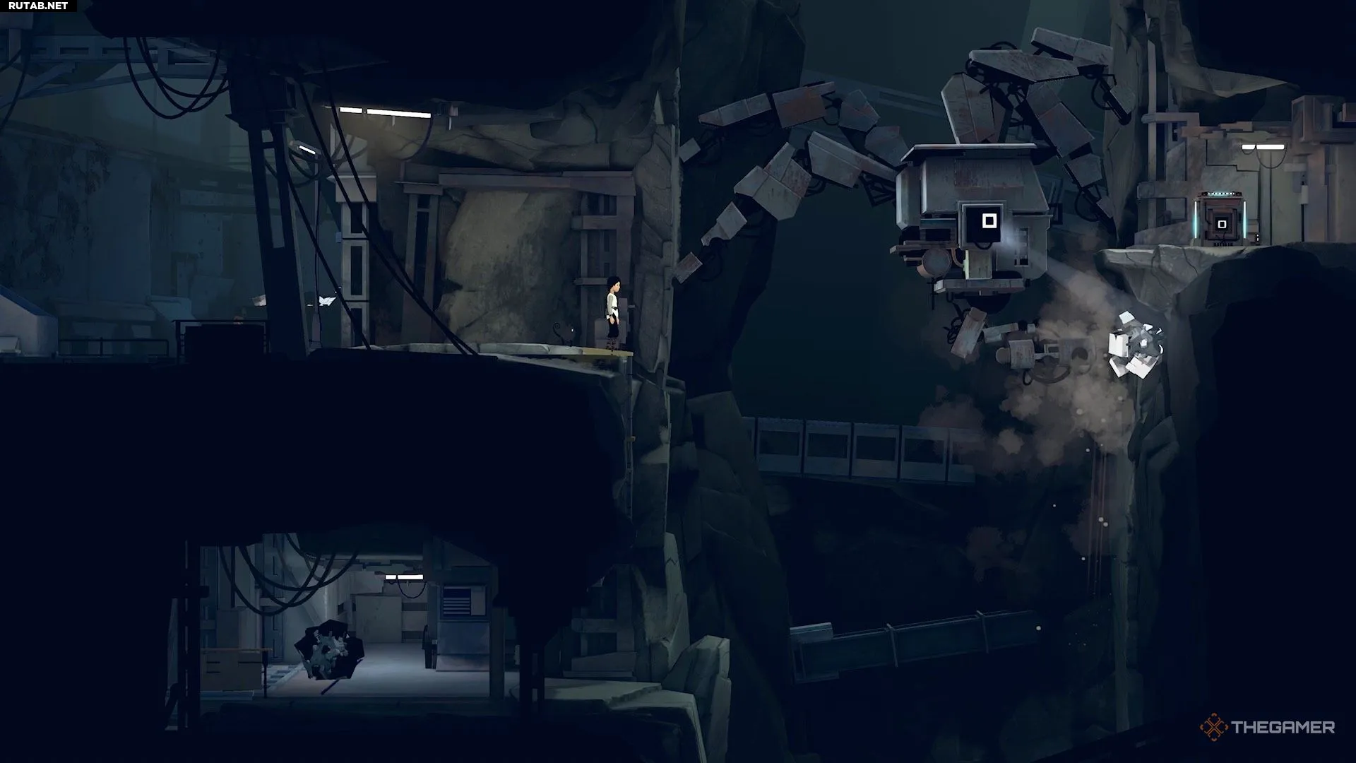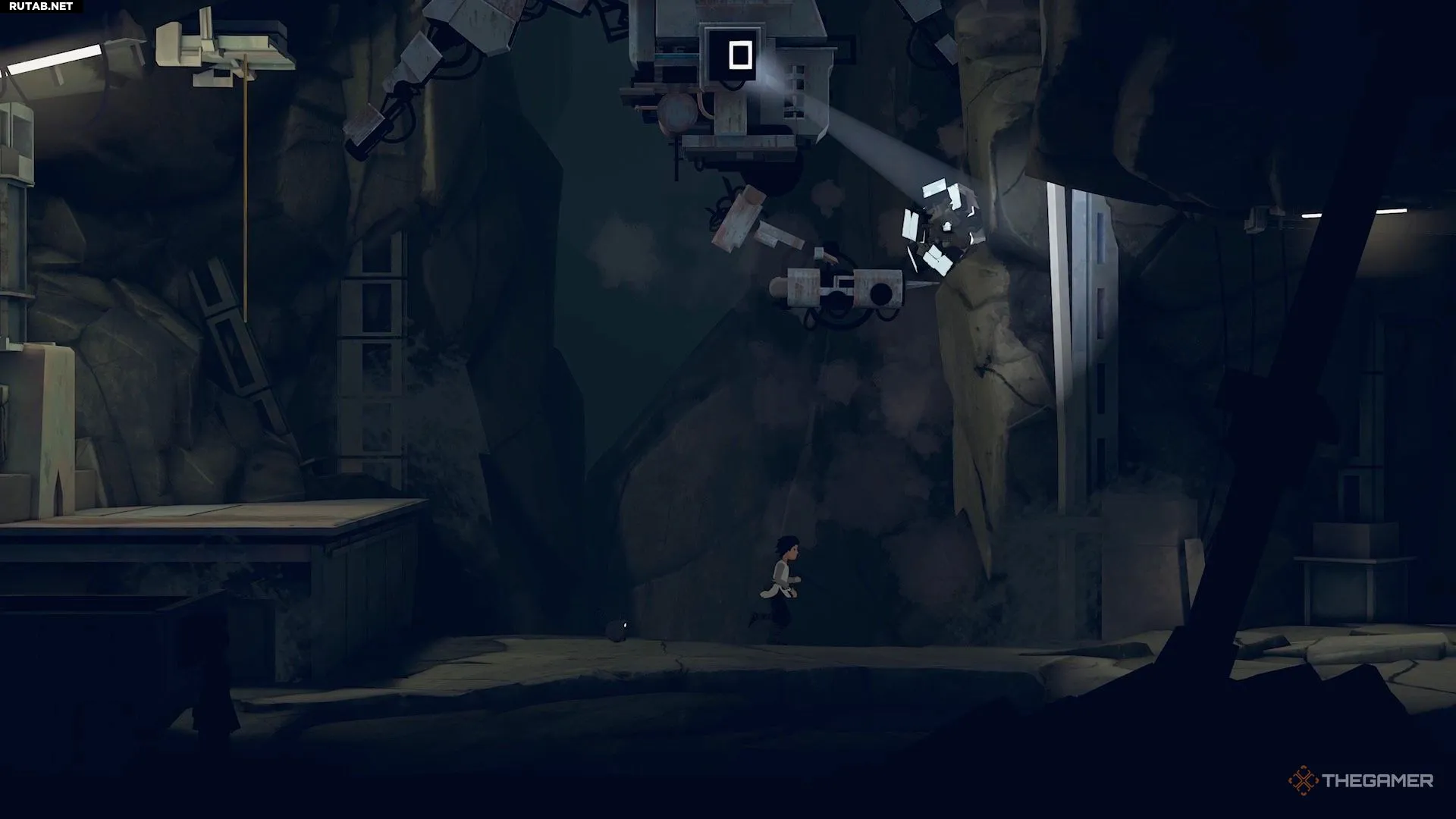Затем подтащите руду к верхнему уступу. Это привлечёт внимание робота и поставит его в такое положение, что вы сможете запрыгнуть ему на голову. Взберитесь на него и перепрыгните через пропасть.