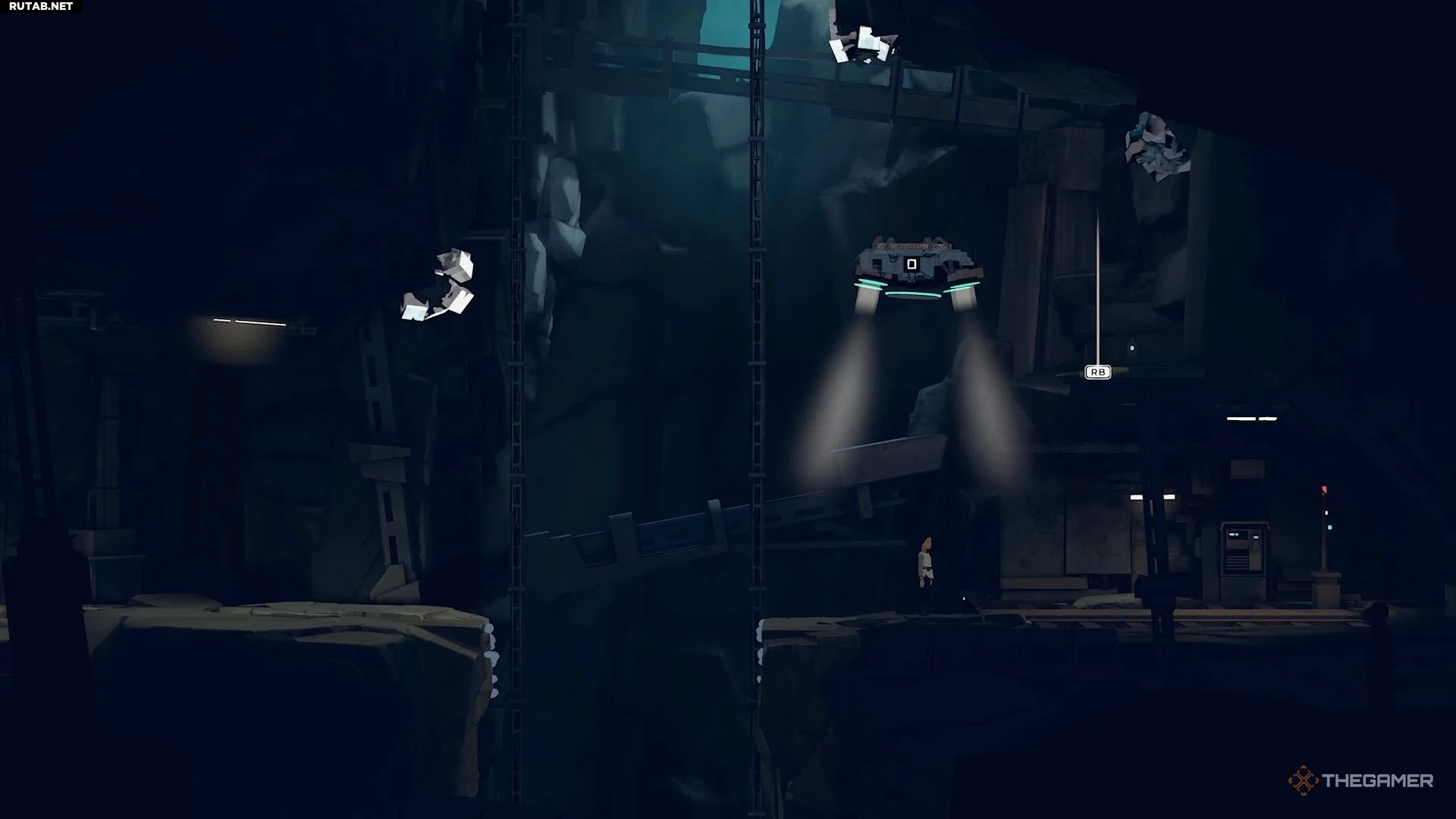 Лифт доставит вас в зону с верёвкой и большим шахтёрским роботом. Пройдите мимо них, чтобы найти другую область с летающим роботом.