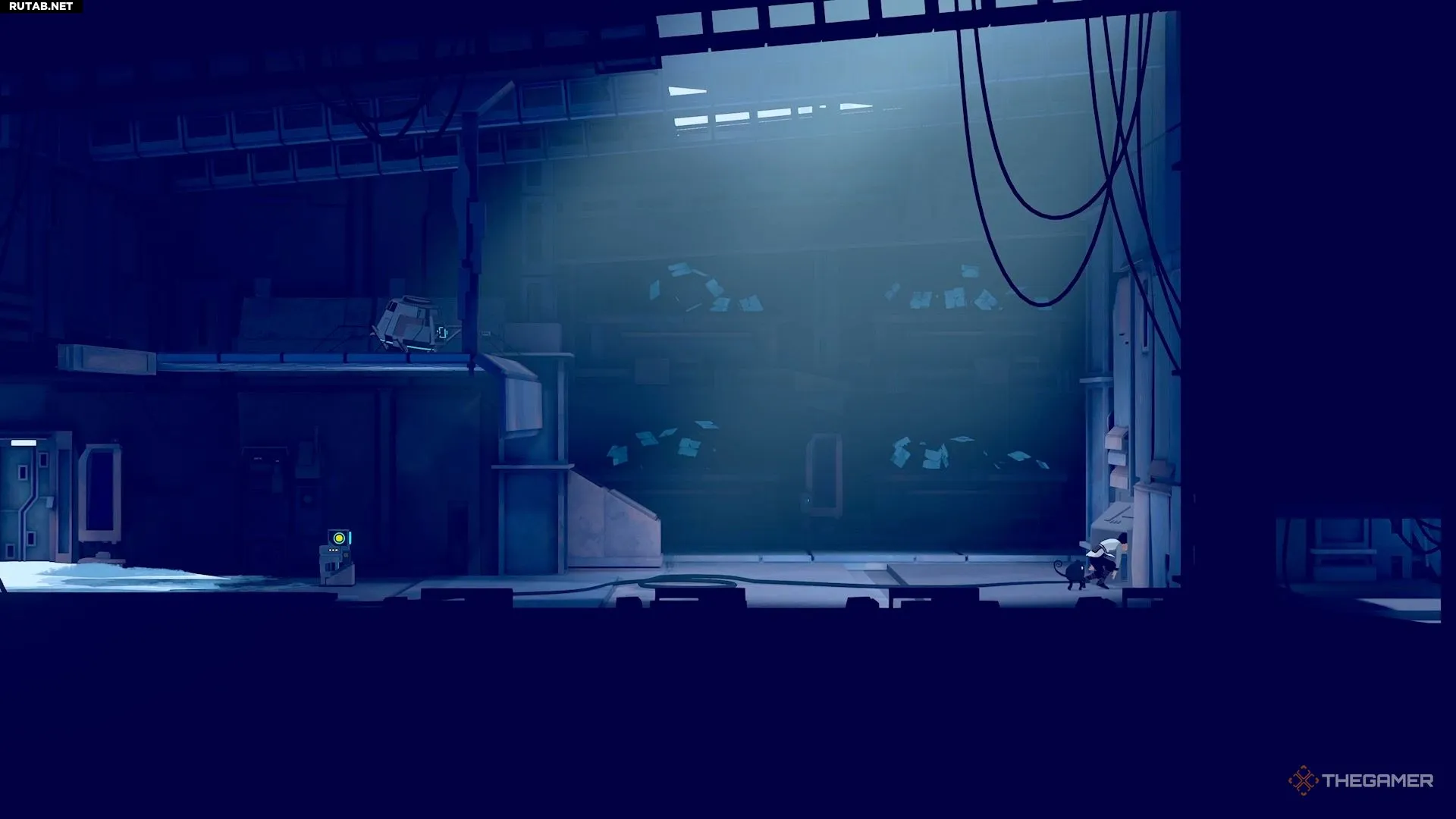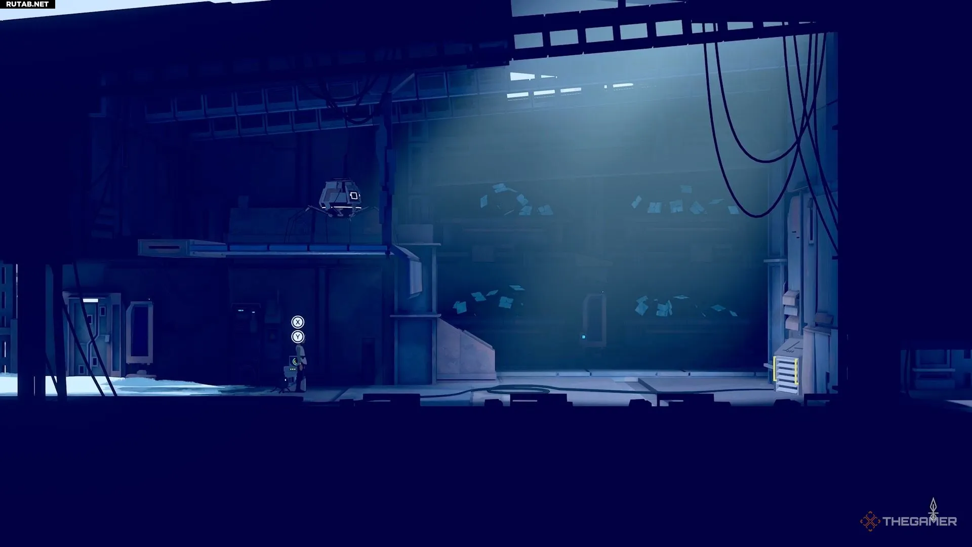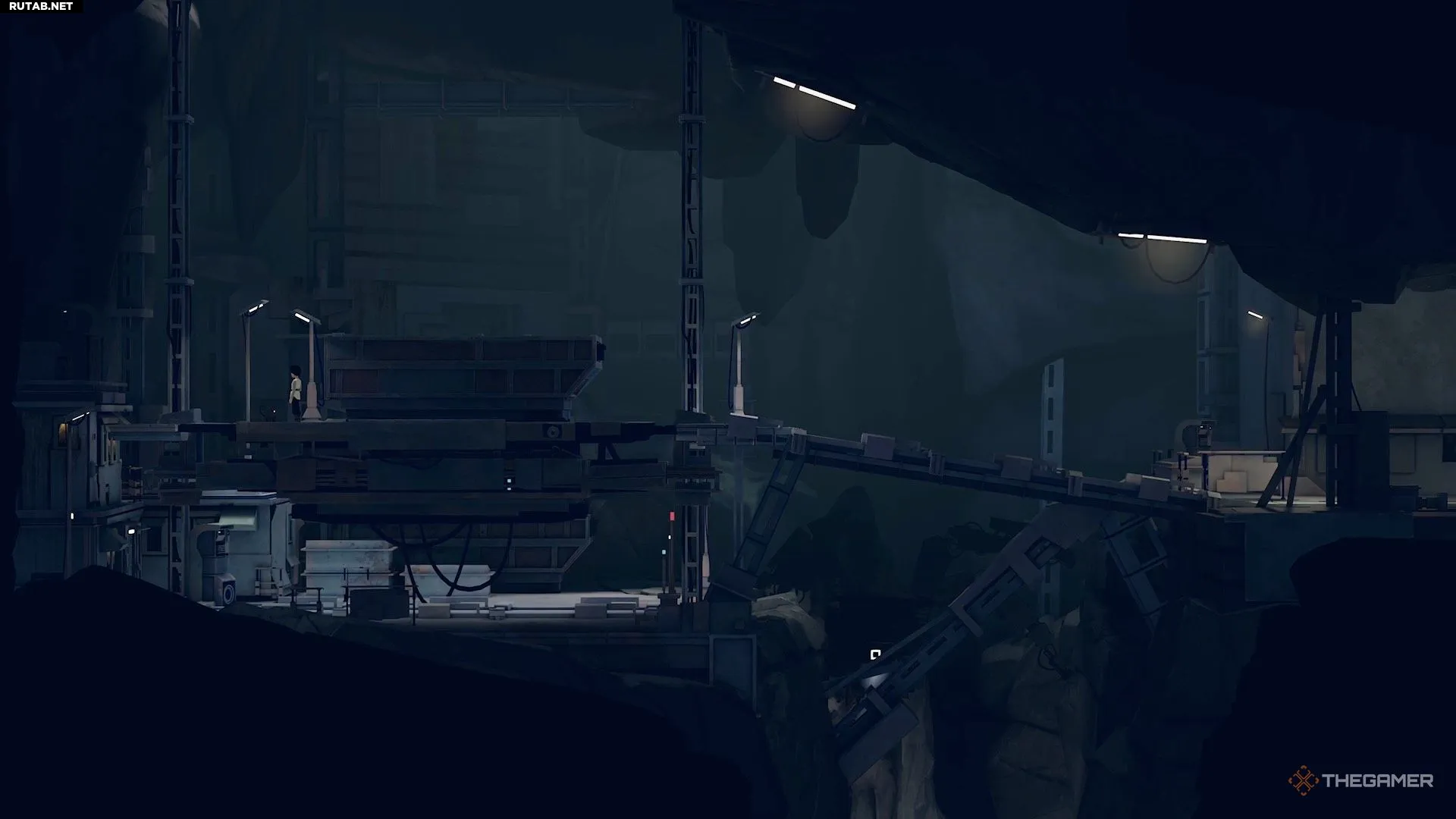 Далее вы пройдёте некоторое расстояние, пока не встретите ещё одного робота. Он находится на платформе и смотрит в сторону решётки на противоположной стороне комнаты. Эта решётка — ваш единственный выход. Однако робот заметит вас, если вы попытаетесь к ней пробежать.