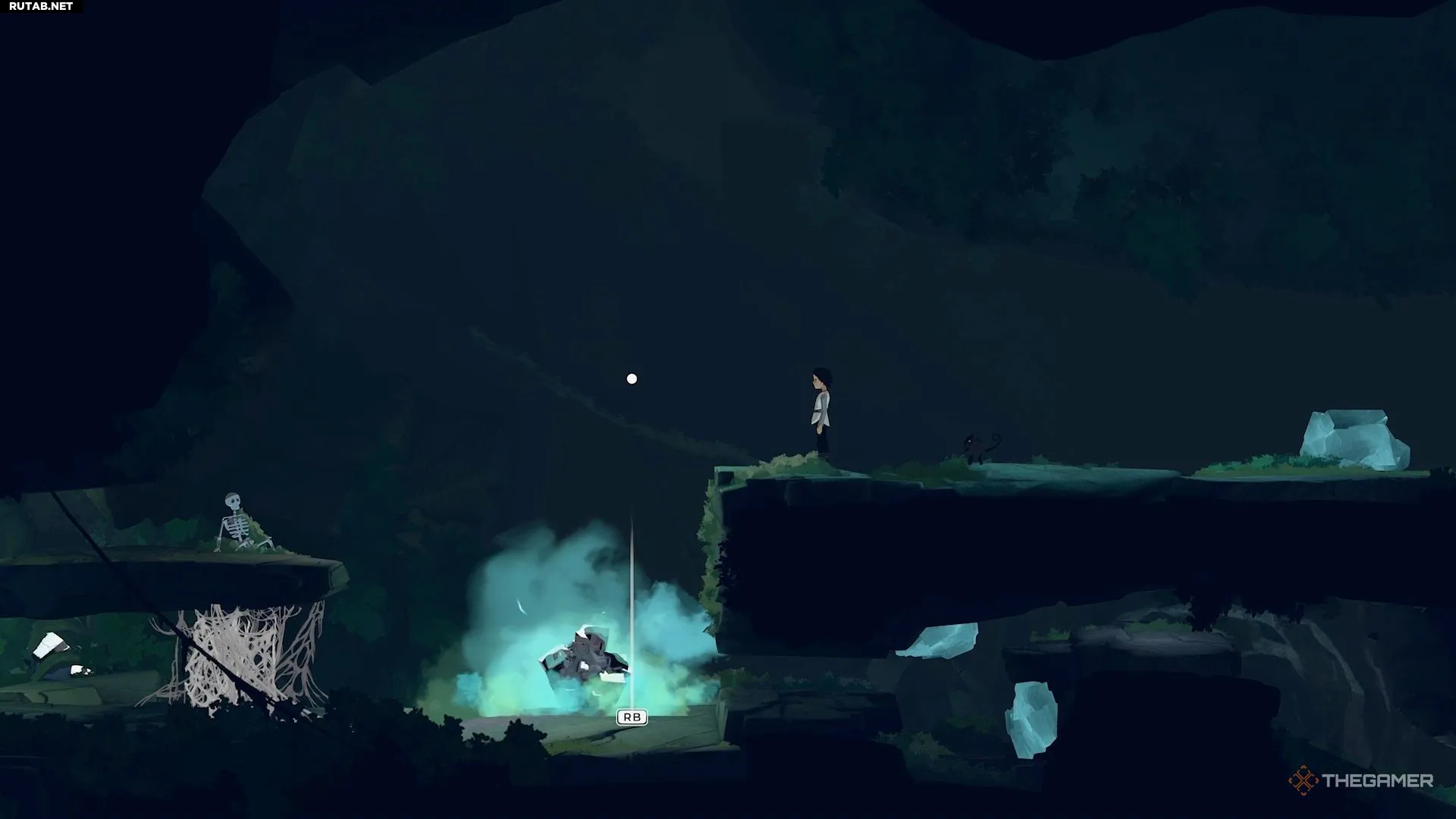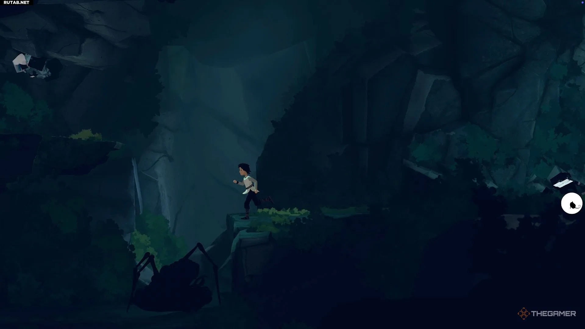 Это приведёт вас к краю обрыва. Запрыгните на скалу сверху и двигайтесь вдоль неё. В конце концов вы окажетесь там, где находятся руда и паутина.