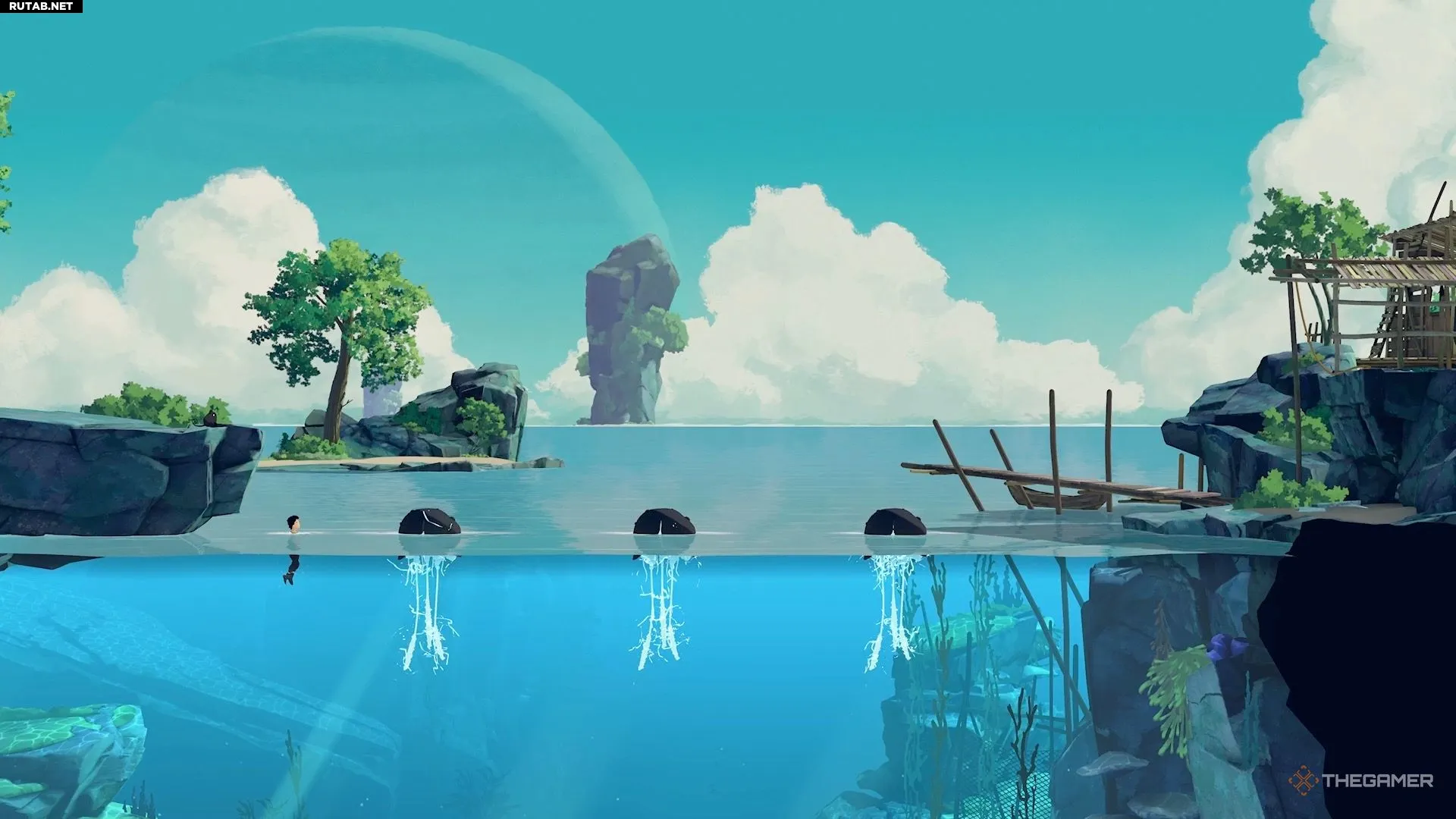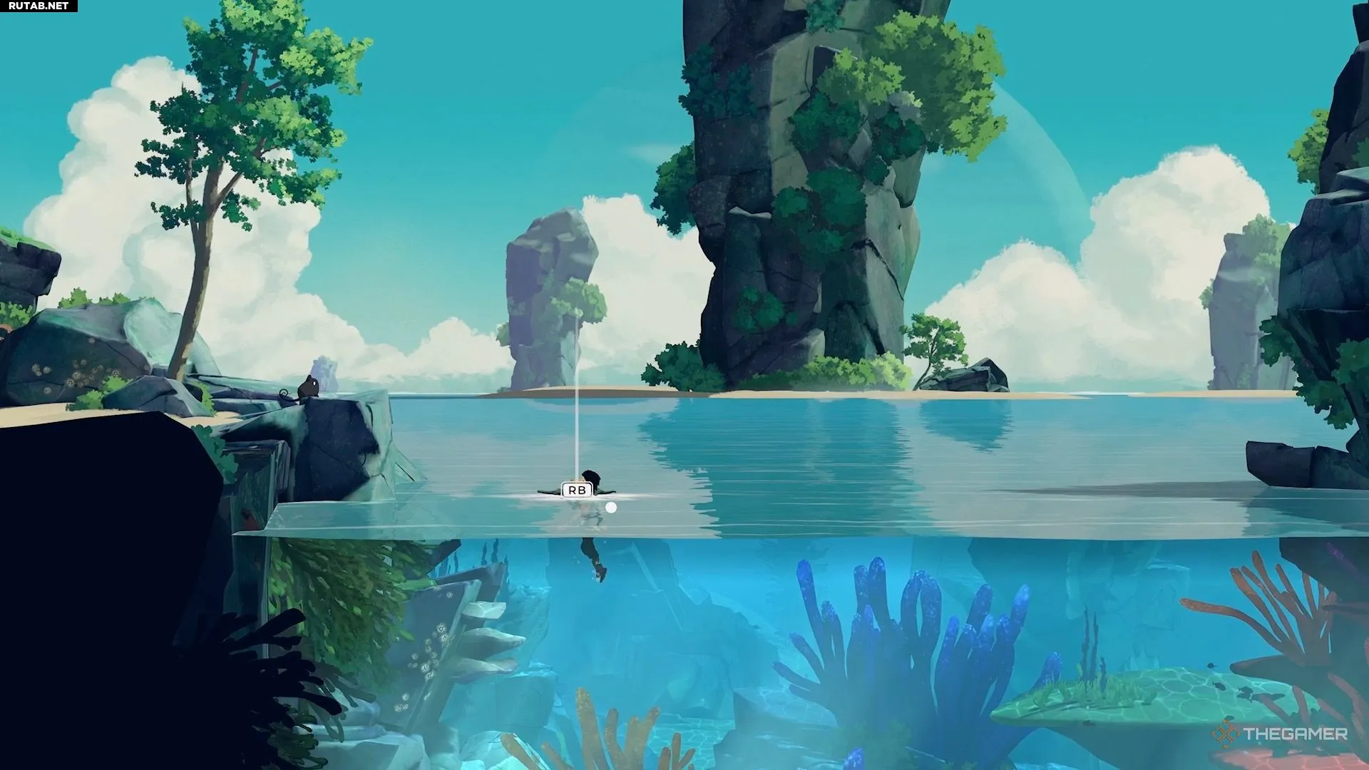 Достигнув поверхности, поверните налево и заберитесь на остров.