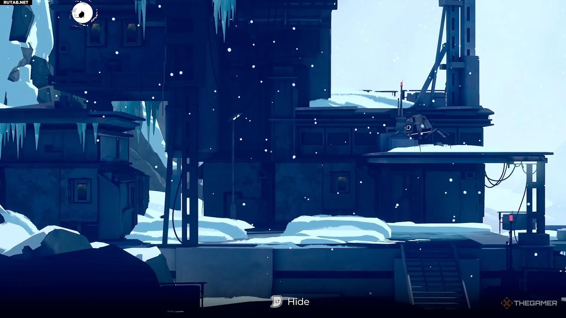 Далее вы попадёте в зону, где одна камера управляется кнопкой. Нажмите кнопку, чтобы камера повернулась в другую сторону, затем спустите Муи вниз и спрячьте её в снегу. После этого снова нажмите кнопку, чтобы вернуть камеру на место.