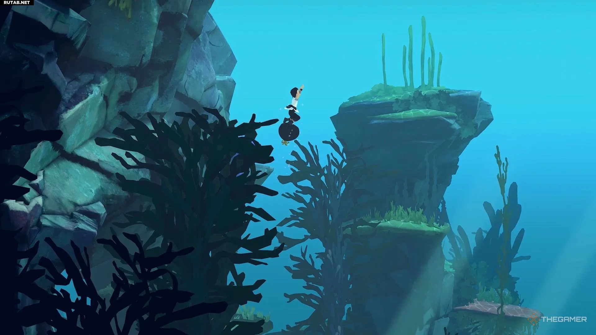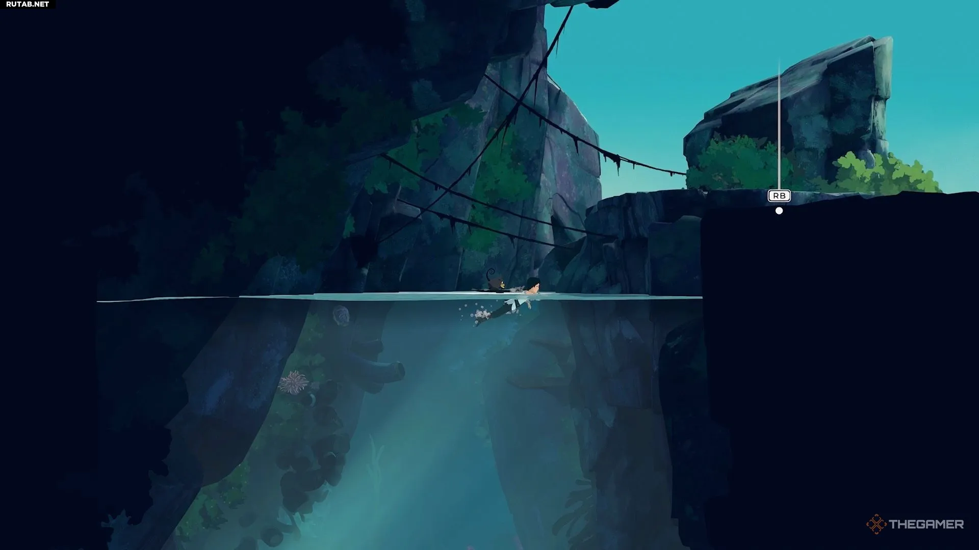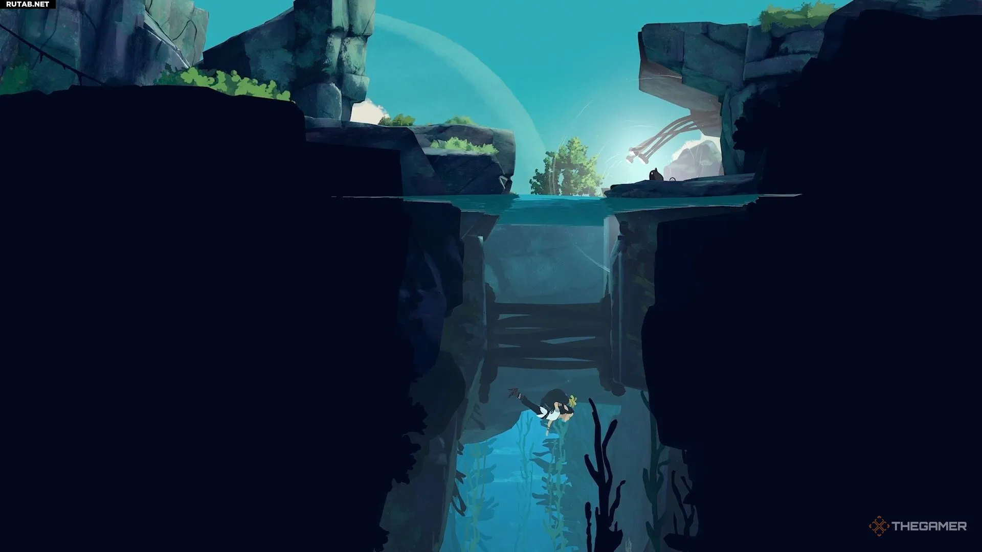 В следующем водоёме вас ждёт новая механика. Сначала нырните в воду и найдите разлом на дне. Внутри вы обнаружите ещё одно чёрно-жёлтое растение. Используйте его, чтобы спустить Муи под воду.