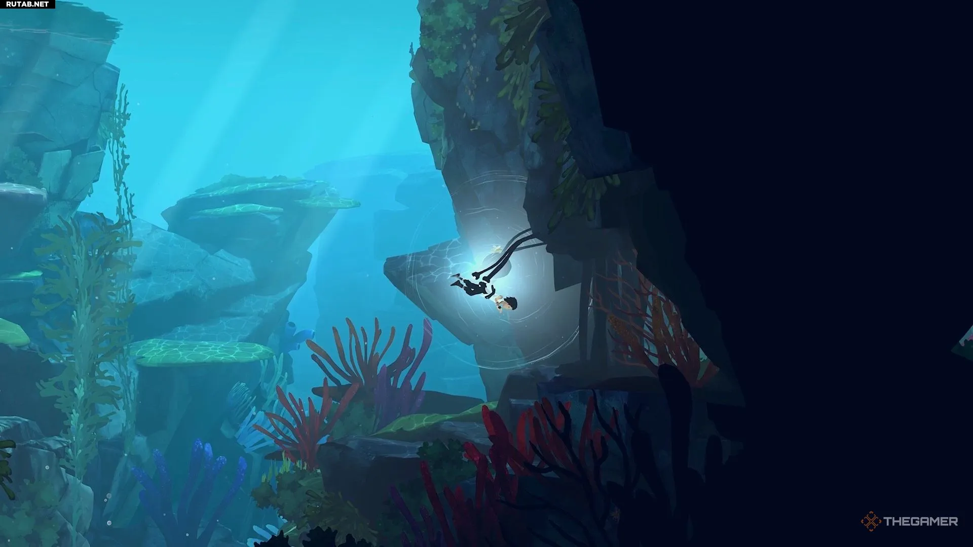 Проплывите под большой скалой в центре и выйдите на поверхность с другой стороны.