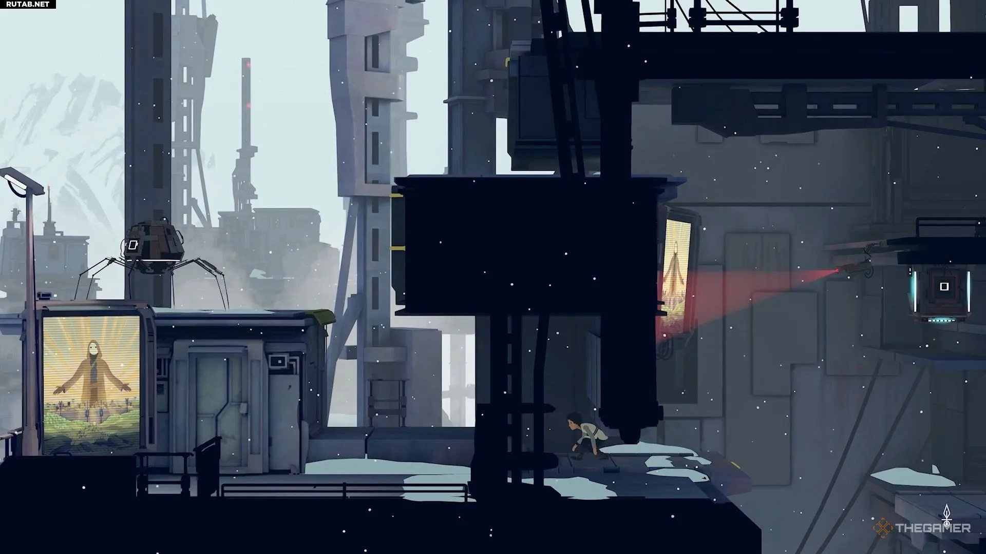 Оказавшись под платформой, дождитесь, пока робот снова отвернётся, и бегите через мост. Присядьте, чтобы просочиться в узкую щель в конце.