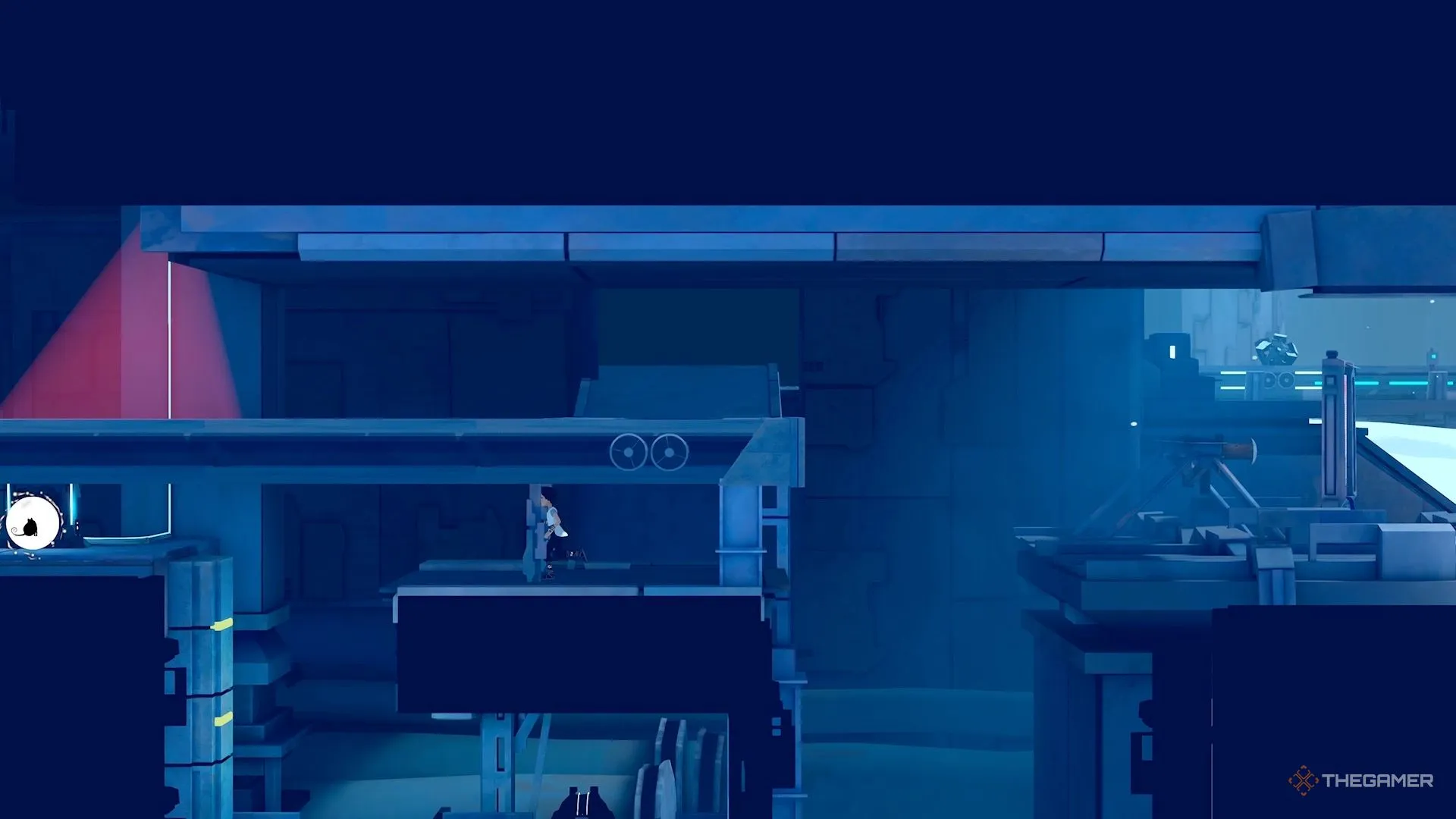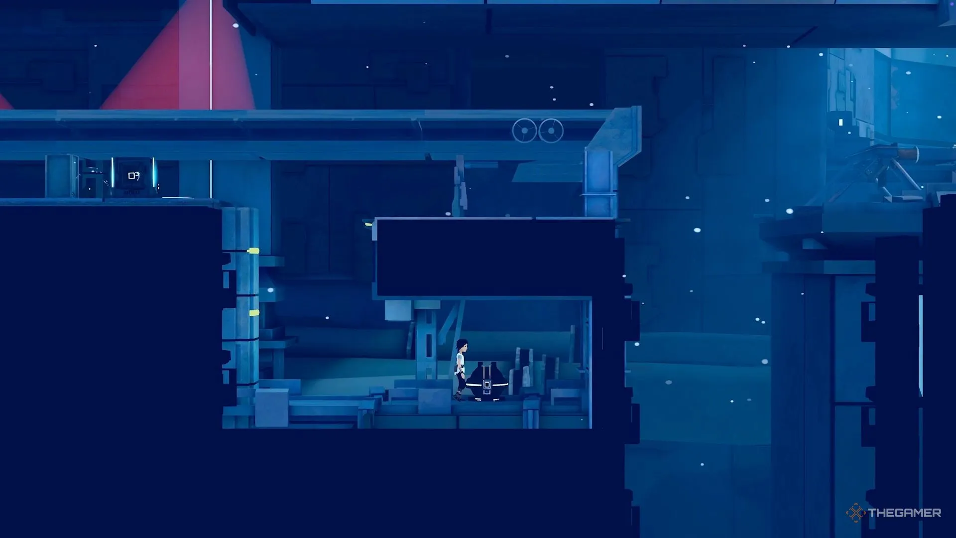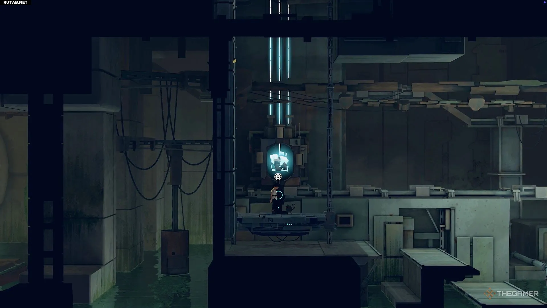 Позднее на уровне вы столкнётесь с большими давящими механизмами, через которые нужно пробежать, чтобы не быть раздавленным. После того как вы преодолеете второй механизм, продолжите движение вправо, чтобы найти небольшую секретную зону. Внутри неё находится сундук с голограммой.