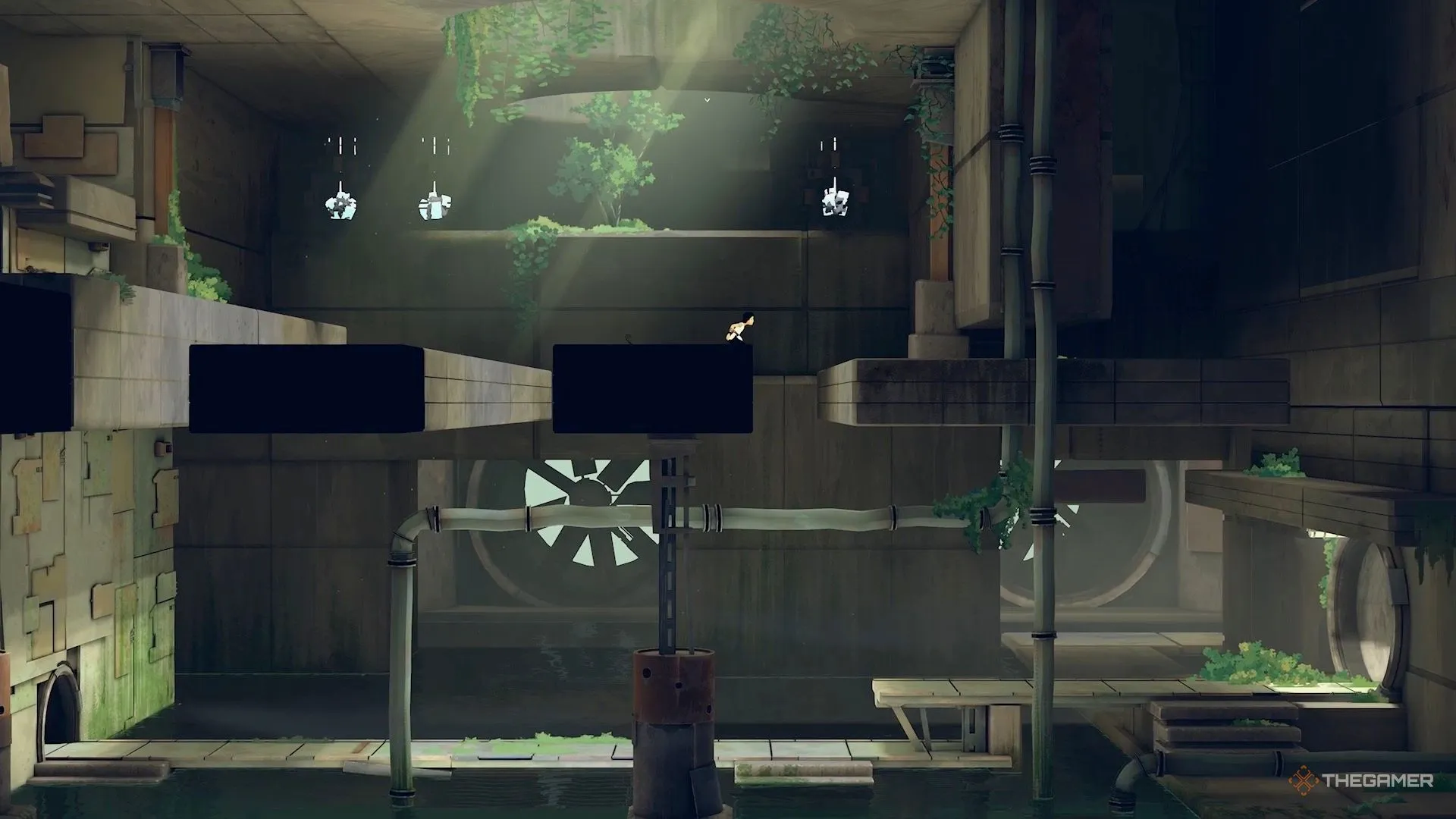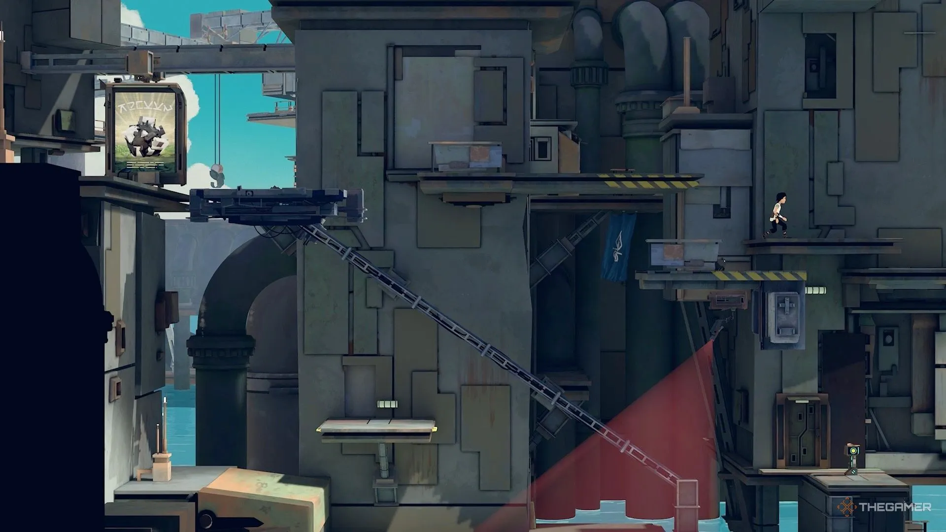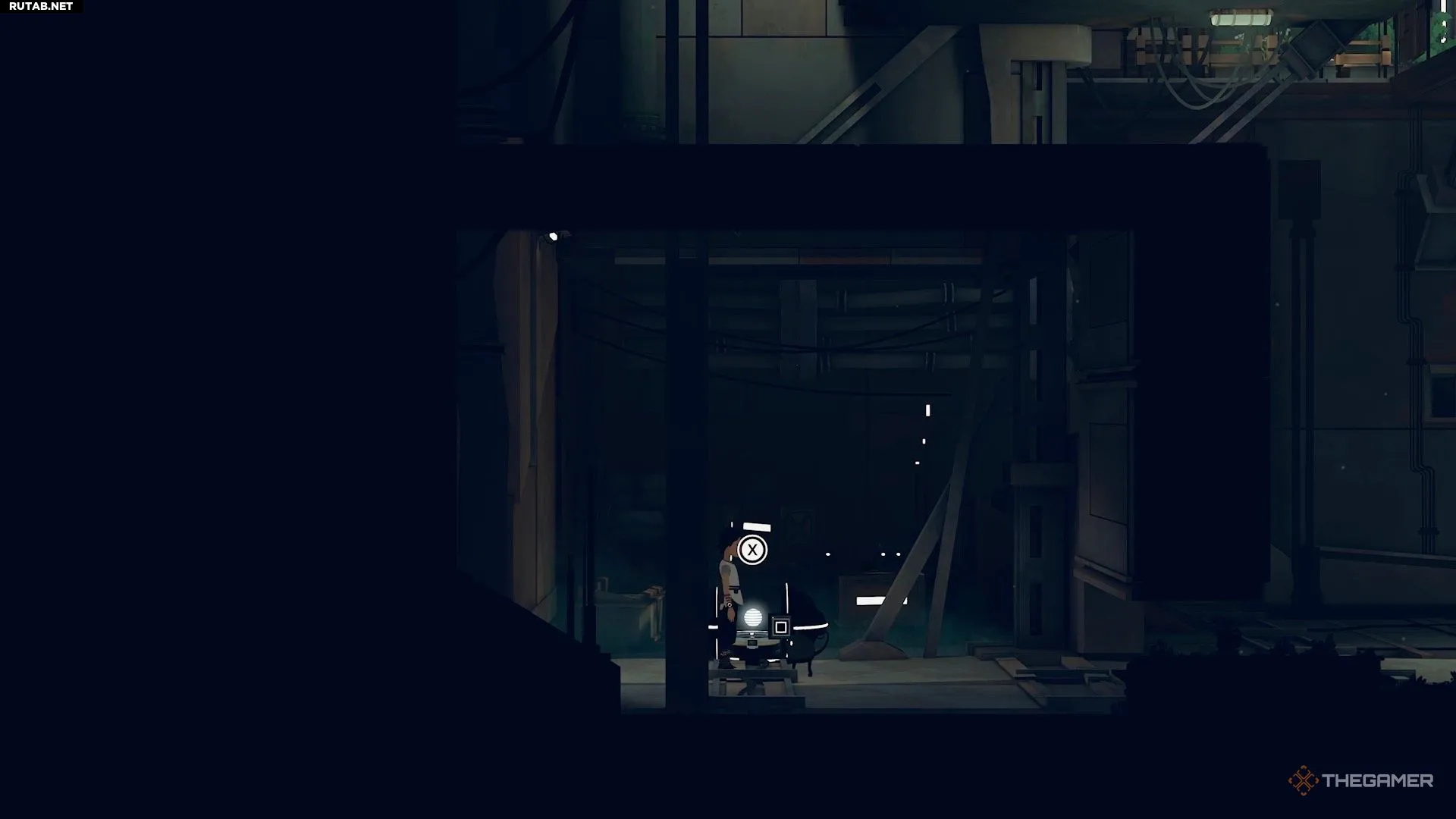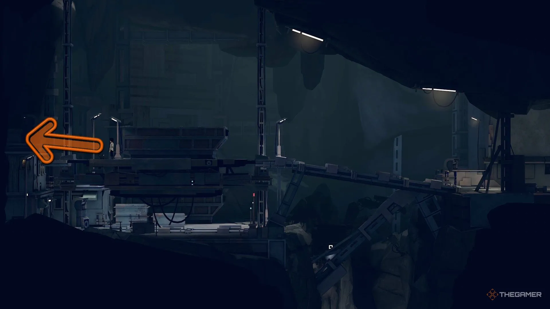Позднее на уровне вы столкнётесь с большими давящими механизмами, через которые нужно пробежать, чтобы не быть раздавленным. После того как вы преодолеете второй механизм, продолжите движение вправо, чтобы найти небольшую секретную зону. Внутри неё находится сундук с голограммой.