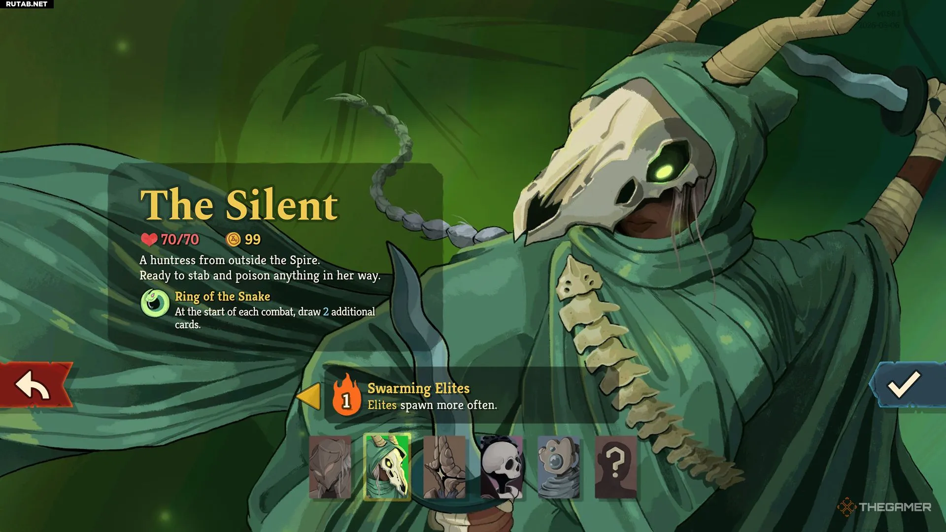 После вашего первого забега за Железного Клата Безмолвная откроется автоматически. Это второй вернувшийся персонаж. Её стиль игры построен вокруг карт «Яда», наносящих накапливающийся урон каждый ход, механик «Взять/сбросить» для тонкой настройки руки и «Шивов», позволяющих измотать врага множеством мелких атак.