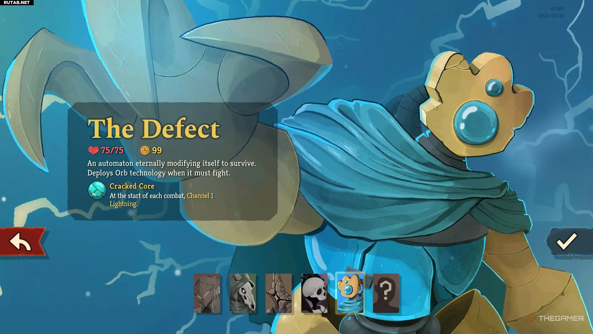 Дефект — третий и последний вернувшийся персонаж из первой игры. Его ключевая механика сосредоточена вокруг призыва различных Сфер (Orbs). Каждый тип Сферы активируется в конце хода, нанося урон, накладывая эффекты или обеспечивая защиту.