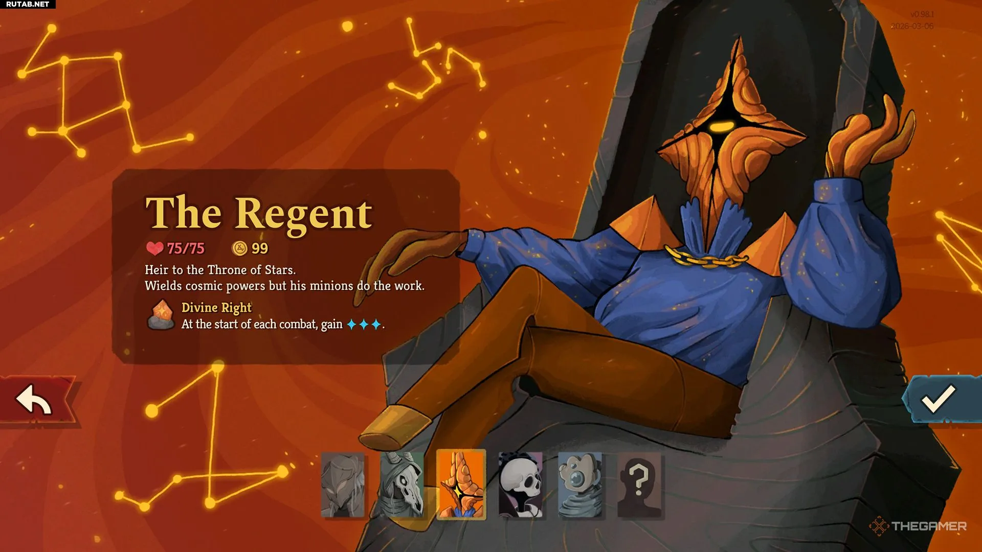 Регент — первый новый персонаж в Slay the Spire 2. У него есть уникальный вторичный тип энергии — «Звёзды» (Stars), которые можно зарабатывать и тратить с помощью карт. Также он имеет доступ к механике «Ковки» (Forge), позволяющей накапливать урон на одной атакующей карте из хода в ход для мощного финишного удара.