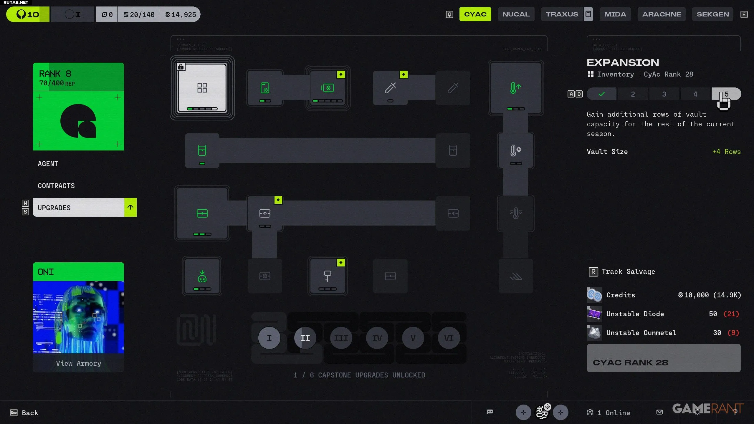 Игроки могут увеличить пространство Хранилища через улучшение «Расширение» у фракции CyberAcme. Это первая фракция, которая становится доступна в игре.