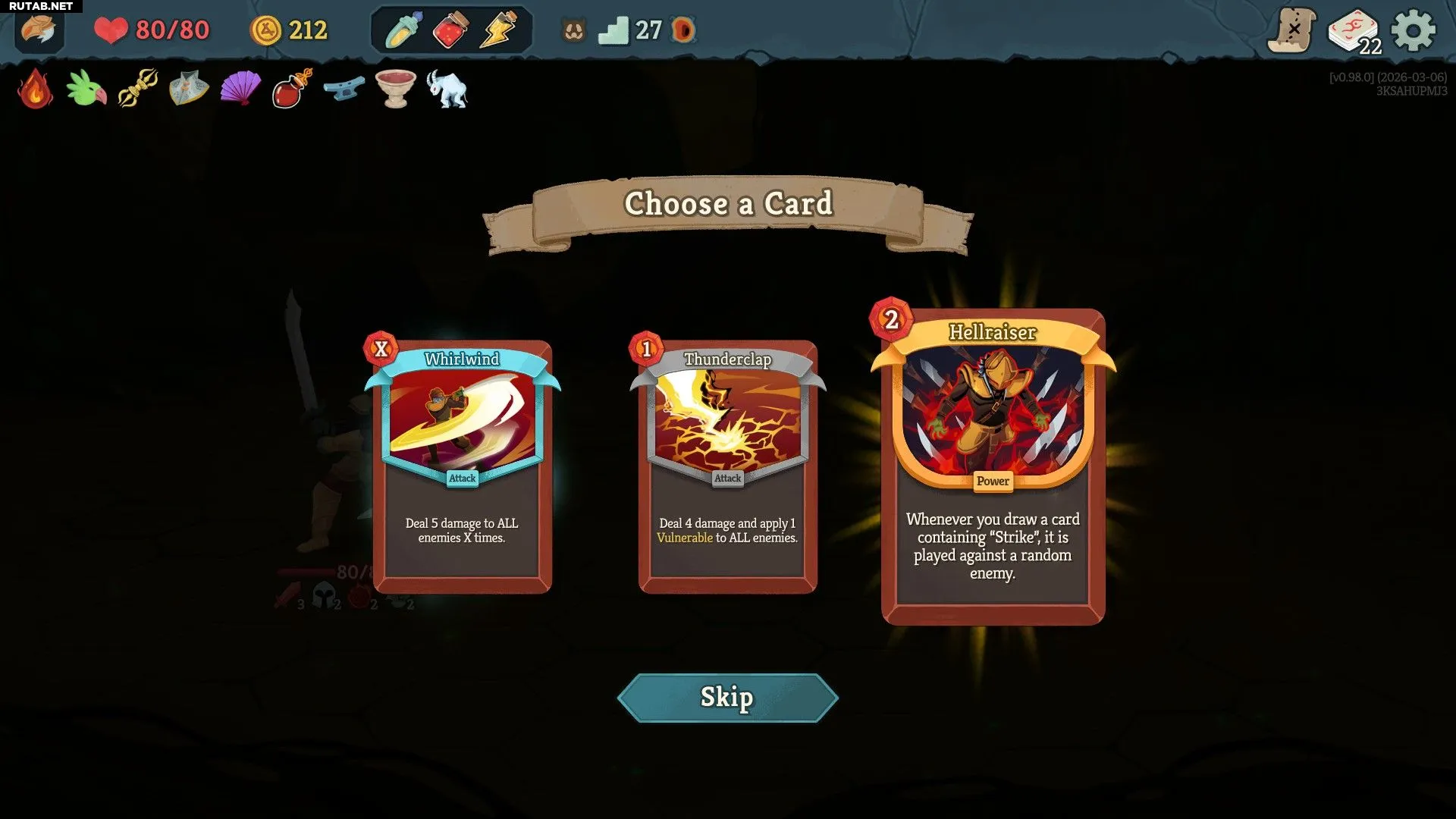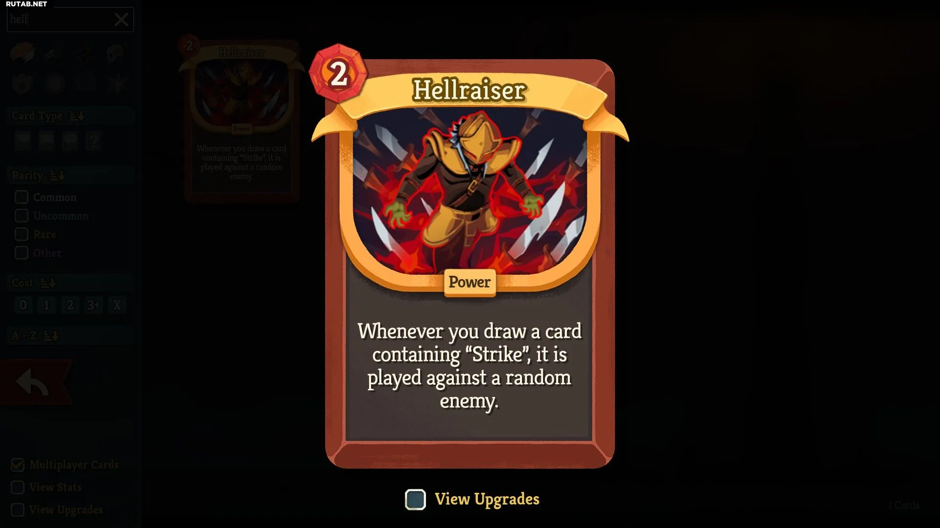 Силовая карта «Адский Заводила» автоматически разыгрывает любые карты «Удар», которые вы берёте. Комбинируйте её с колодой, полной «Ударов Поммелем», чтобы обрушить на врагов шквал бесплатного урона. Цепочки атак станут ещё длиннее, если вам повезёт вытянуть «Грабеж» или «Боевой Транс».