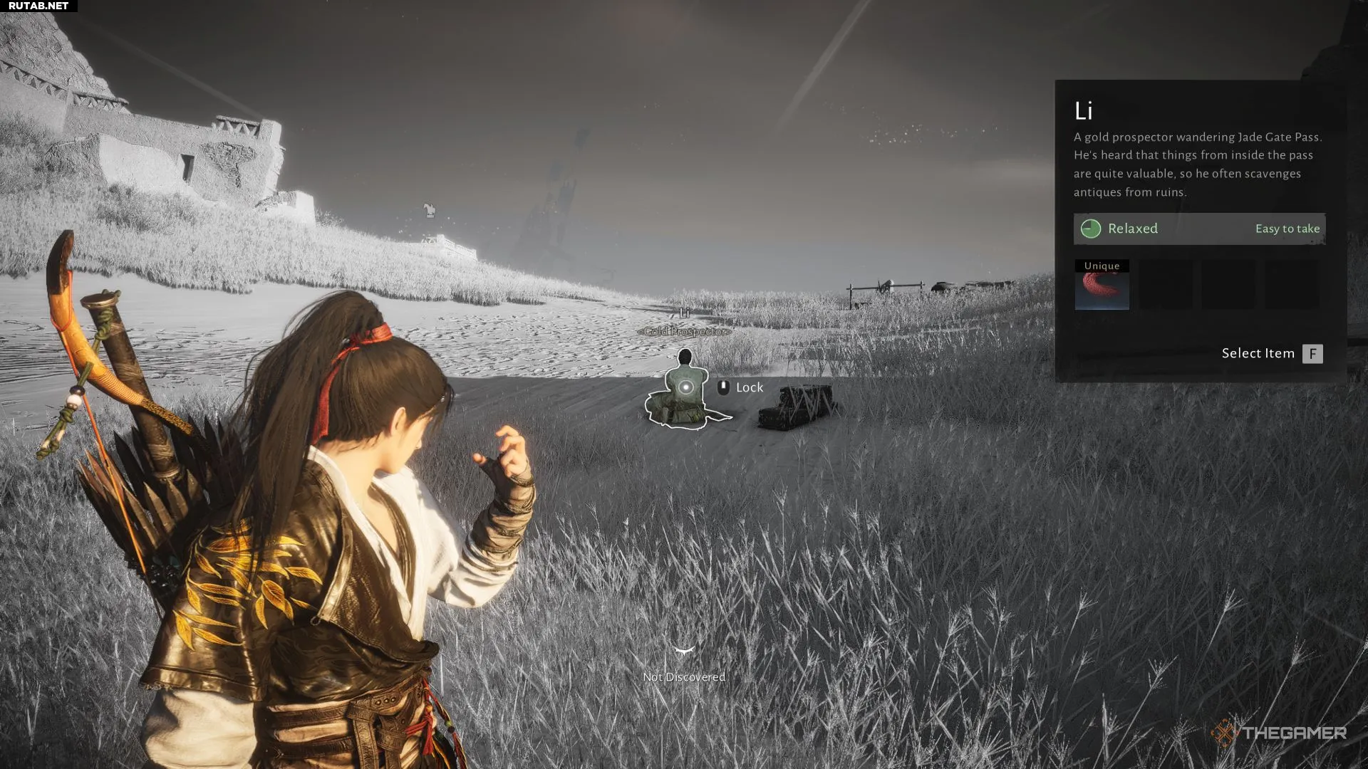 Ли расскажет о красных кистях, которые нужно собрать, но свою отдаст только некой Бабушке Пань. Уговоры не помогут. Чтобы получить кисть, отойдите от Ли на достаточное расстояние, встаньте у него за спиной и используйте мистическое умение «Небесная хватка» (Celestial Sieze), чтобы незаметно вытащить кисть из его кармана.