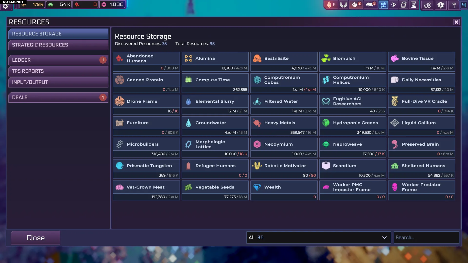- Ресурсы — открывает меню всех доступных ресурсов, включая возможность закрепить ресурсы в верхней части интерфейса, просмотреть лимиты хранилищ, а также увидеть потребление, производство или активные сделки, влияющие на ваши ресурсы.