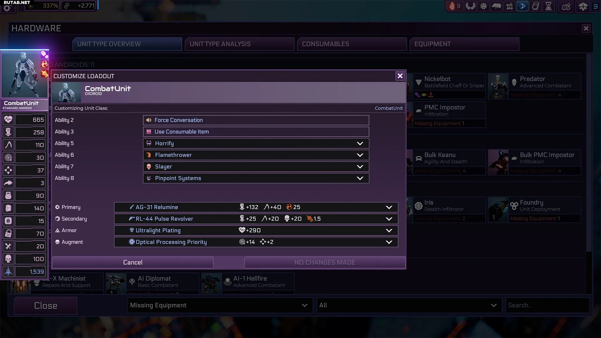 - Оборудование — просматривайте и анализируйте типы ваших юнитов, схемы экипировки и расходные предметы в вашем распоряжении.