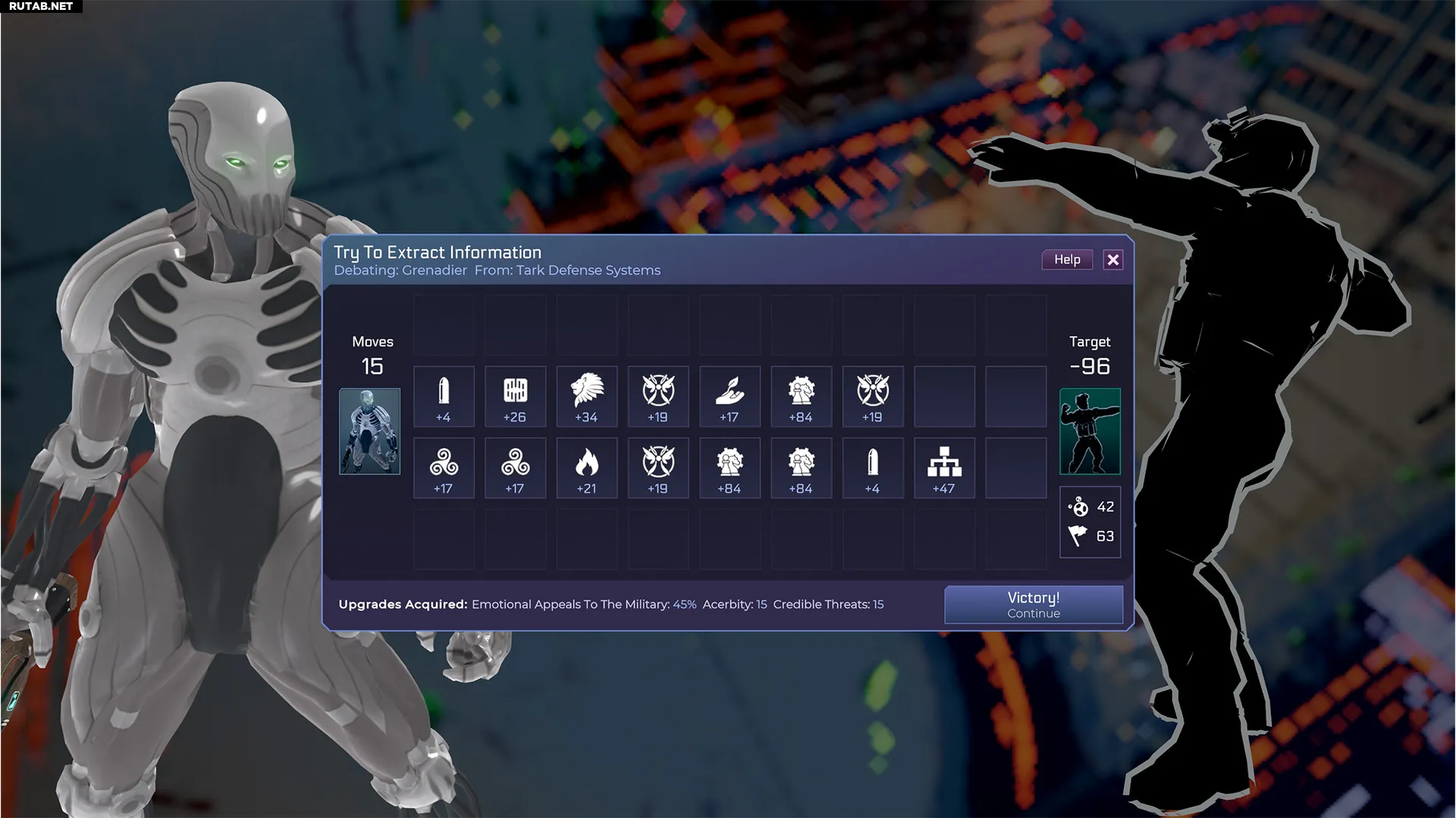 Дебаты позволяют сломить вражеского юнита морально, чтобы либо извлечь информацию, либо убедить его покинуть поле боя. Это относительно безопасный процесс, и вы можете перезапускать дебаты сколько угодно раз, пока не добьётесь успеха.