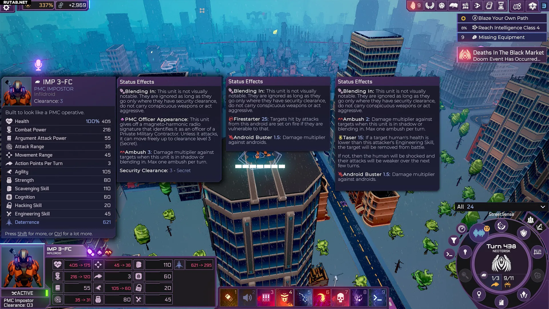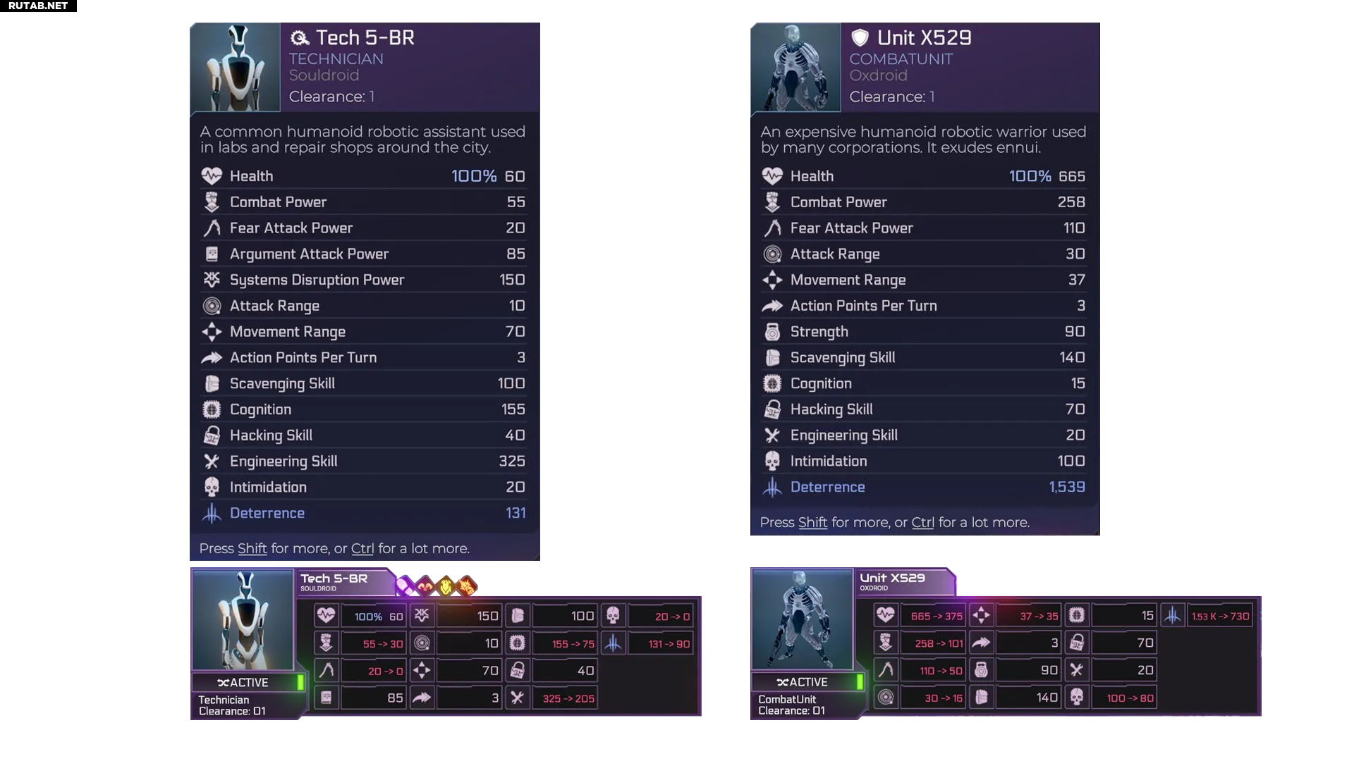 Каждый юнит под твоим командованием обладает рядом характеристик (от здоровья до боевой мощи, силы, запугивания и других), ограниченным количеством очков действия за ход и набором навыков, помогающих выполнять определённые задачи. Эти характеристики различаются в зависимости от типа андроида, а соответствующие технологические достижения и назначенное снаряжение могут их модифицировать. Некоторые задачи требуют минимального порога для конкретного навыка — изучи варианты экипировки, чтобы понять, можно ли с её помощью преодолеть требуемый порог андроидом, который уже близок к нему.